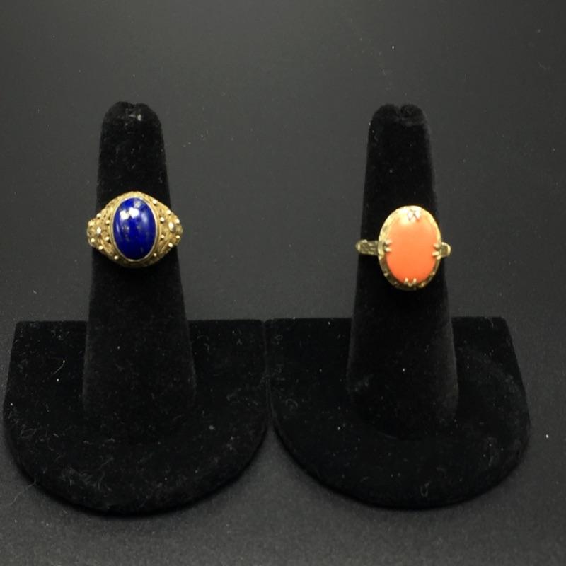 Pair of rings. Ring with blue stone is expandable in size and marked Silver and ring with orange stone is marked sterling.