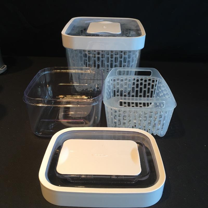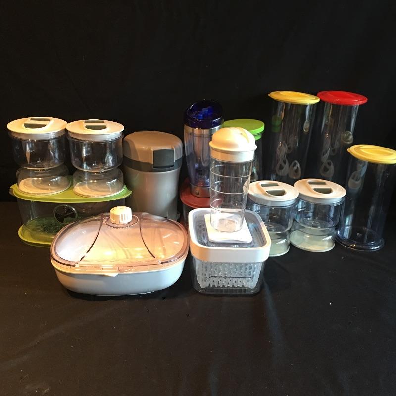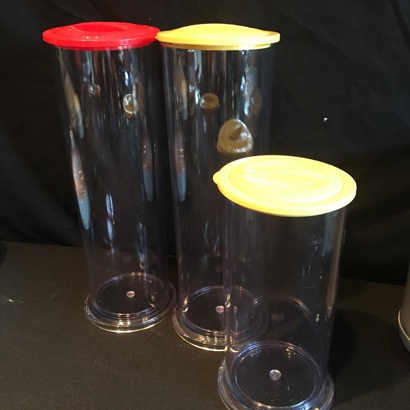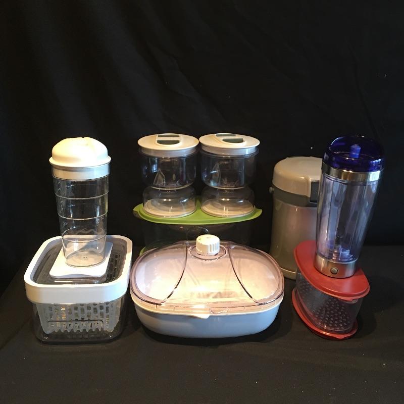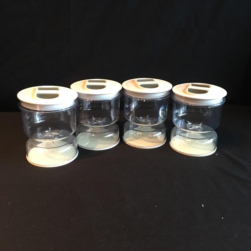 You don’t see this kind of storage in every kitchen. This array of uncommon storage includes four flip jars, one OXO jar with basket inside, Tiger insulated jar with two containers inside, cup with mixer on bottom, four tall storage jars and two Progressive containers. Tallest container measures 4.25”D x 12.5” tall.