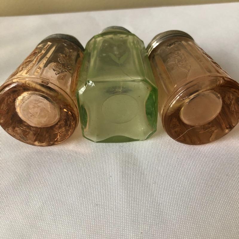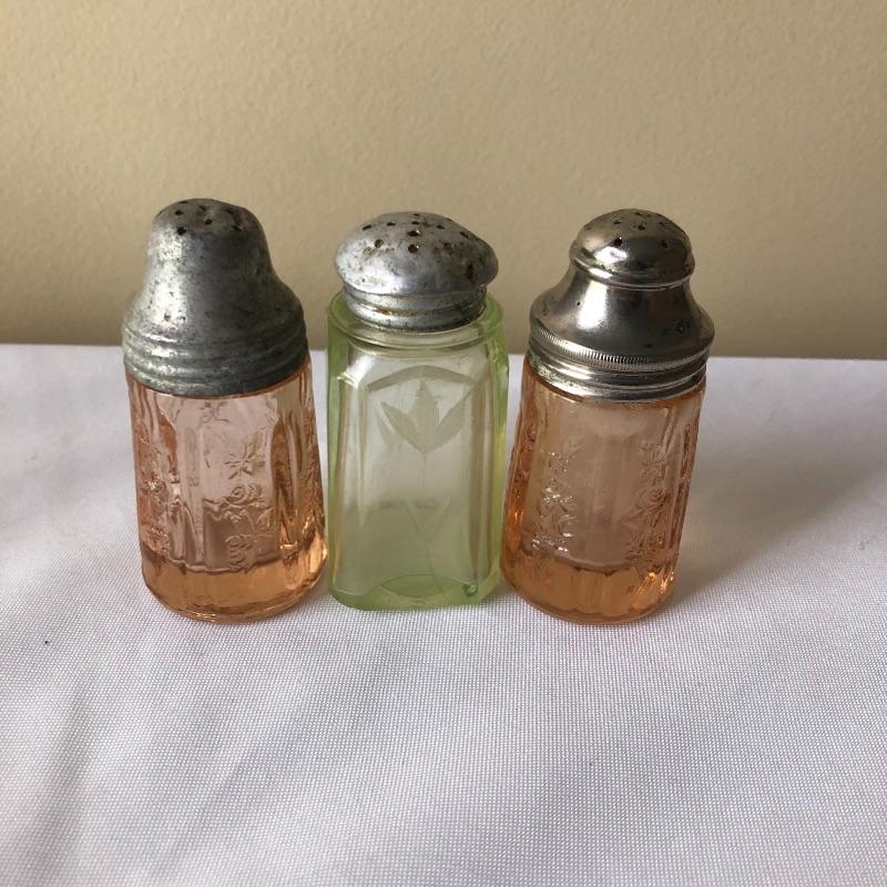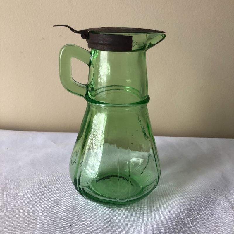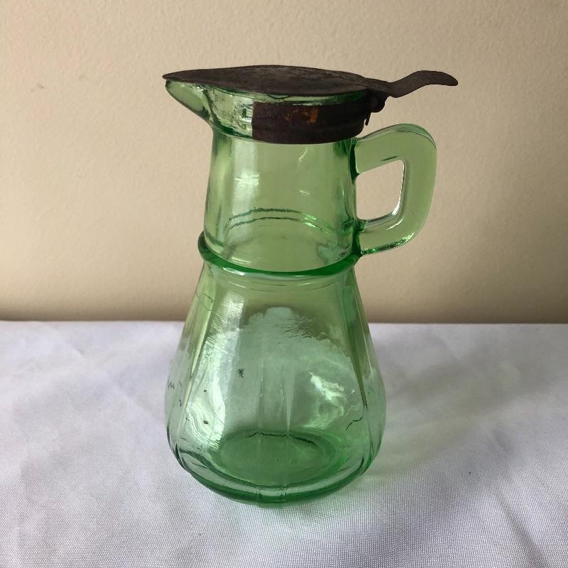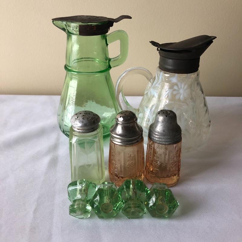 A nice array of glass for the collector or for decor at your Airbnb. Lot includes four green glass knobs, tangerine colored salt and pepper shakers, green shaker, green syrup bottle (likely Vaseline glass) and a clear syrup bottle with floral design. Largest bottle measures 3” x 4” x 6”.
