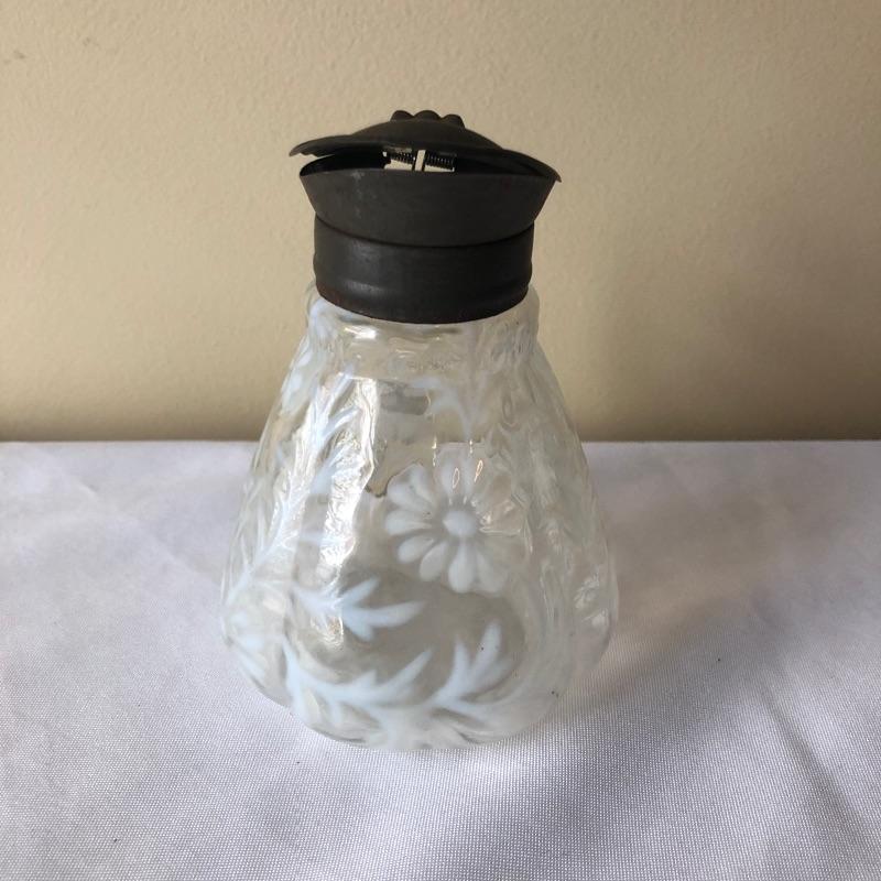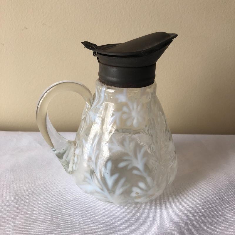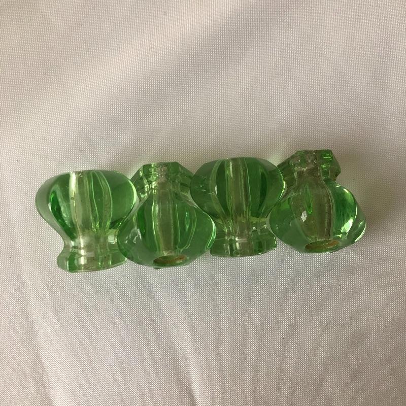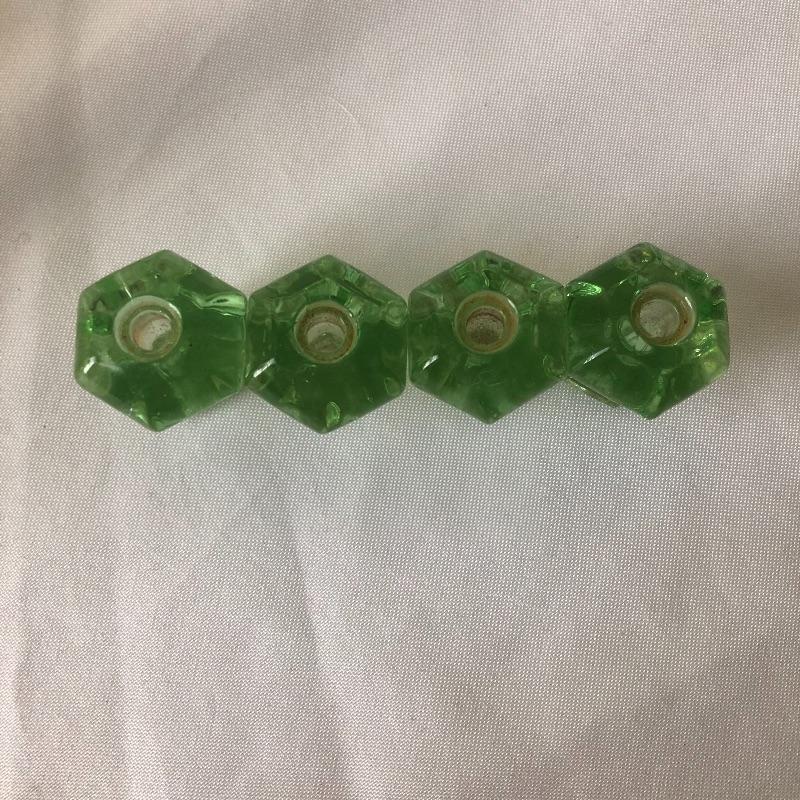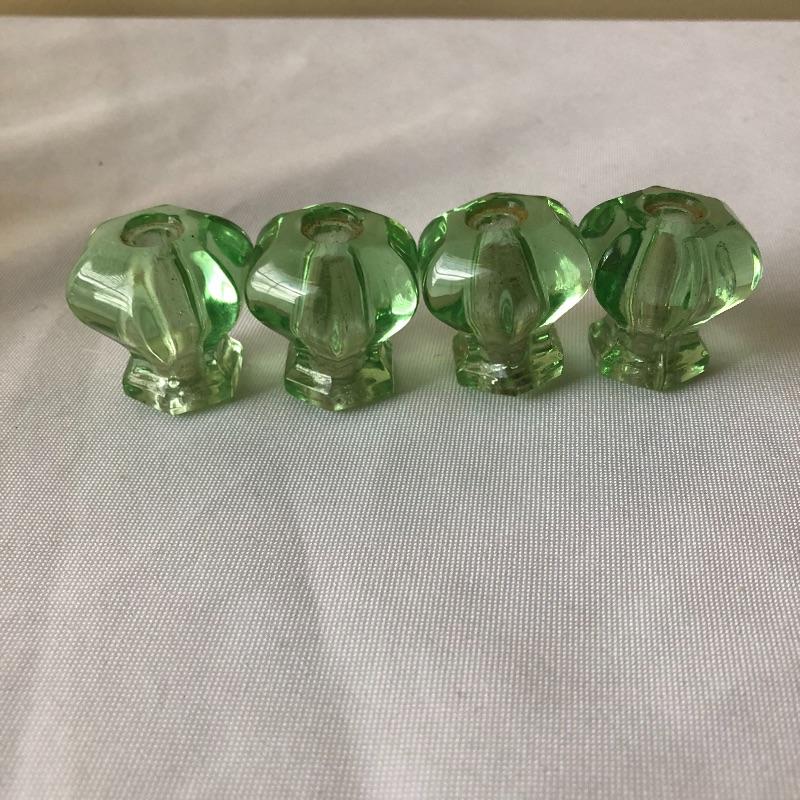 A nice array of glass for the collector or for decor at your Airbnb. Lot includes four green glass knobs, tangerine colored salt and pepper shakers, green shaker, green syrup bottle (likely Vaseline glass) and a clear syrup bottle with floral design. Largest bottle measures 3” x 4” x 6”.