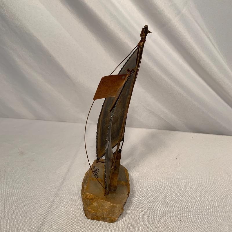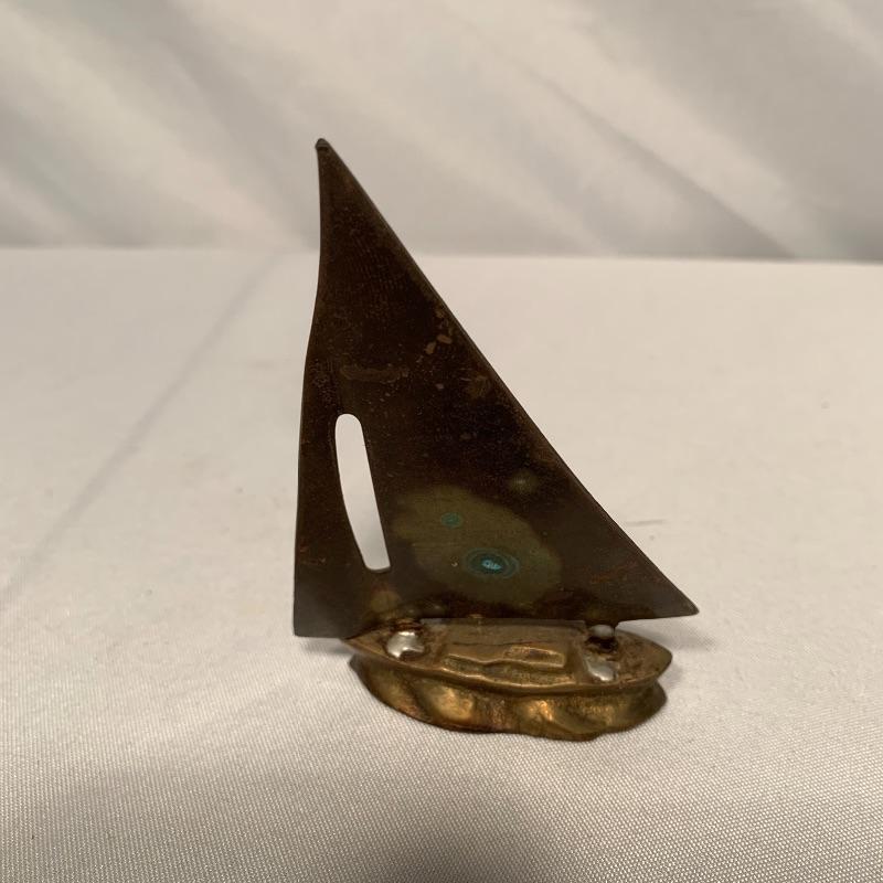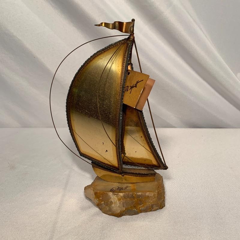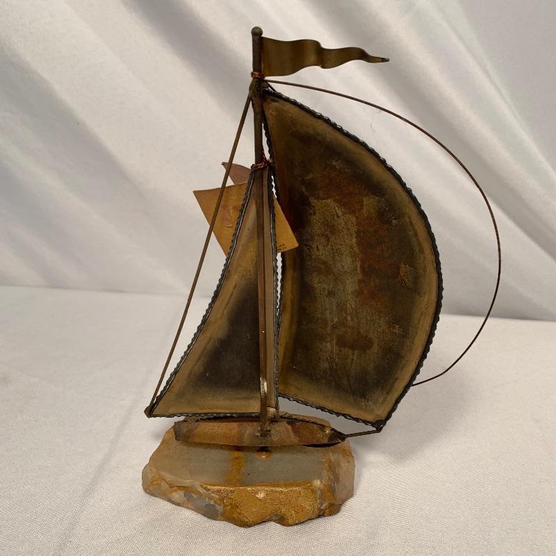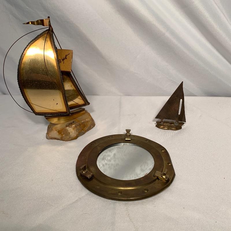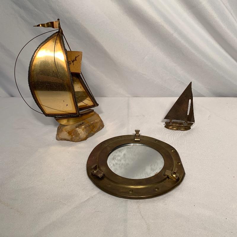Lot 102 consists of these neat vintage brass nautical collectibles. The larger sailboat is an exquisite brass and stone piece made by Demott that depicts a ship at full sail and stands 10” tall. The smaller sail boat is an adorable brass piece that stands 4” tall. The port hole mirror is 7” across and has a dent on one side and also rubber washer that holds the mirror in place has deteriorated. However this little mirror is still a great vintage display item. Shipping available.