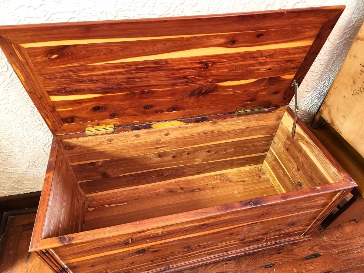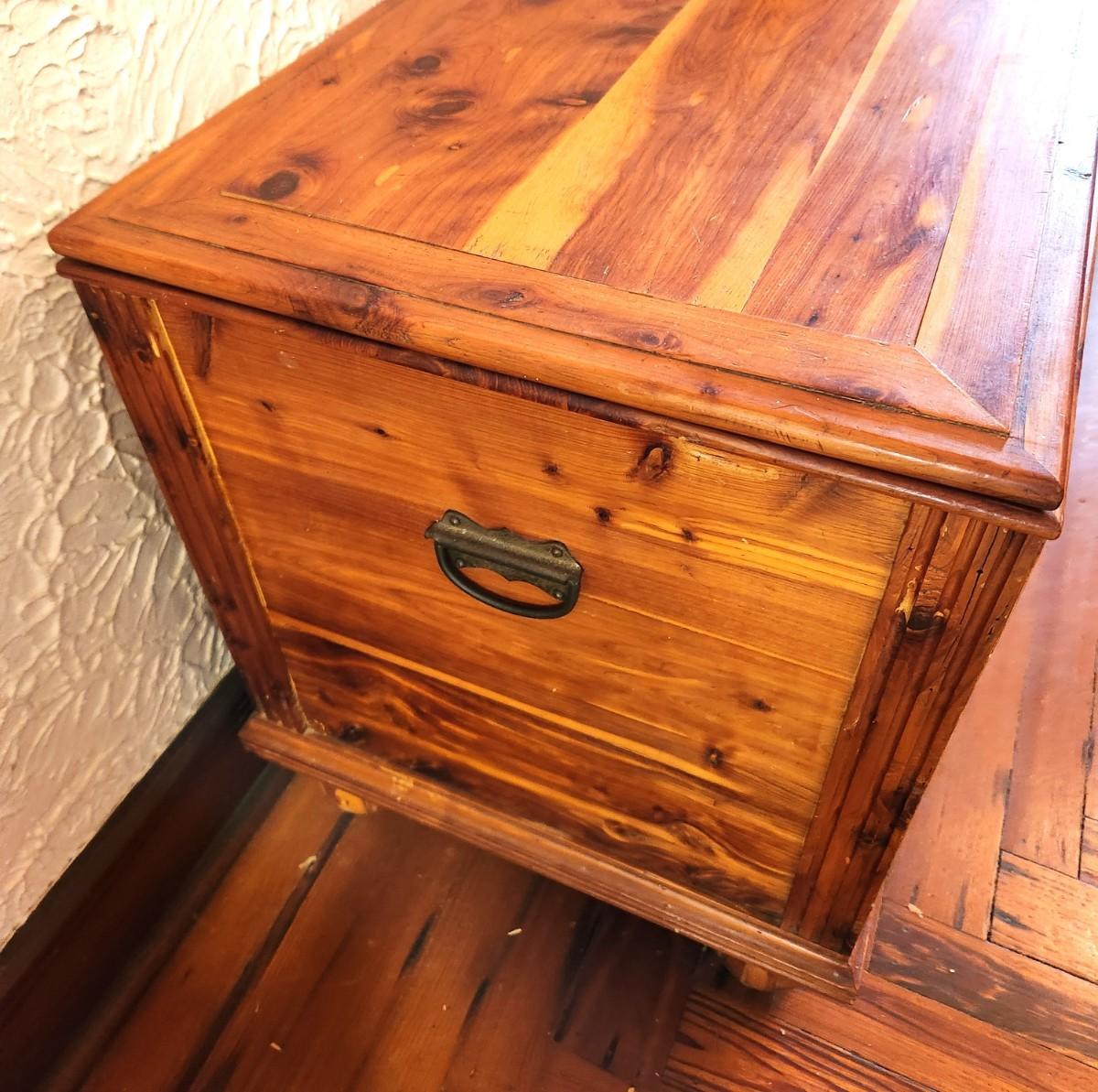 Vintage Cedar Chest - lots of storage here - clean - handles on side - Ball/Bun feet - no key. Note Damage on top. 18" deep, 42" across, 23" tall.