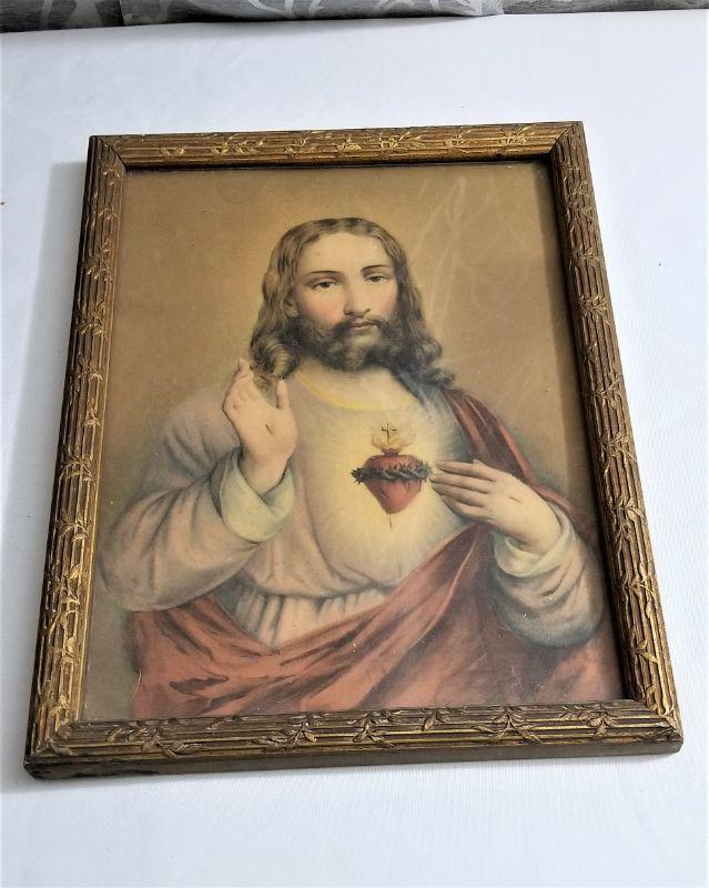 Good antique condition - Sacred Heart of Jesus print in vintage frame. Measures 10" x 13".