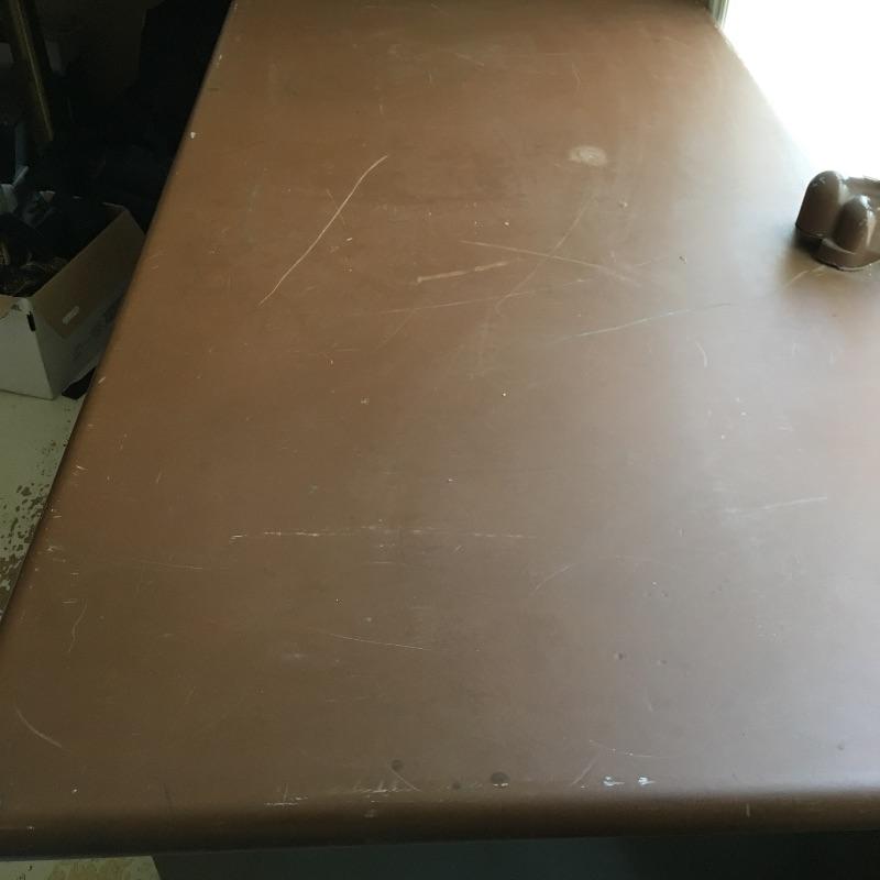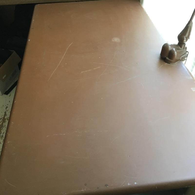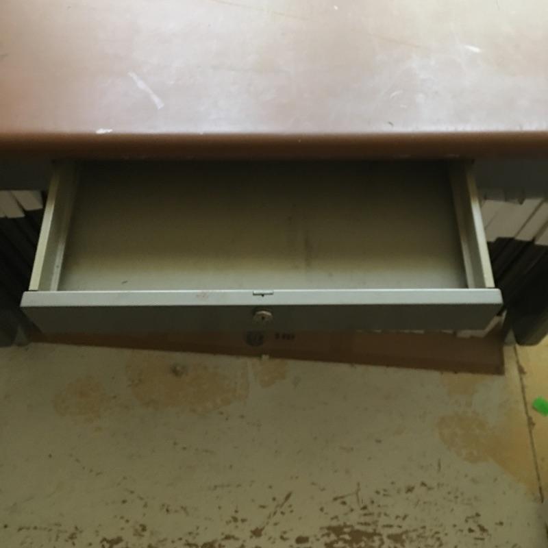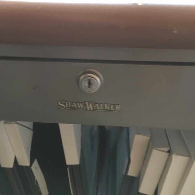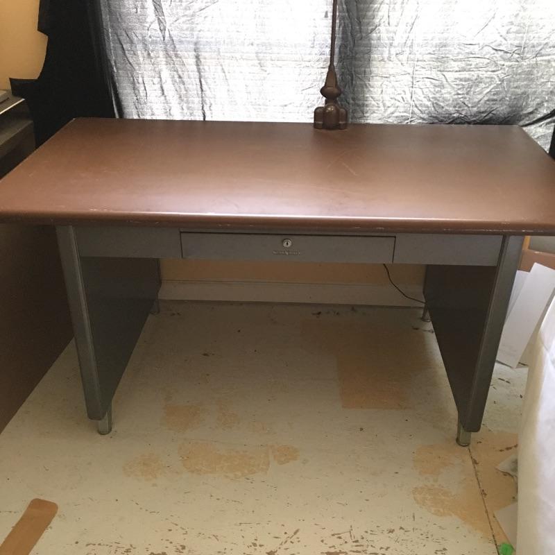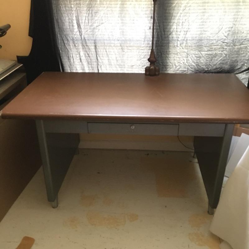 Vintage Shaw Walker desk with one drawer. Beautiful Shaw Walker desk in great shape, just has a few scratches on the top and is missing key - see pictures. Lot Only includes desk not contents underneath or light on top. Desk measures 31.5” x 59” x 39”.
