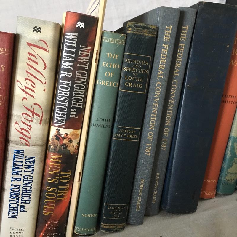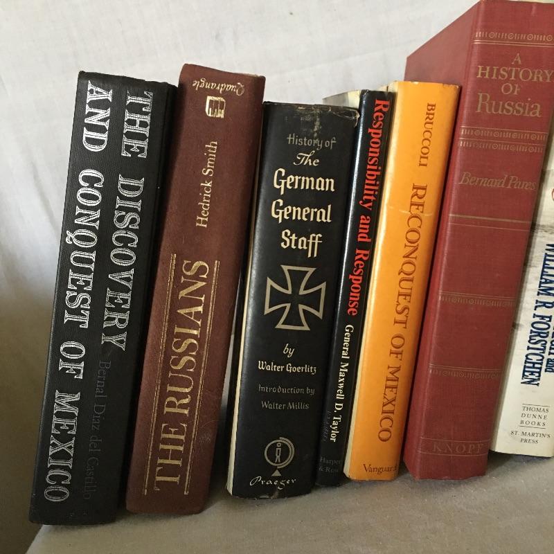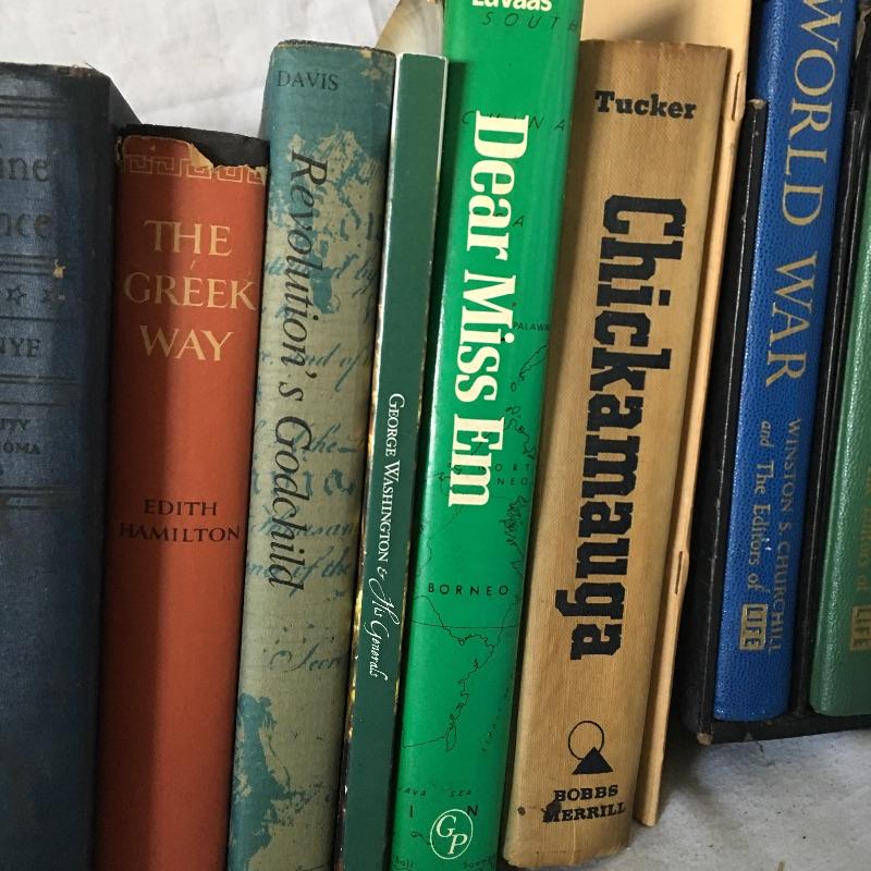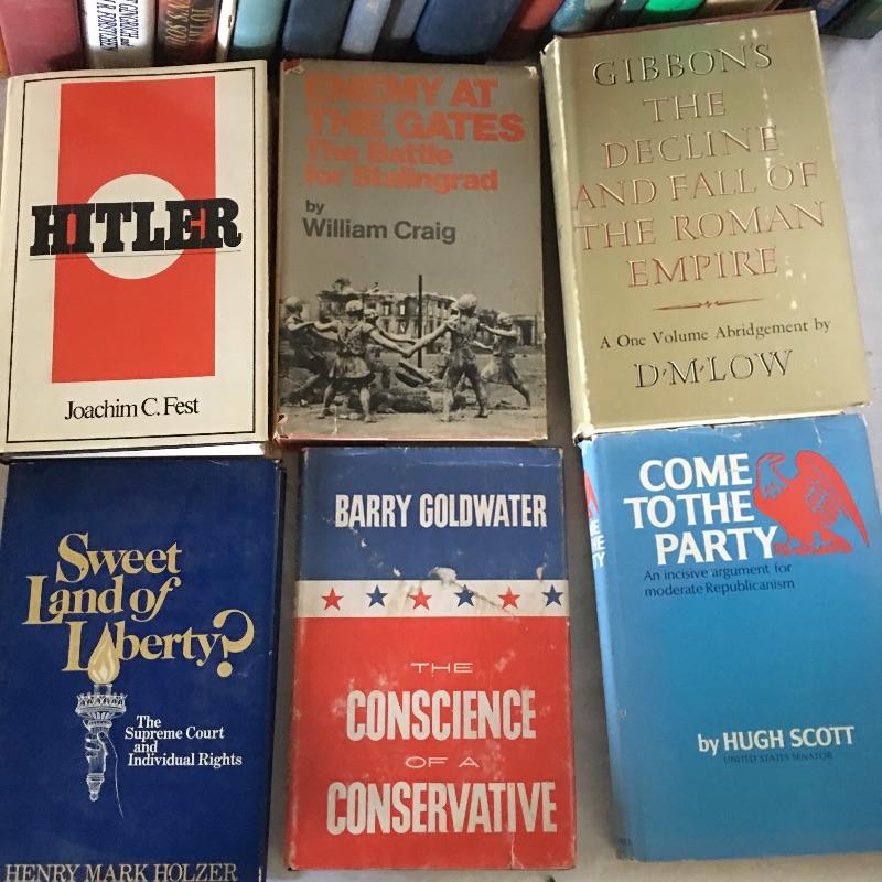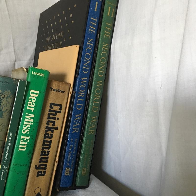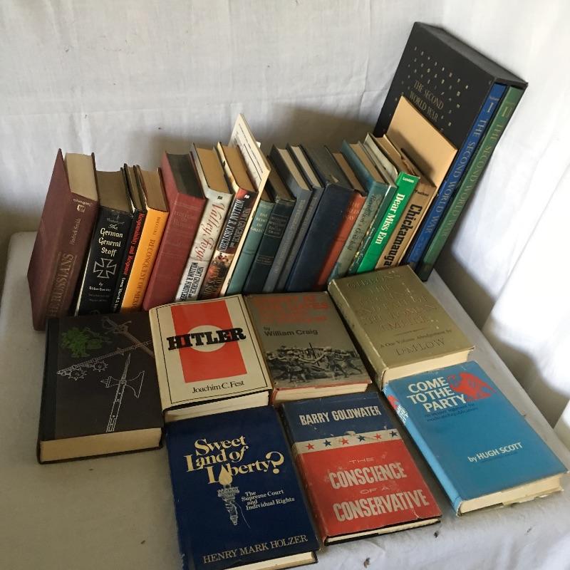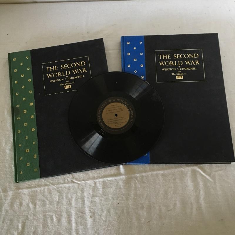 Books about war and politics includes Winston Churchill’s The Second World War Two volume set with LP of war speeches, Hitler, Chickamauga, Carbine and Lance and more, see pictures.