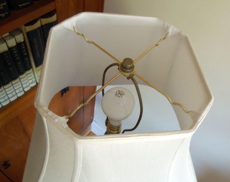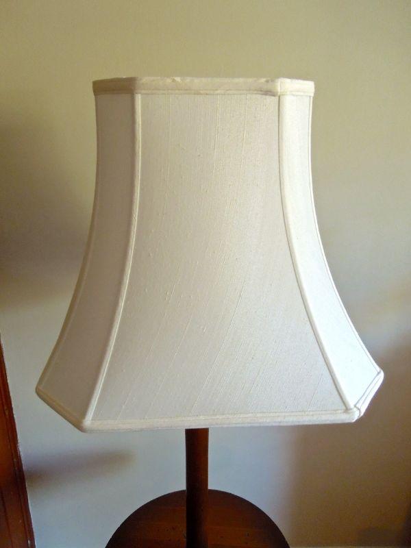 56" tall lamp made of solid wood. Dark stained pine with cloth shade. Base is 15" wide. Books sold separately.