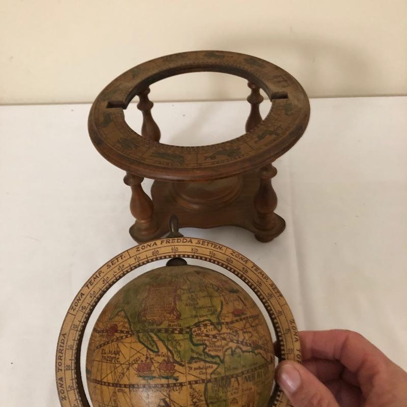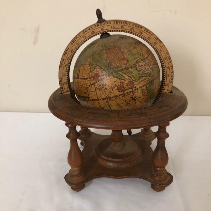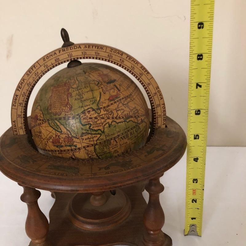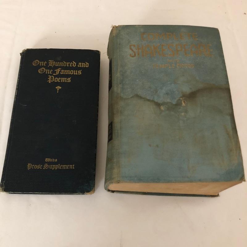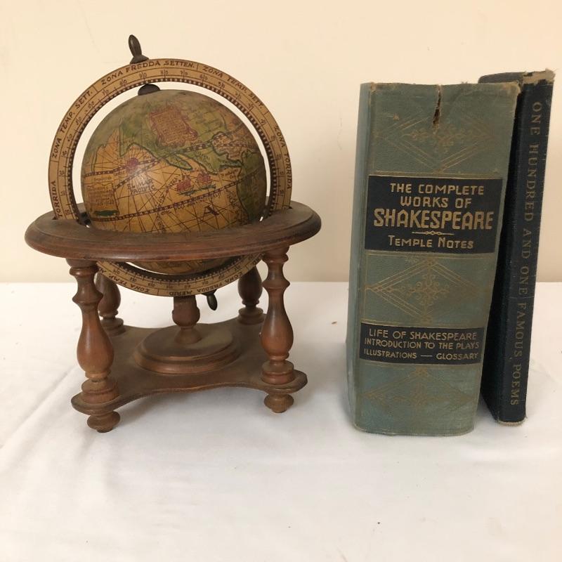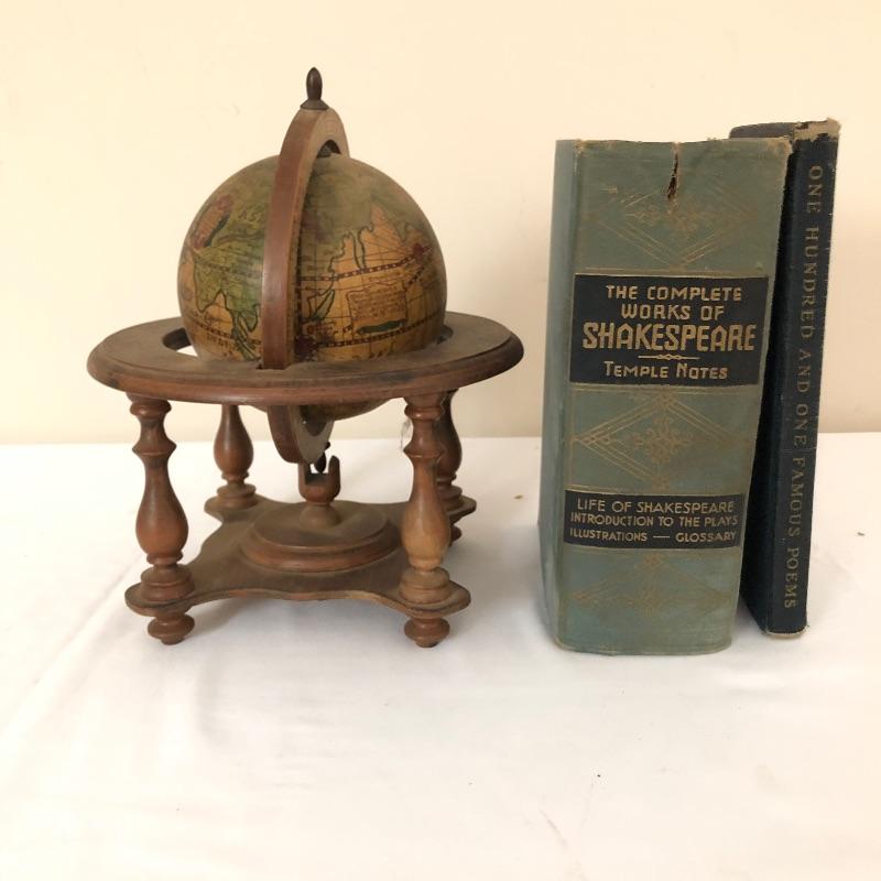 This vintage lot includes a small wooden globe and two antique books. The wooden globe is precious with the zodiac signs around the rim of the base. Both books are antique with the complete Shakespeare with temple notes and 101 famous poems. Note that the Shakespeare book does have some water damage to the front cover but the book itself appears to be in decent aged condition.