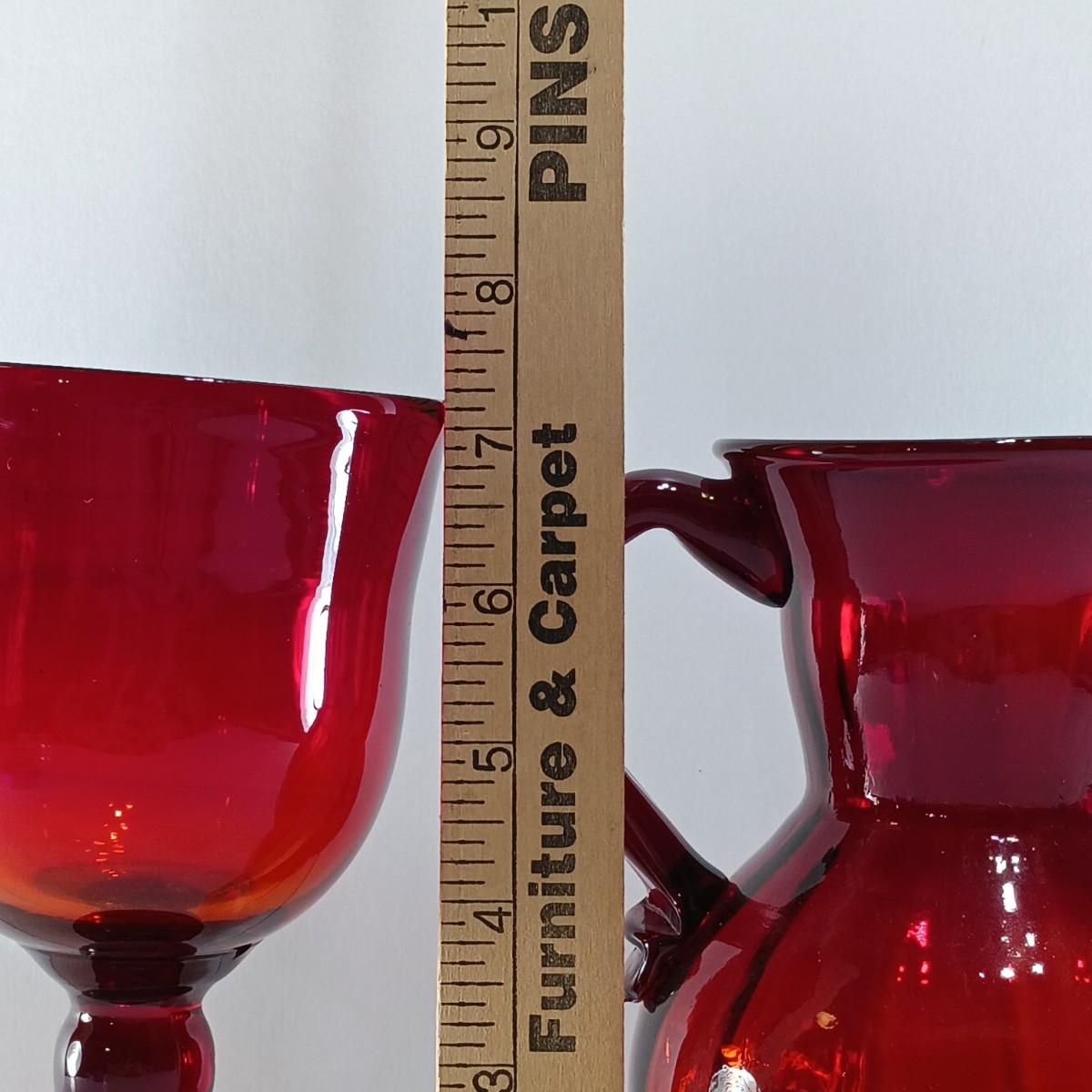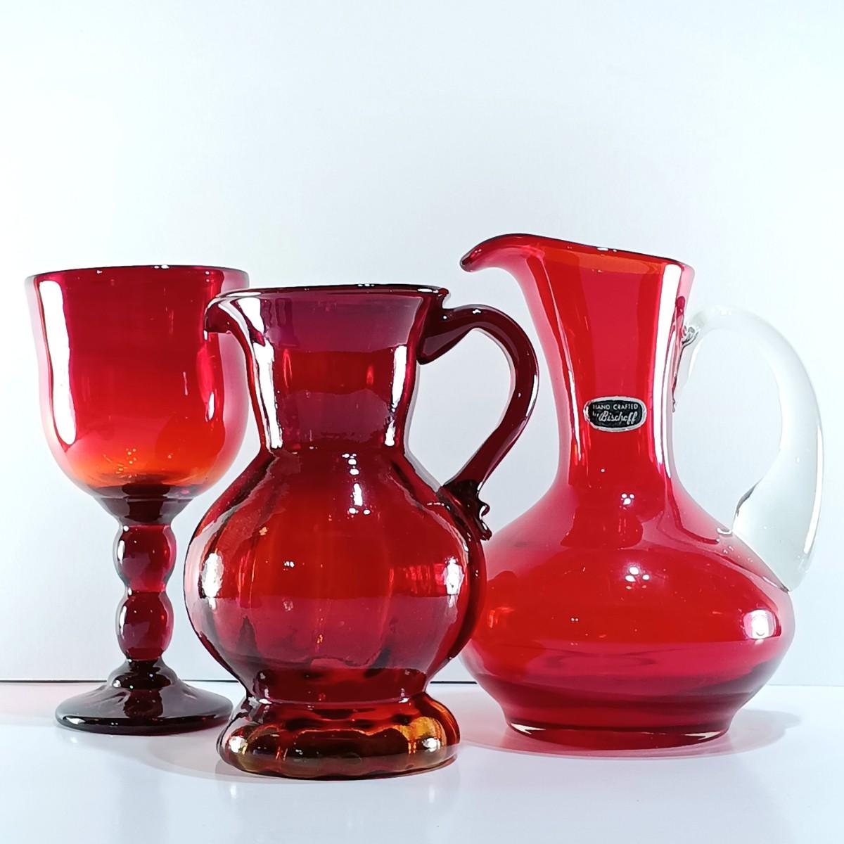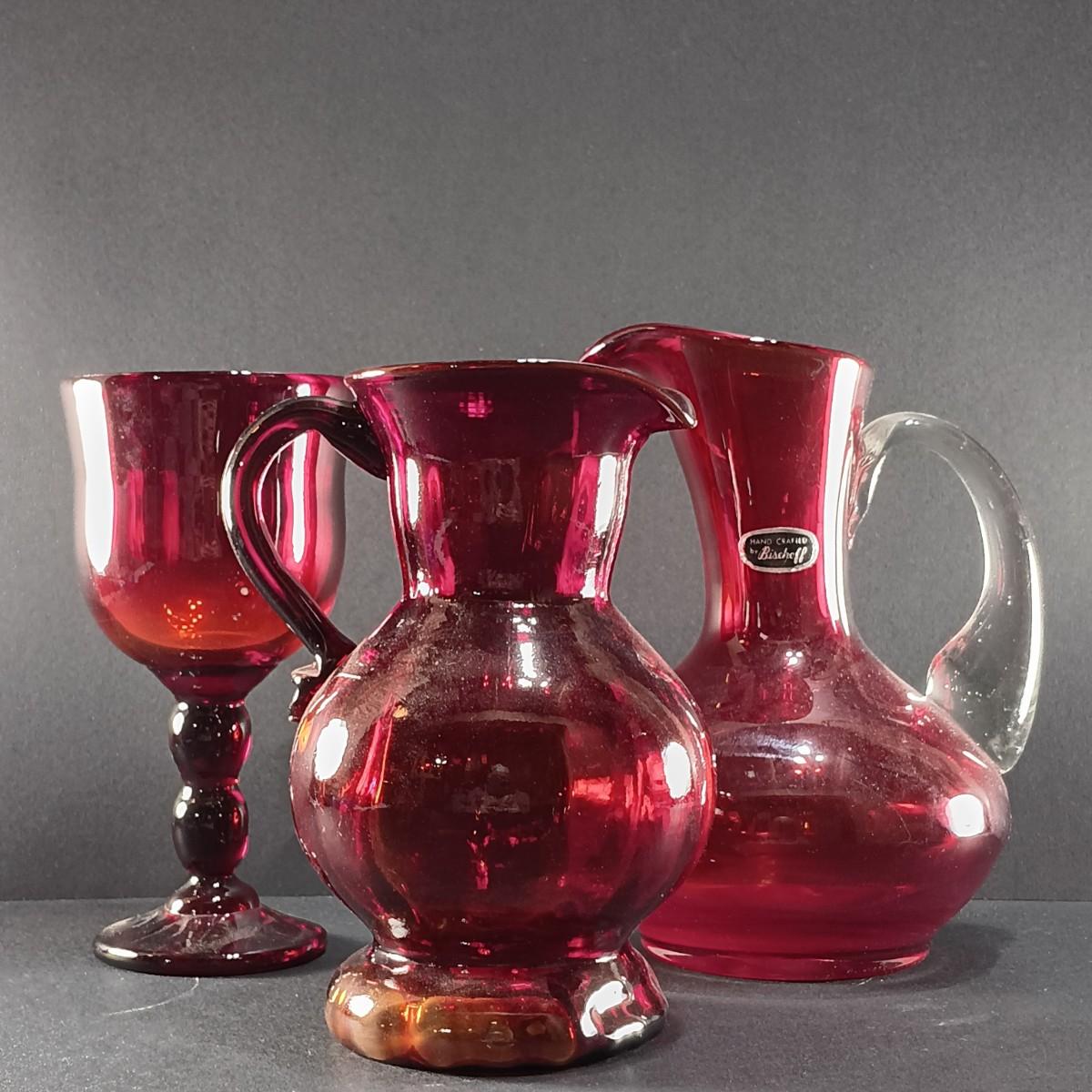 LOT 4: MCM Bischoff Ruby Red Glass Pitcher w/ Art Glass Goblet & More
