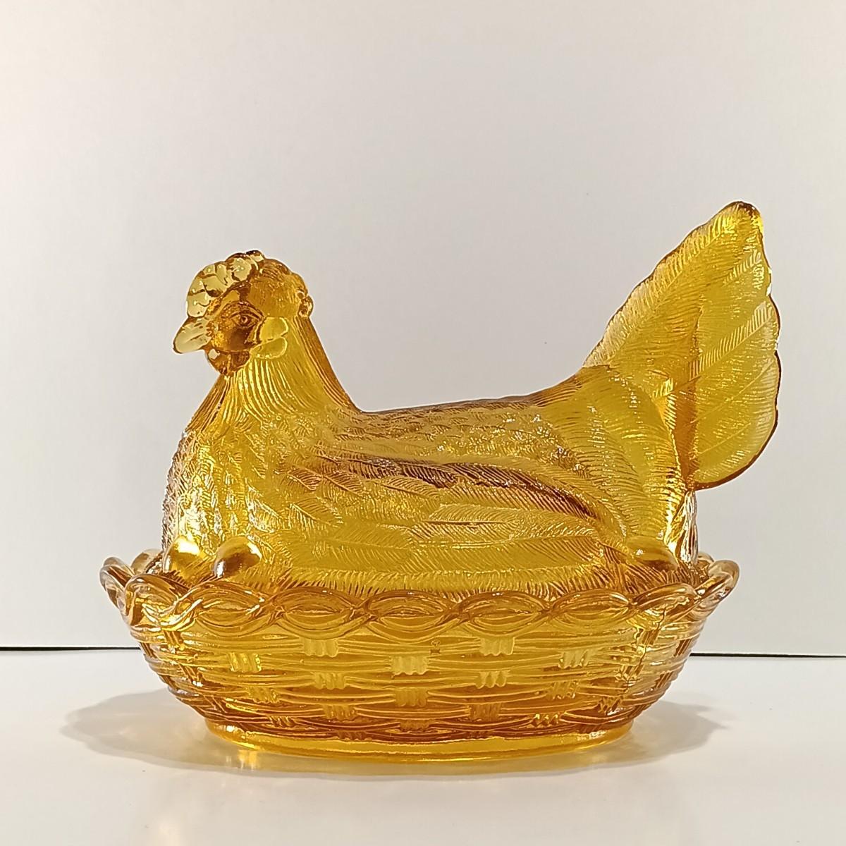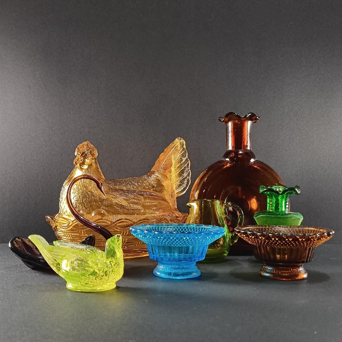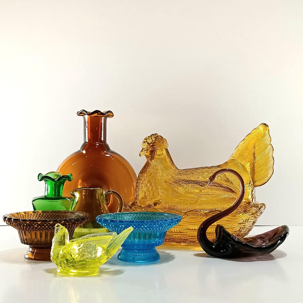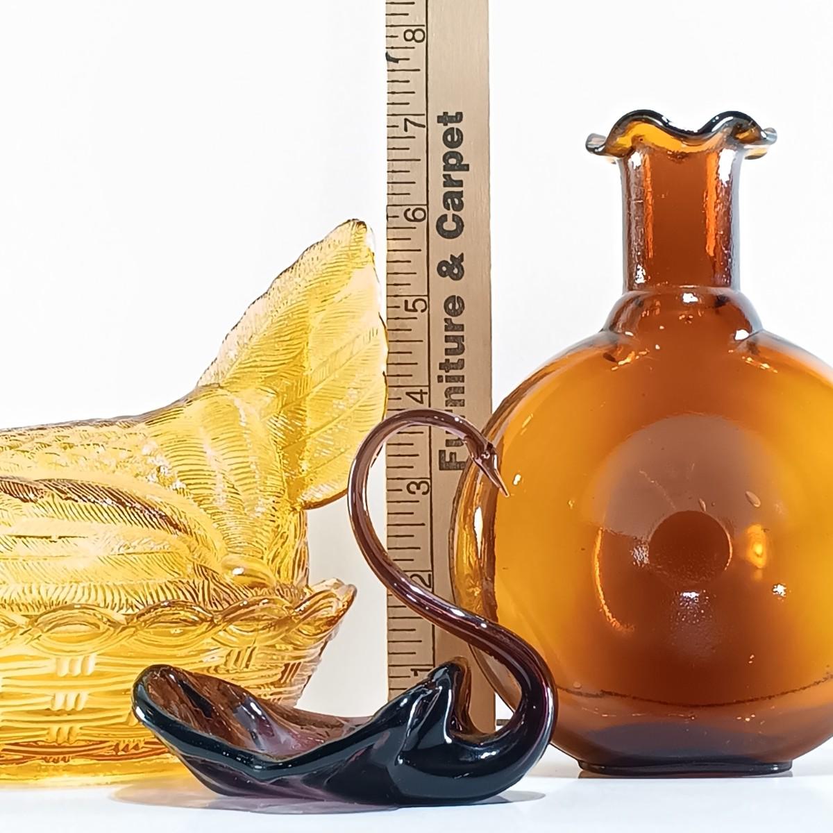 LOT 9: Uranium Glass Bird With Berry with Amber Hen on Nest, Amethyst Swan and More