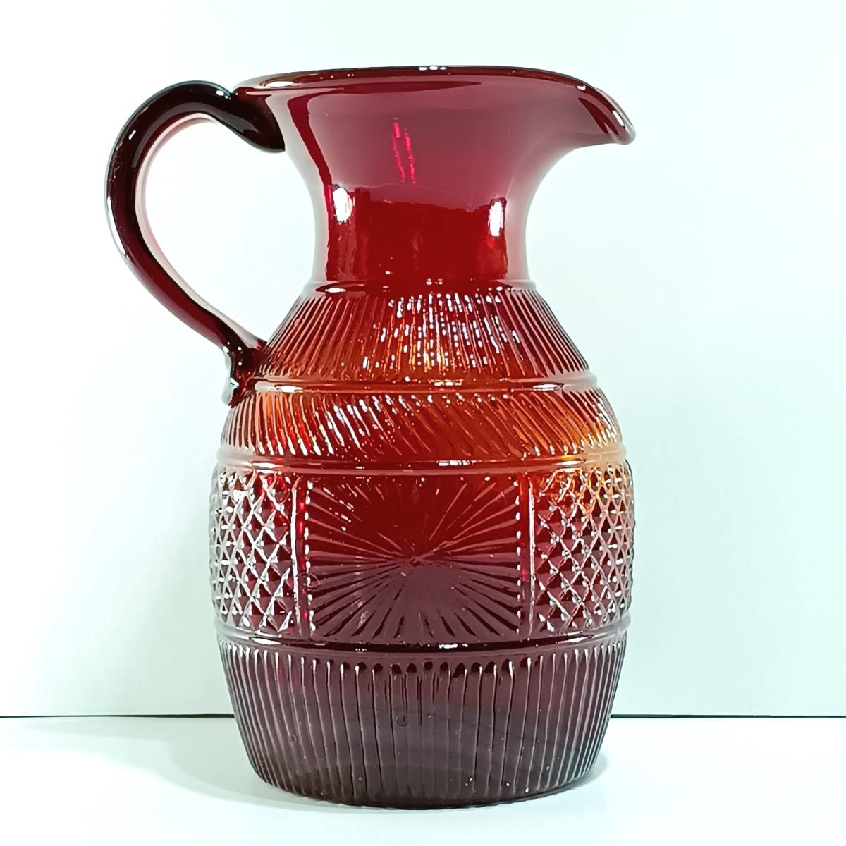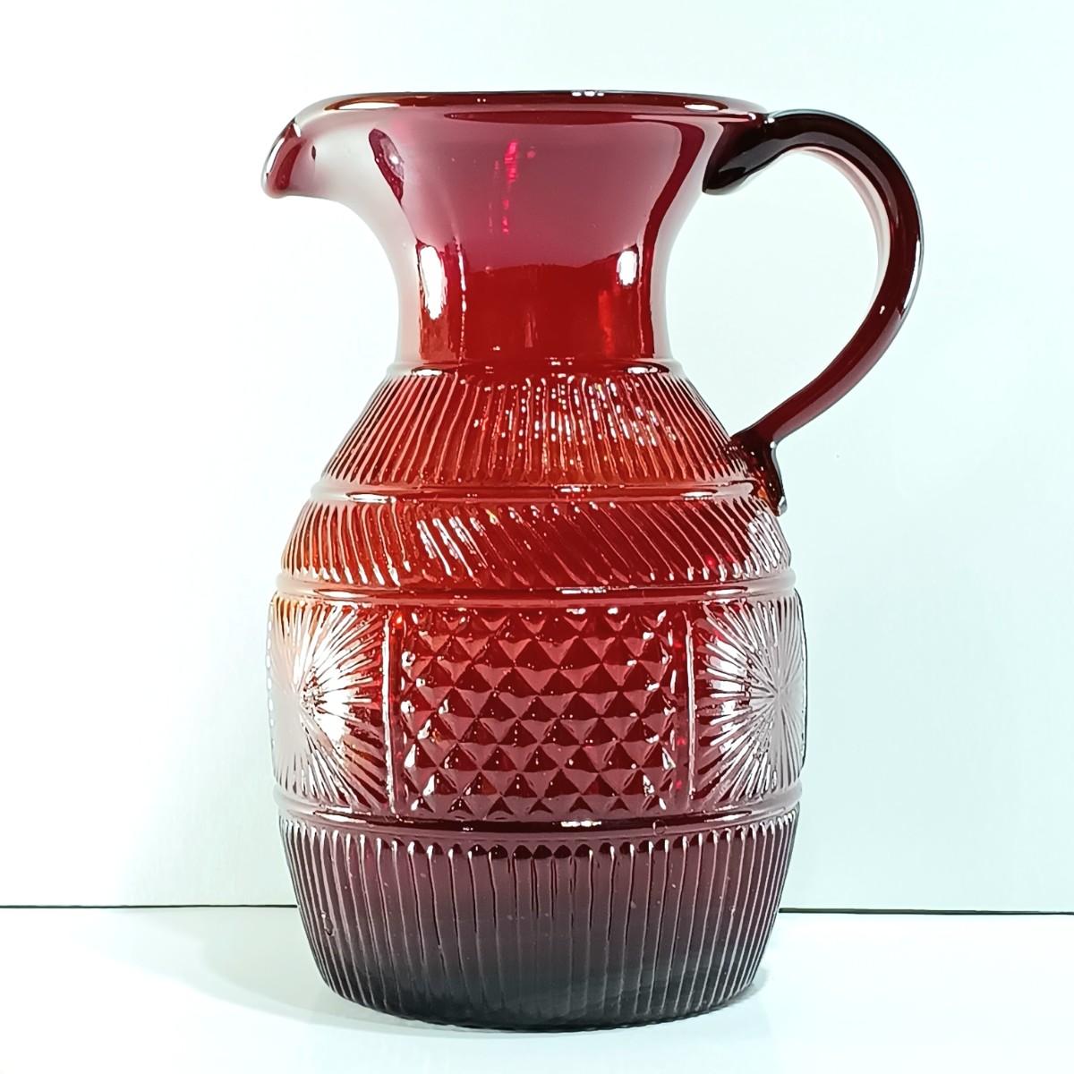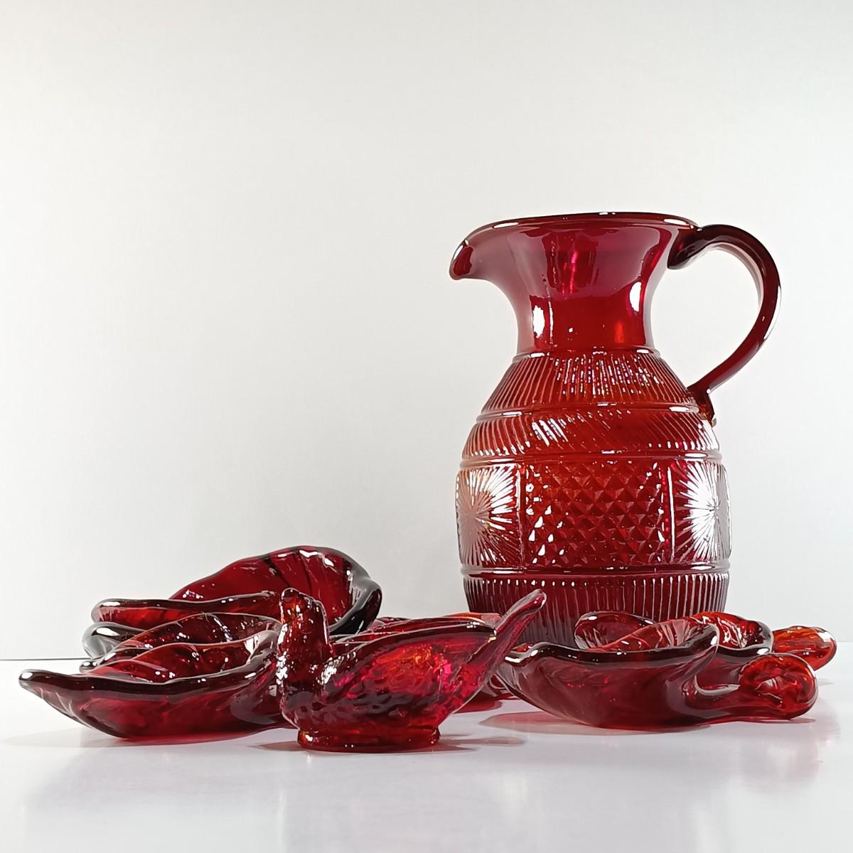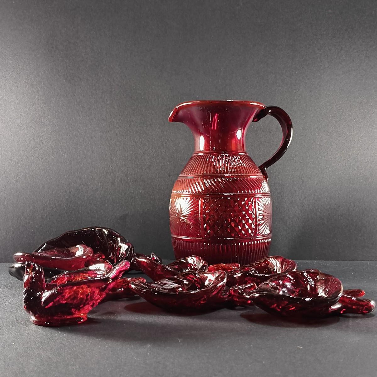 LOT 10: Amberina Pitcher w/ Bird With Berry and Ruby Glass Cornucopias