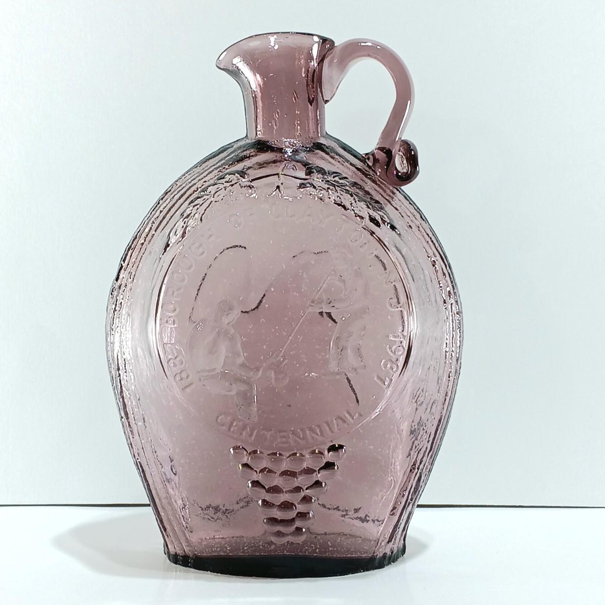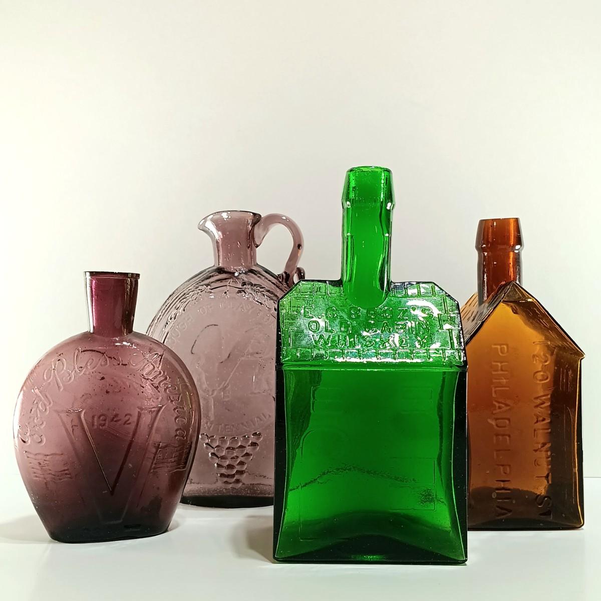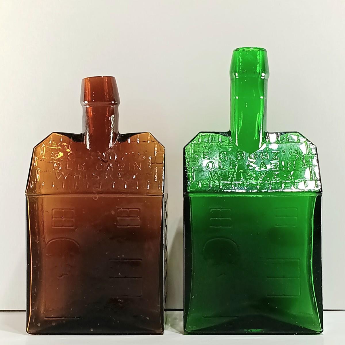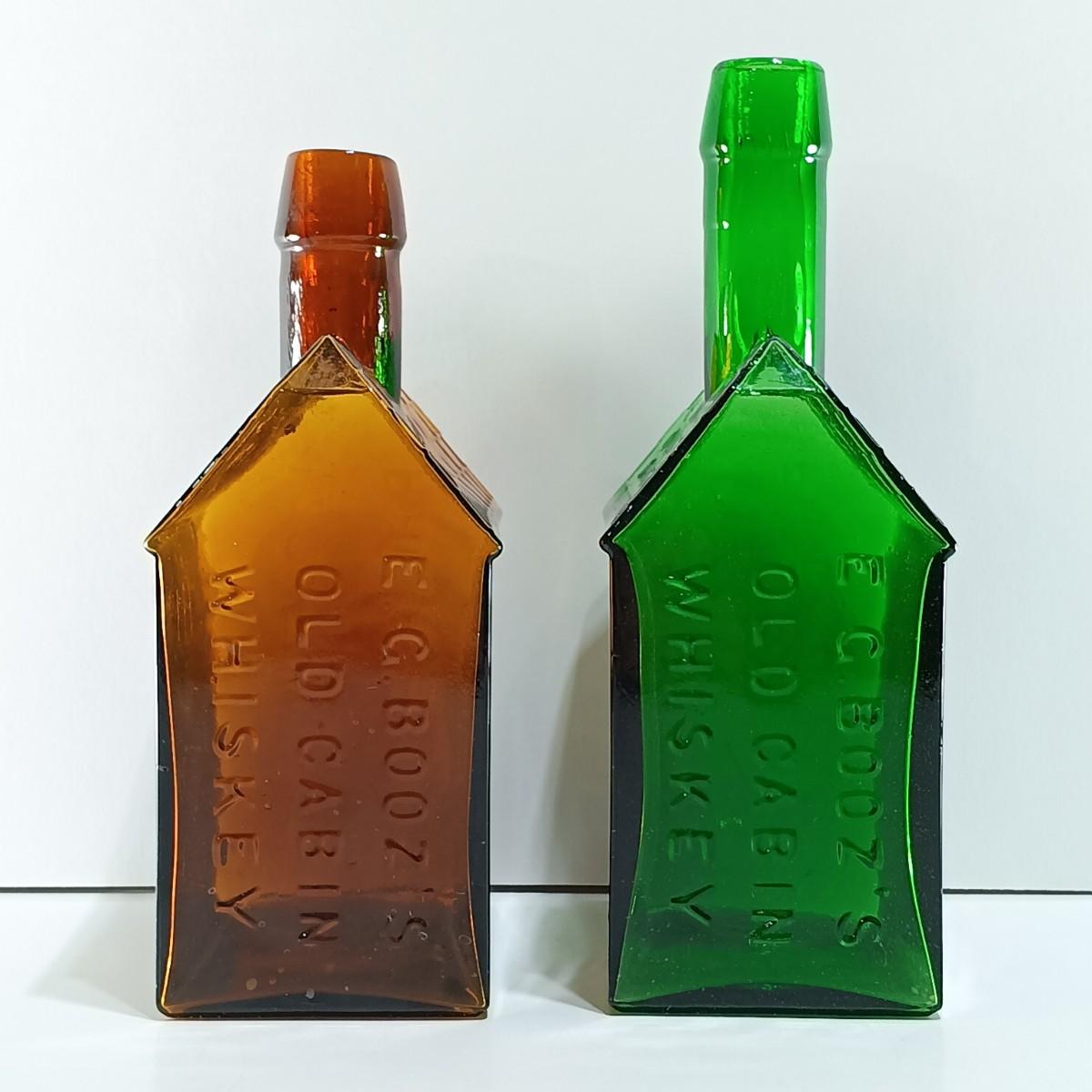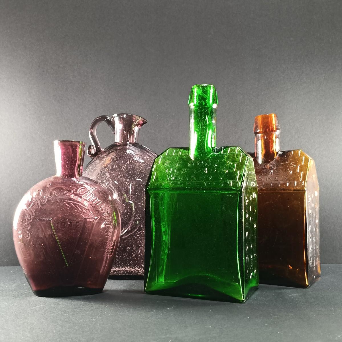 LOT 12: Green and Amber E.G. Booz's Old Cabin Whiskey Bottles with Amethyst MacArthur Victory Bottle & Borough of Clayton Handled Jug