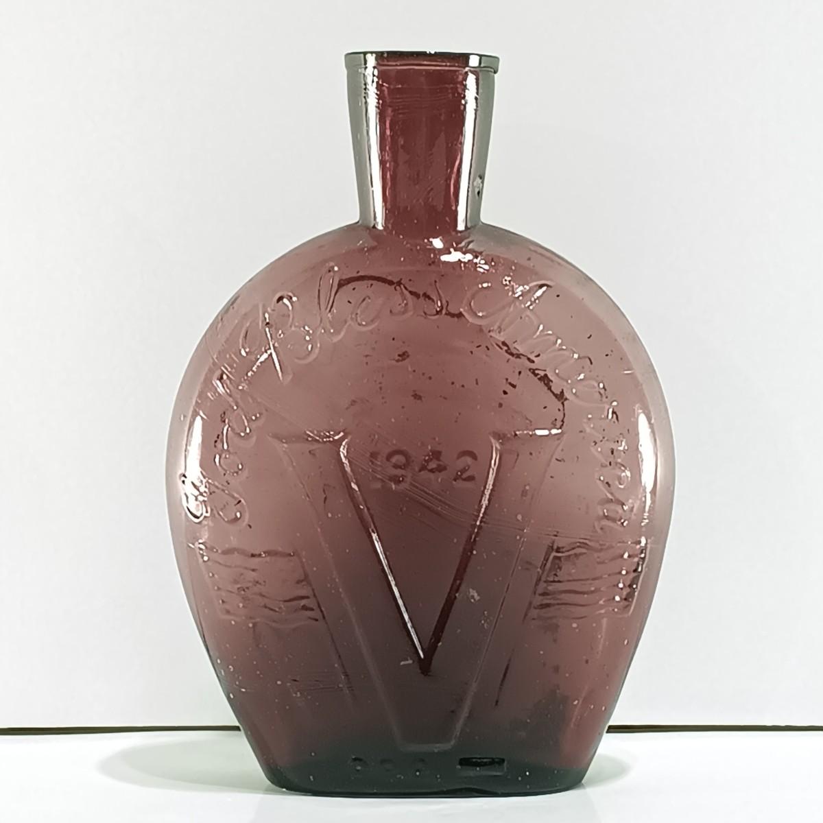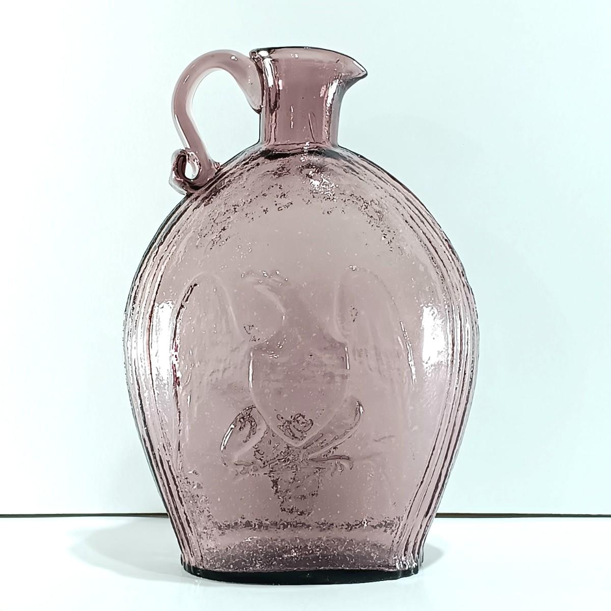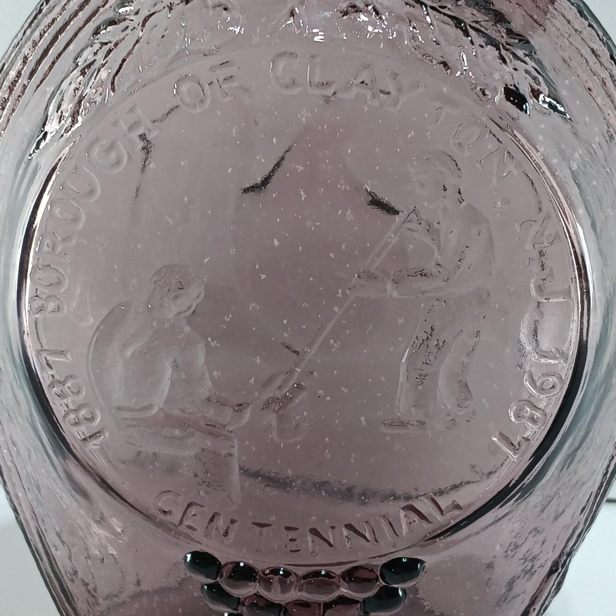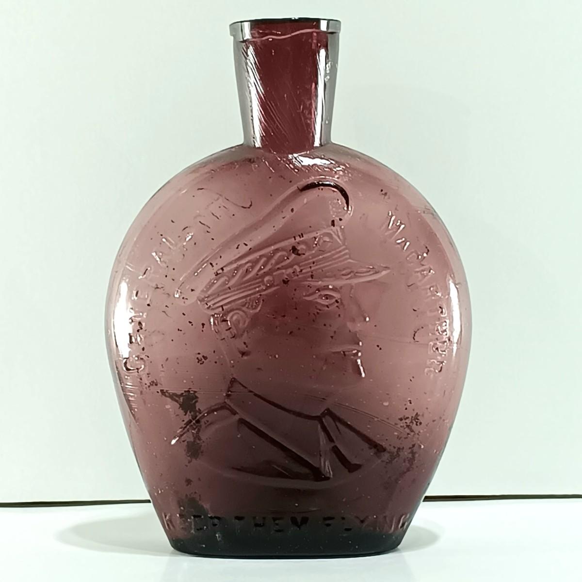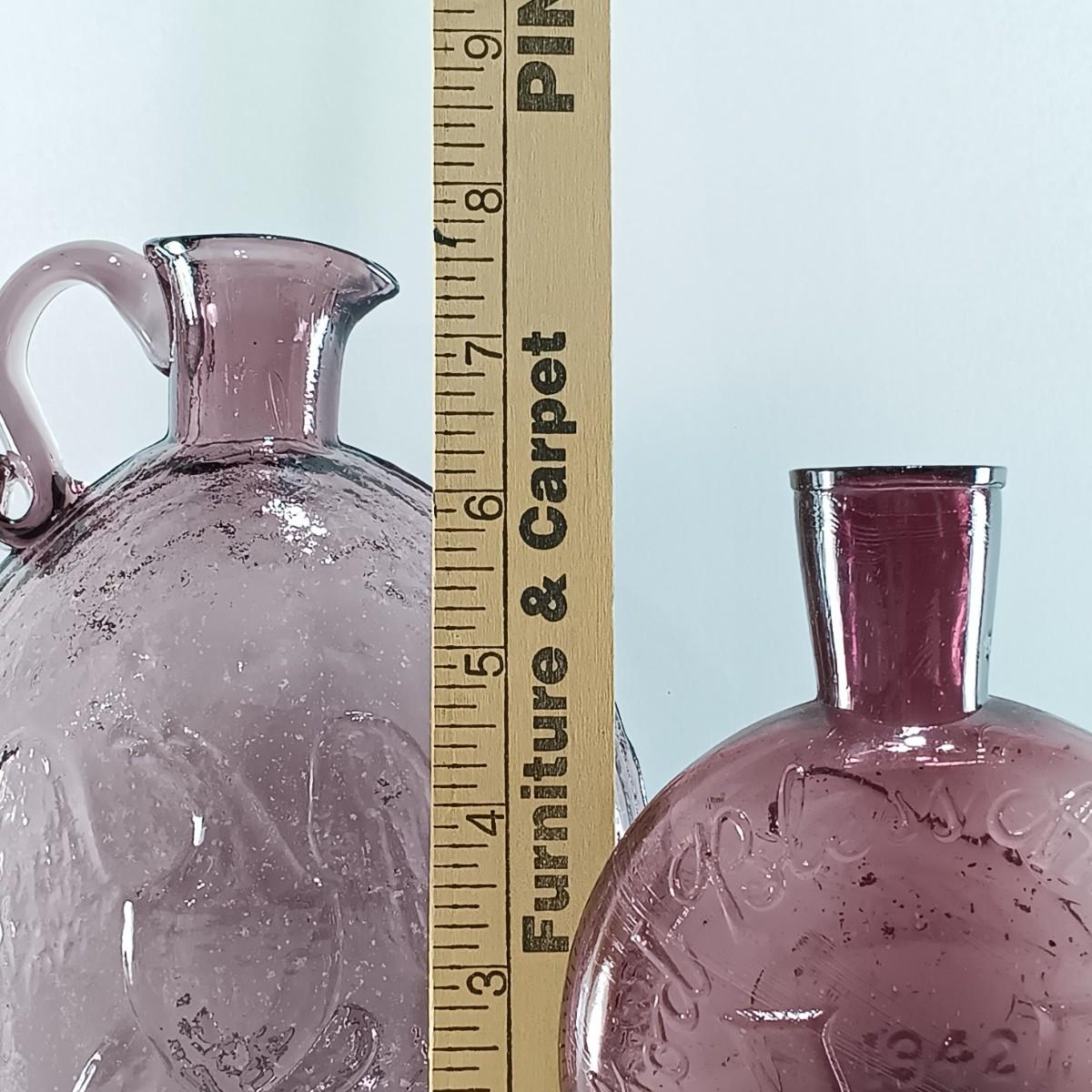 LOT 12: Green and Amber E.G. Booz's Old Cabin Whiskey Bottles with Amethyst MacArthur Victory Bottle & Borough of Clayton Handled Jug