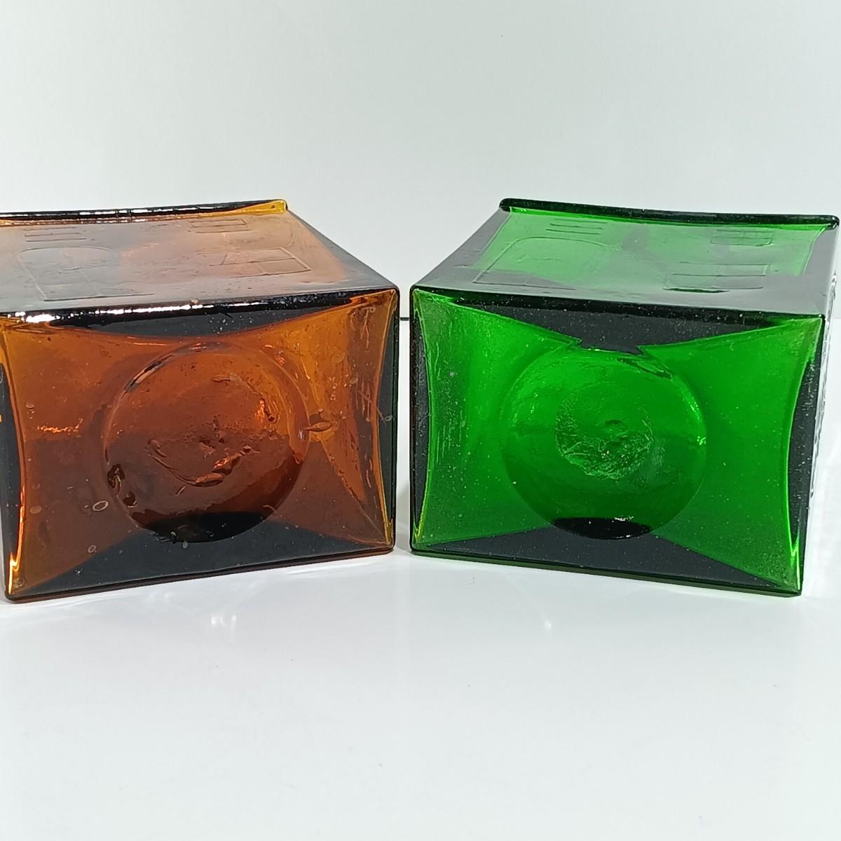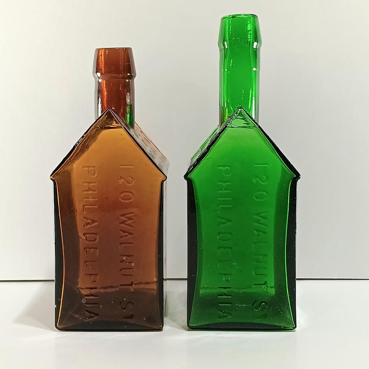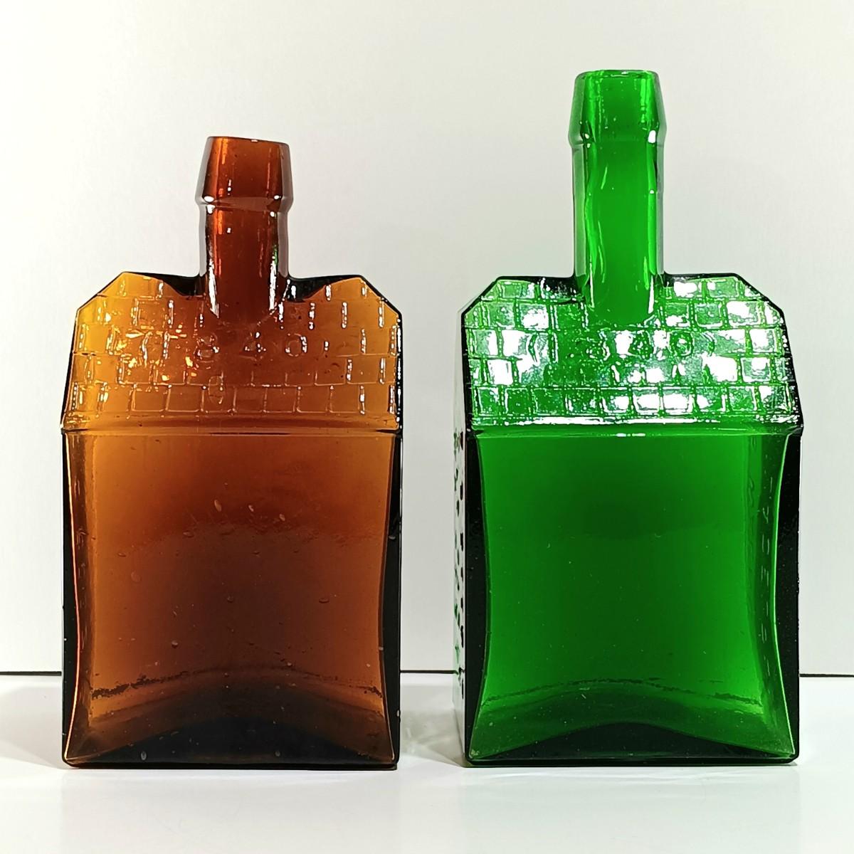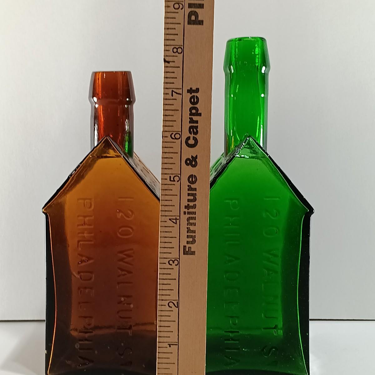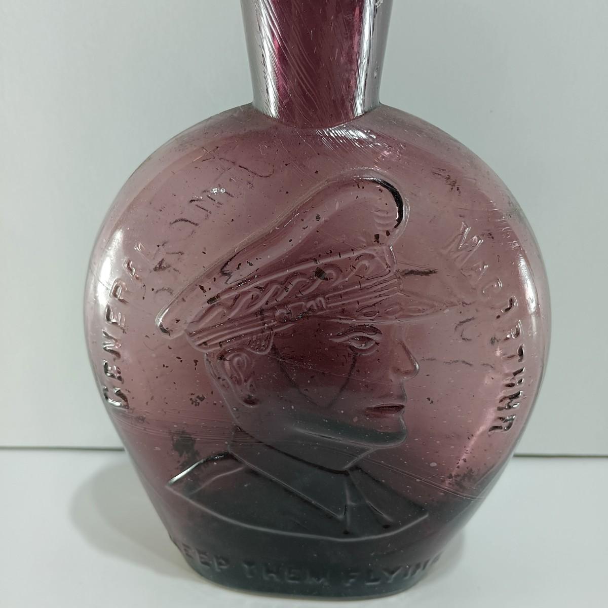 LOT 12: Green and Amber E.G. Booz's Old Cabin Whiskey Bottles with Amethyst MacArthur Victory Bottle & Borough of Clayton Handled Jug