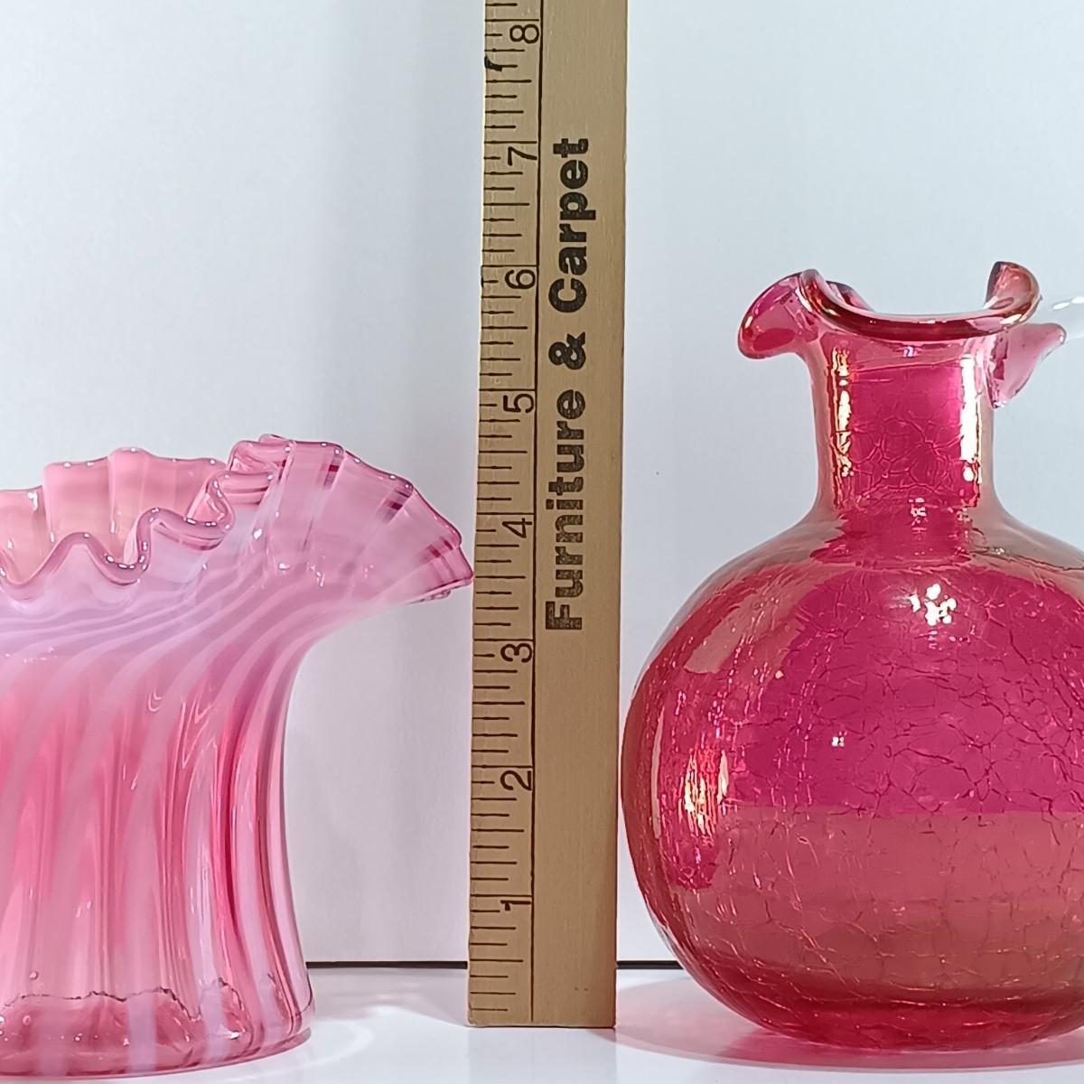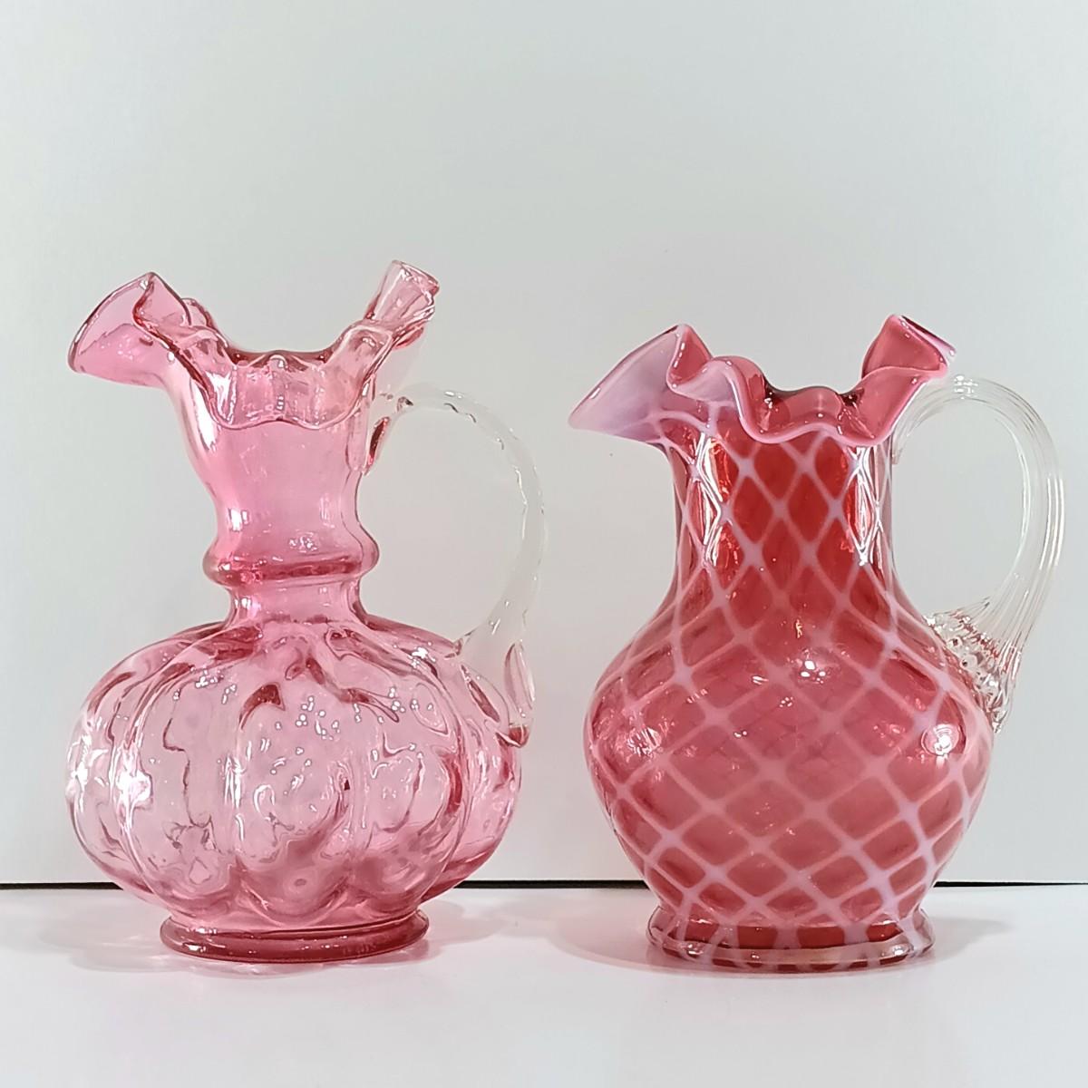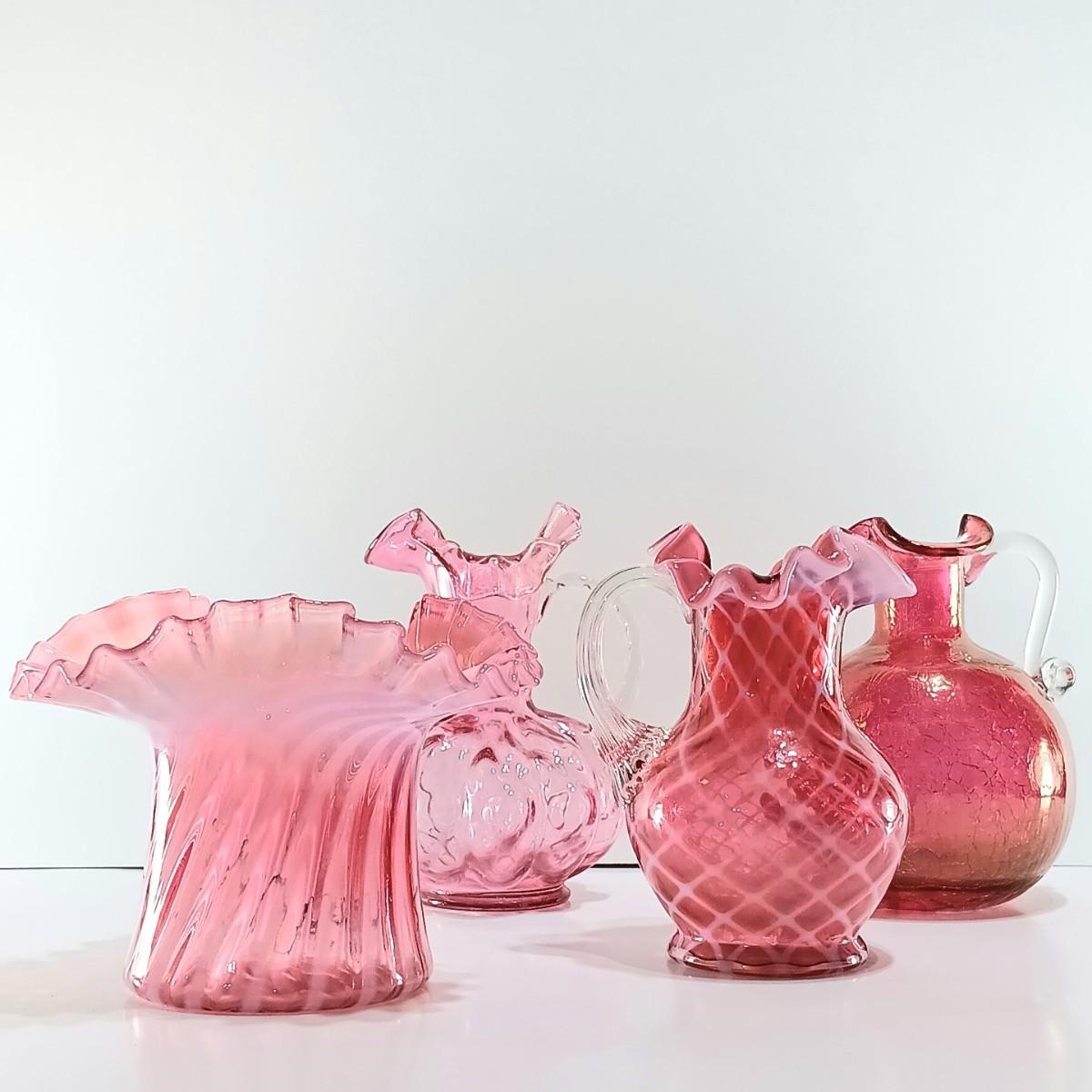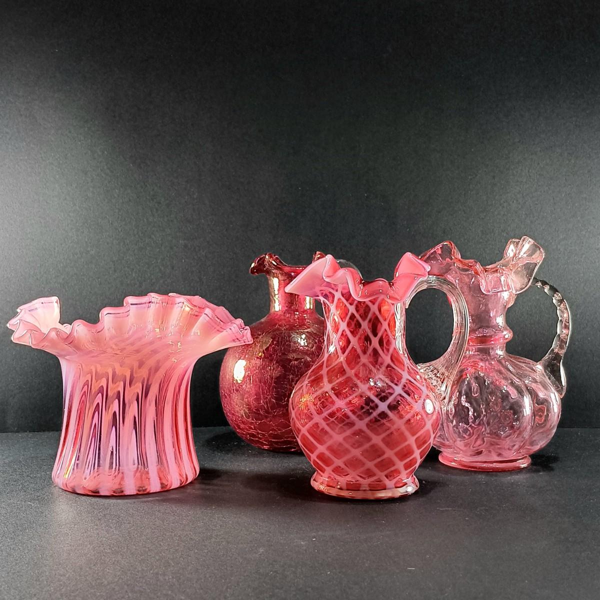 LOT 13: Cranberry Pink Swirl Vase with Ruffled Top Pitcher, Cranberry Lattice Pitcher and Crackle Glass Pitcher