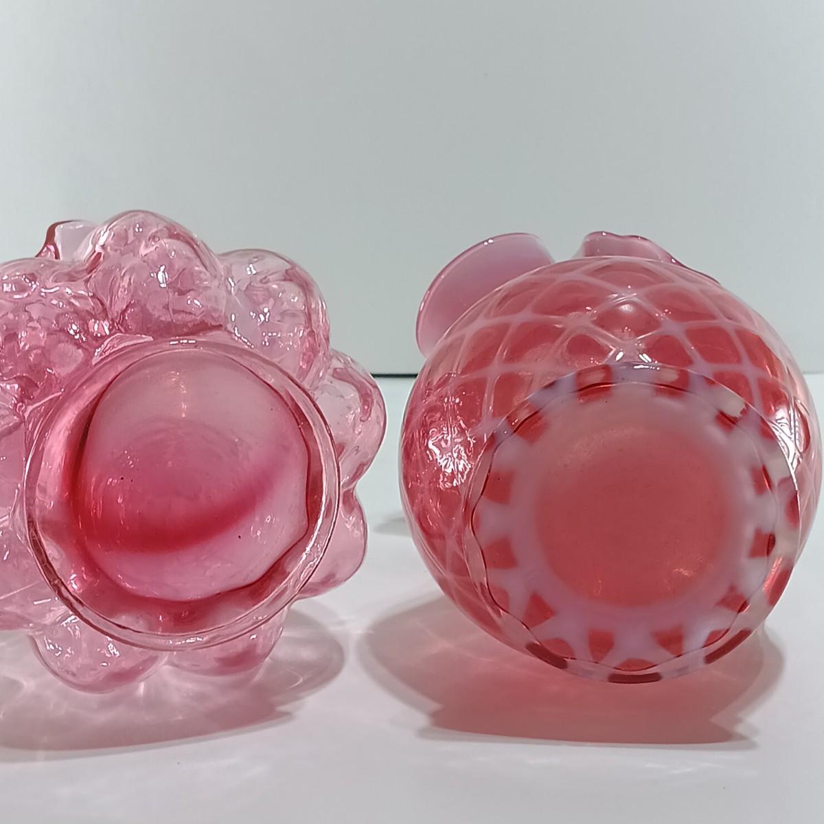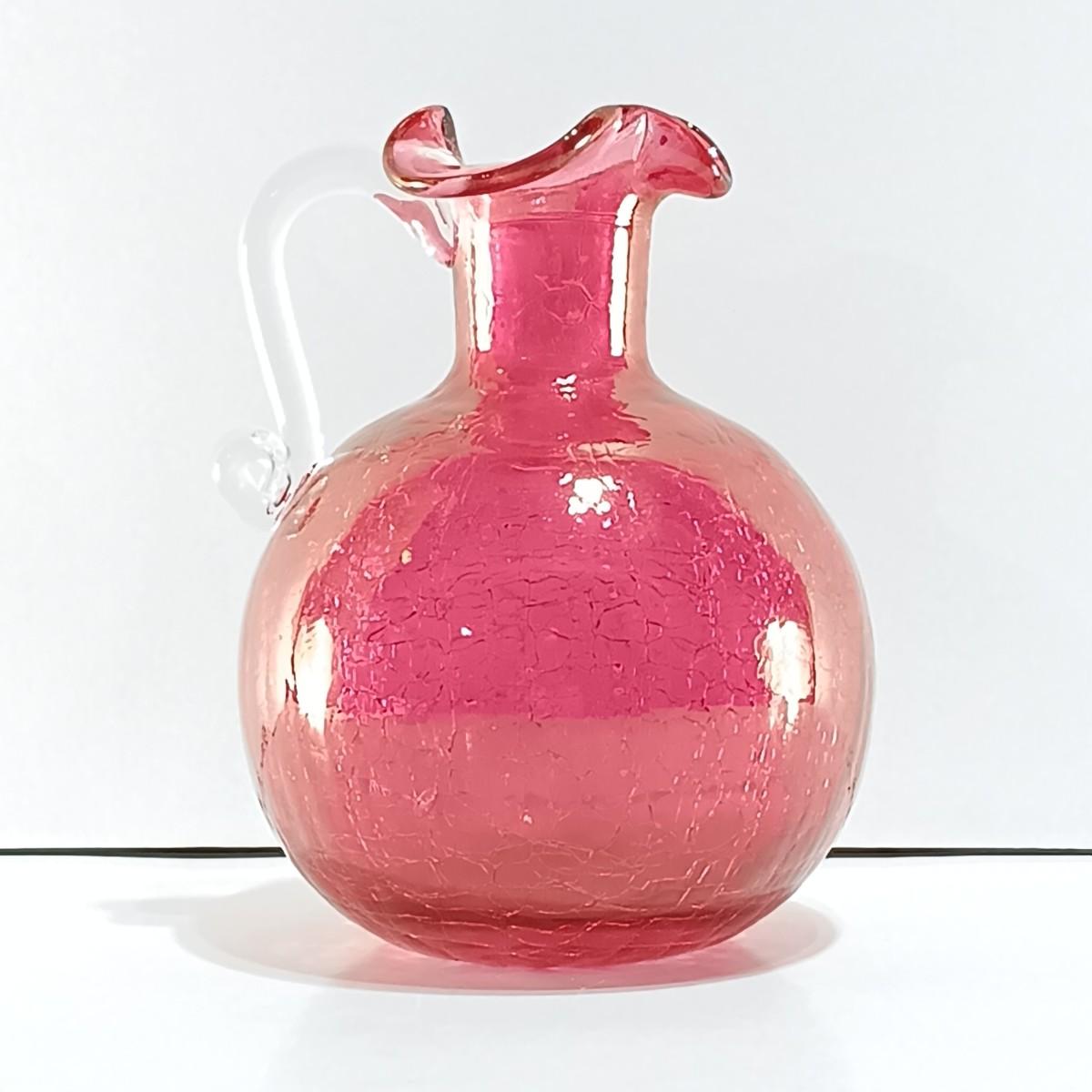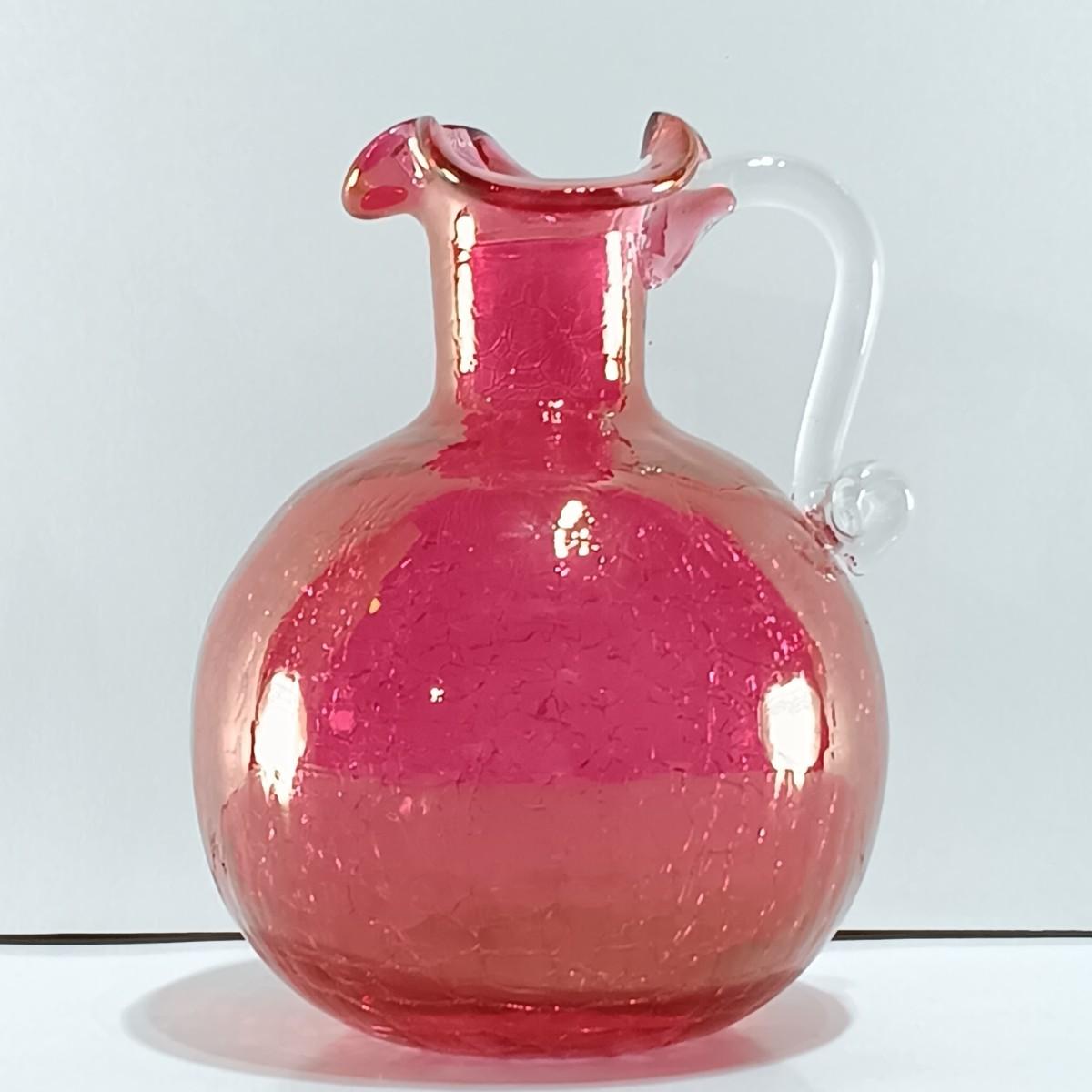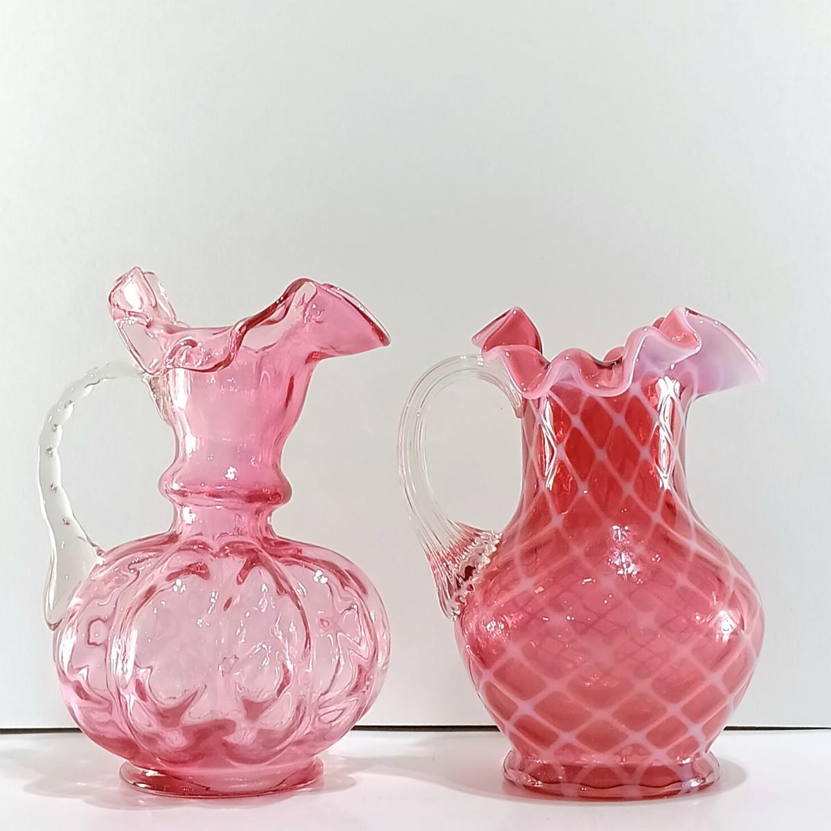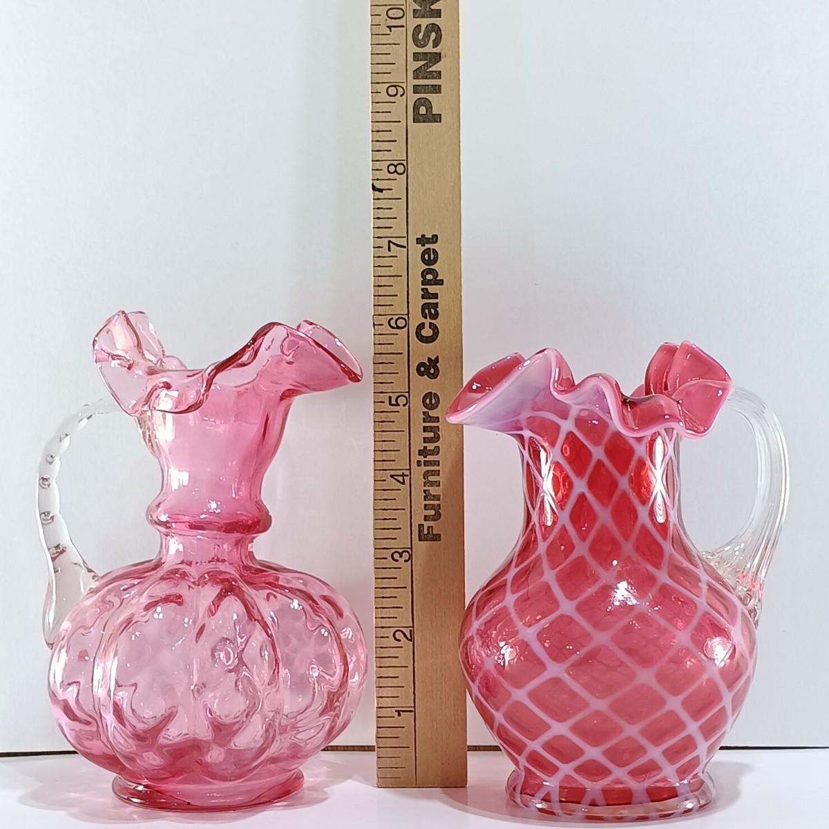 LOT 13: Cranberry Pink Swirl Vase with Ruffled Top Pitcher, Cranberry Lattice Pitcher and Crackle Glass Pitcher