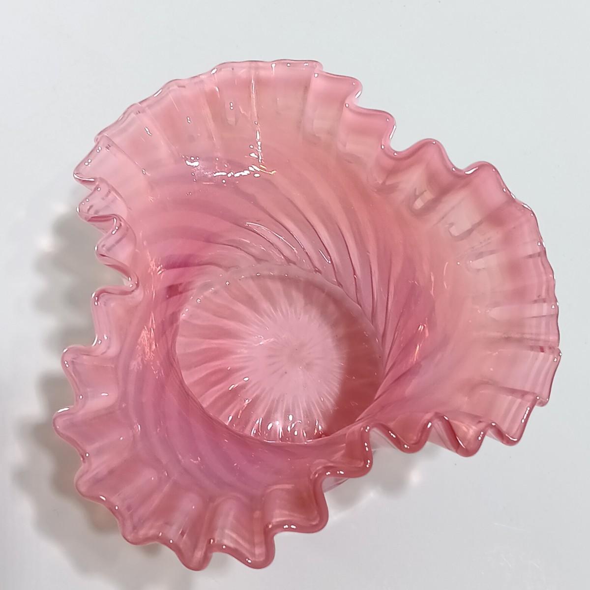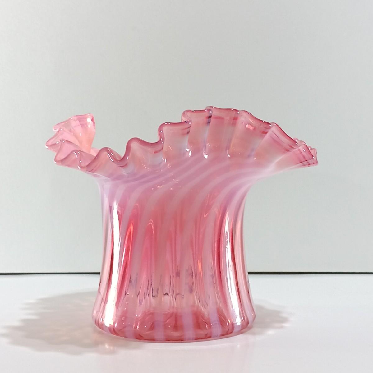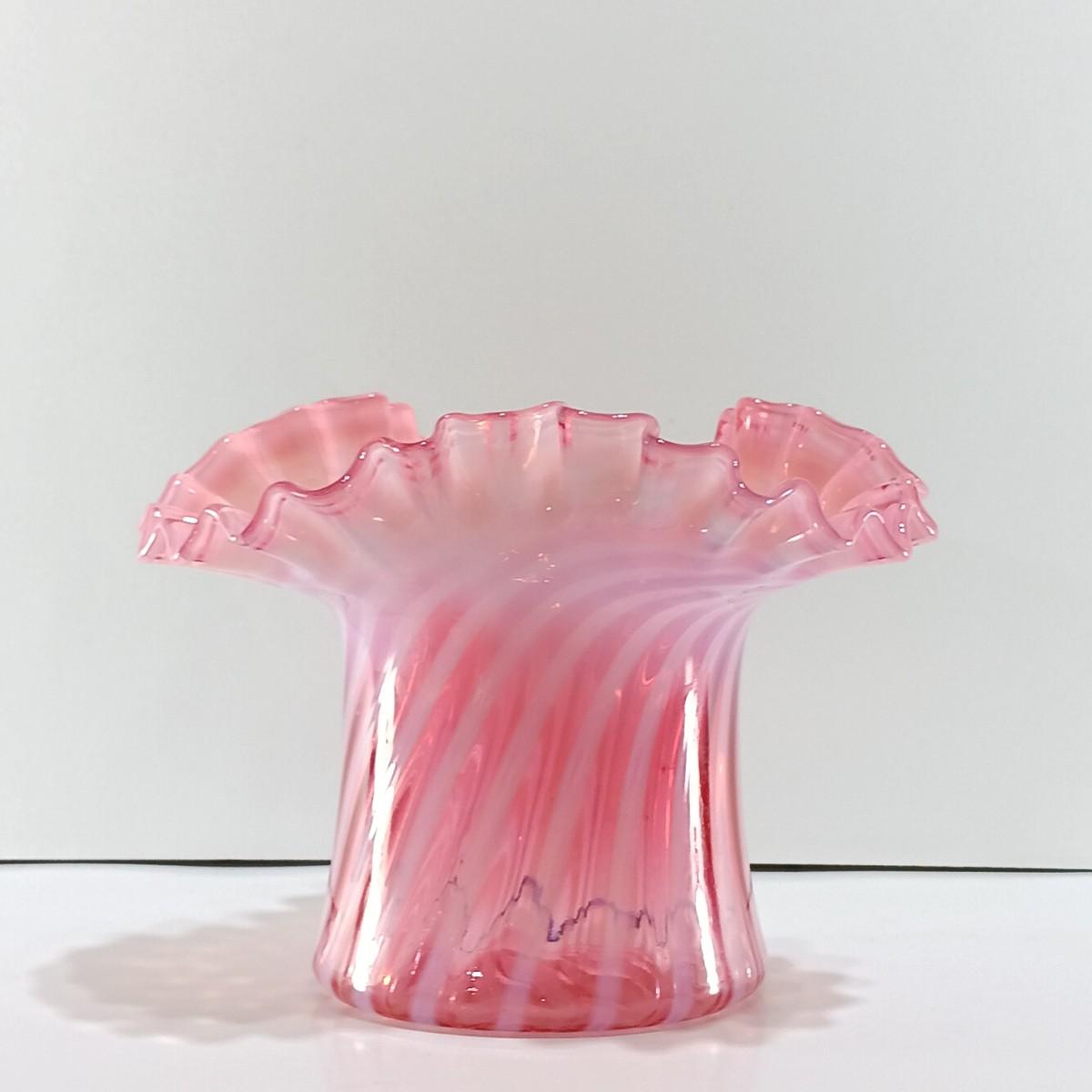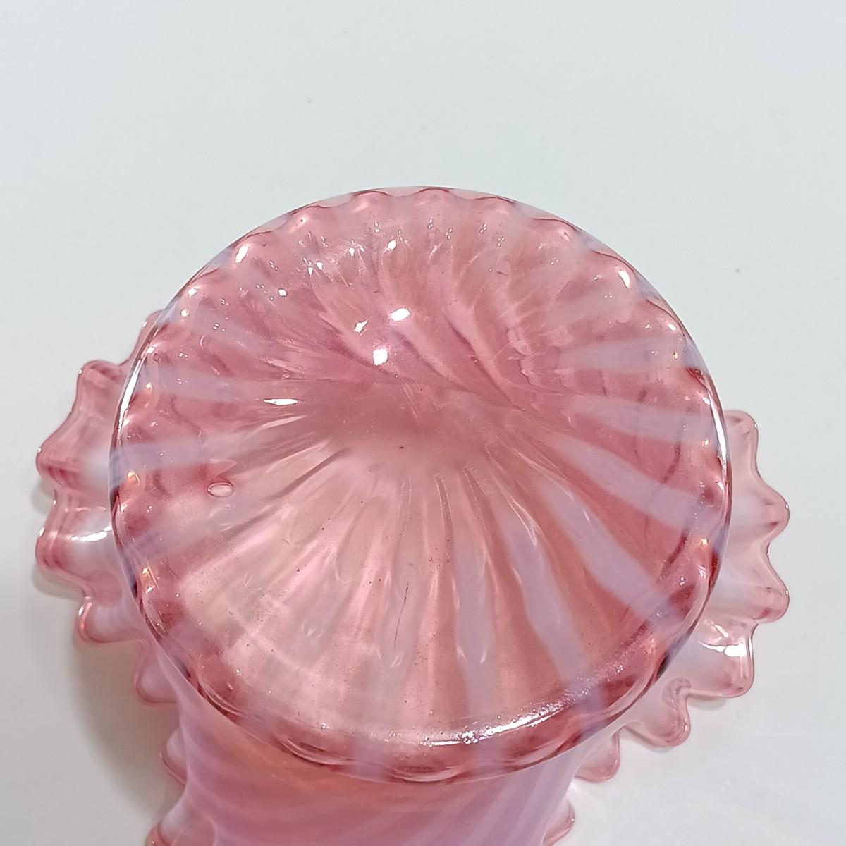 LOT 13: Cranberry Pink Swirl Vase with Ruffled Top Pitcher, Cranberry Lattice Pitcher and Crackle Glass Pitcher