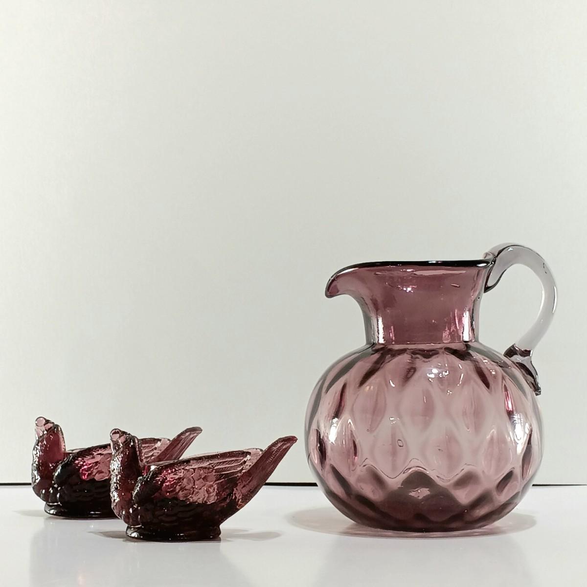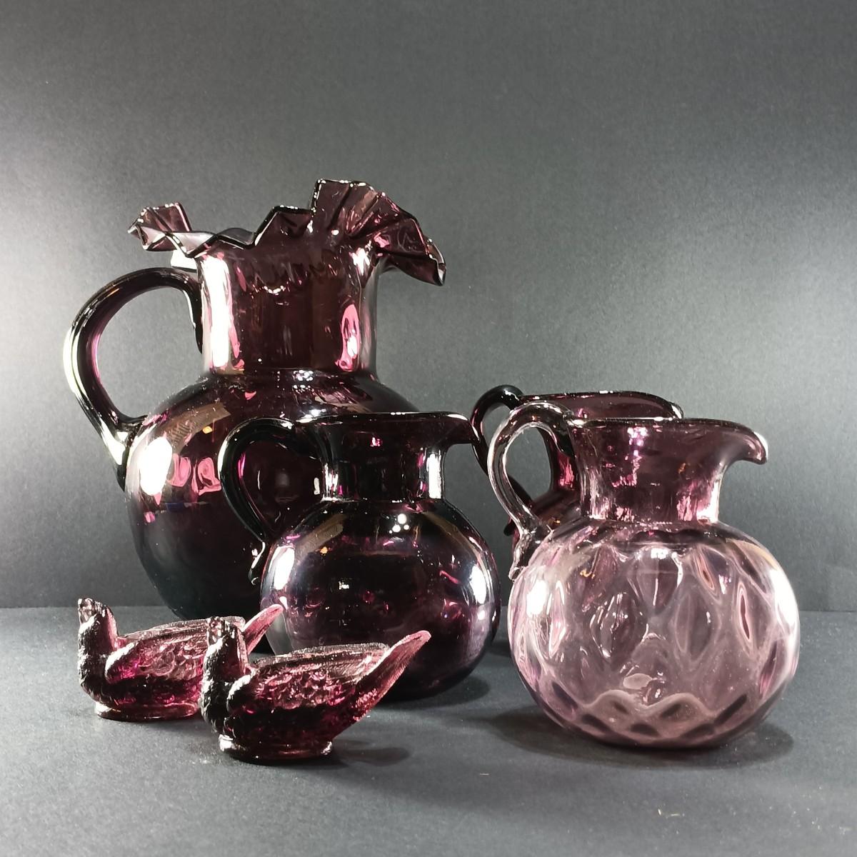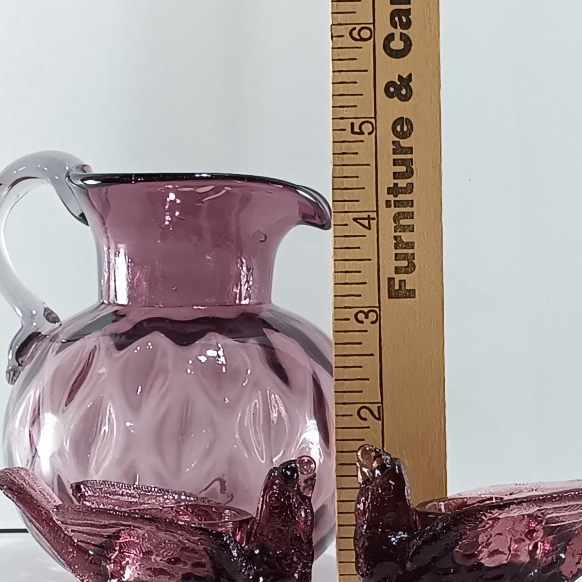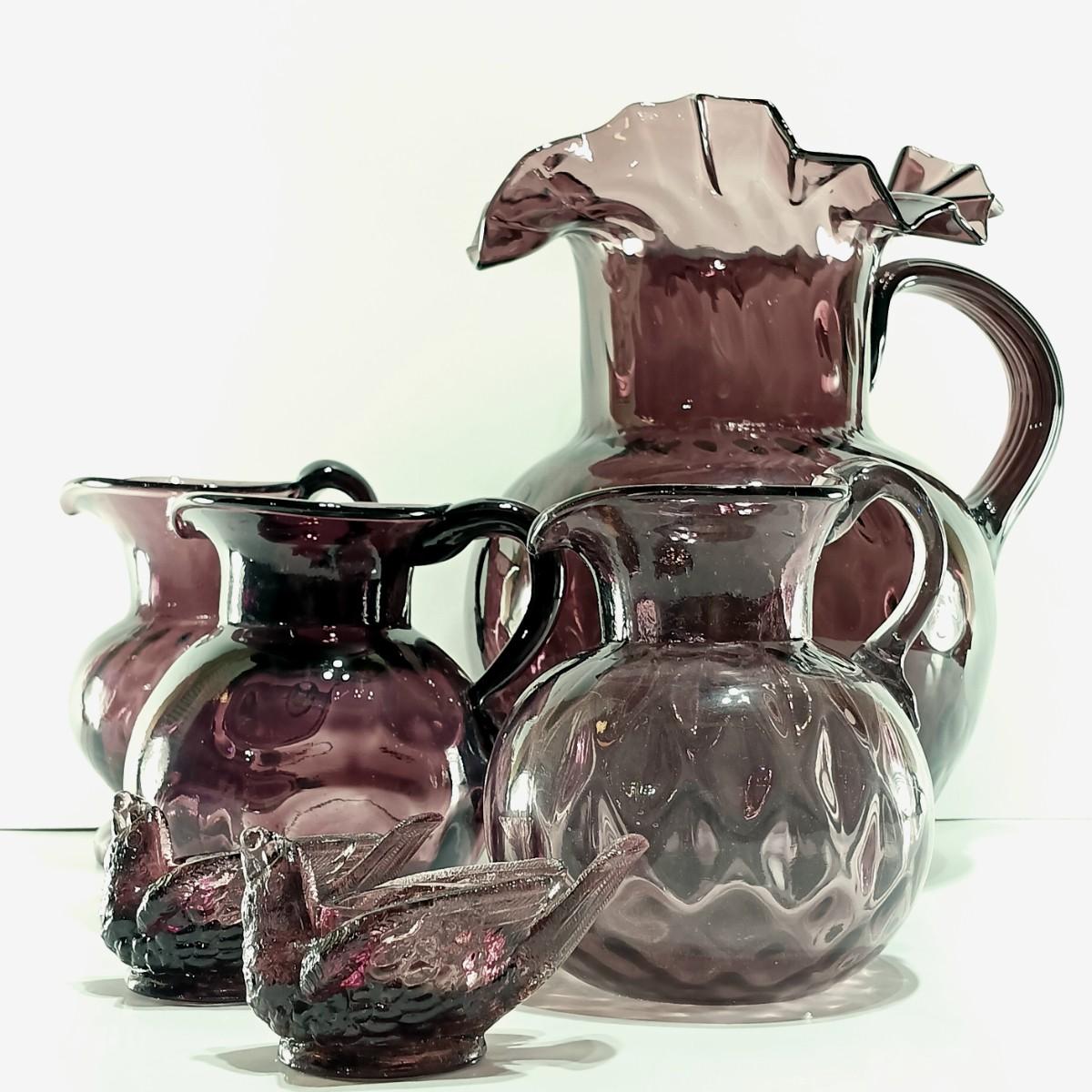 LOT 14: Amethyst Ruffle Top Coin Spot Pitcher with a Pair of Bird With Seeds and 3 Smaller Pitchers