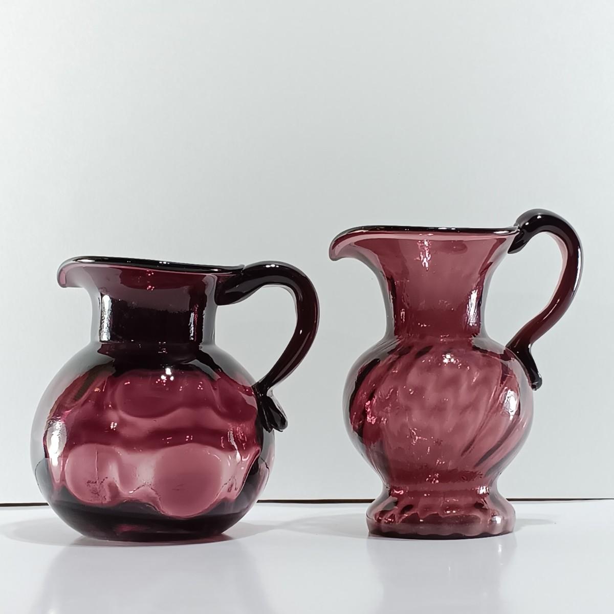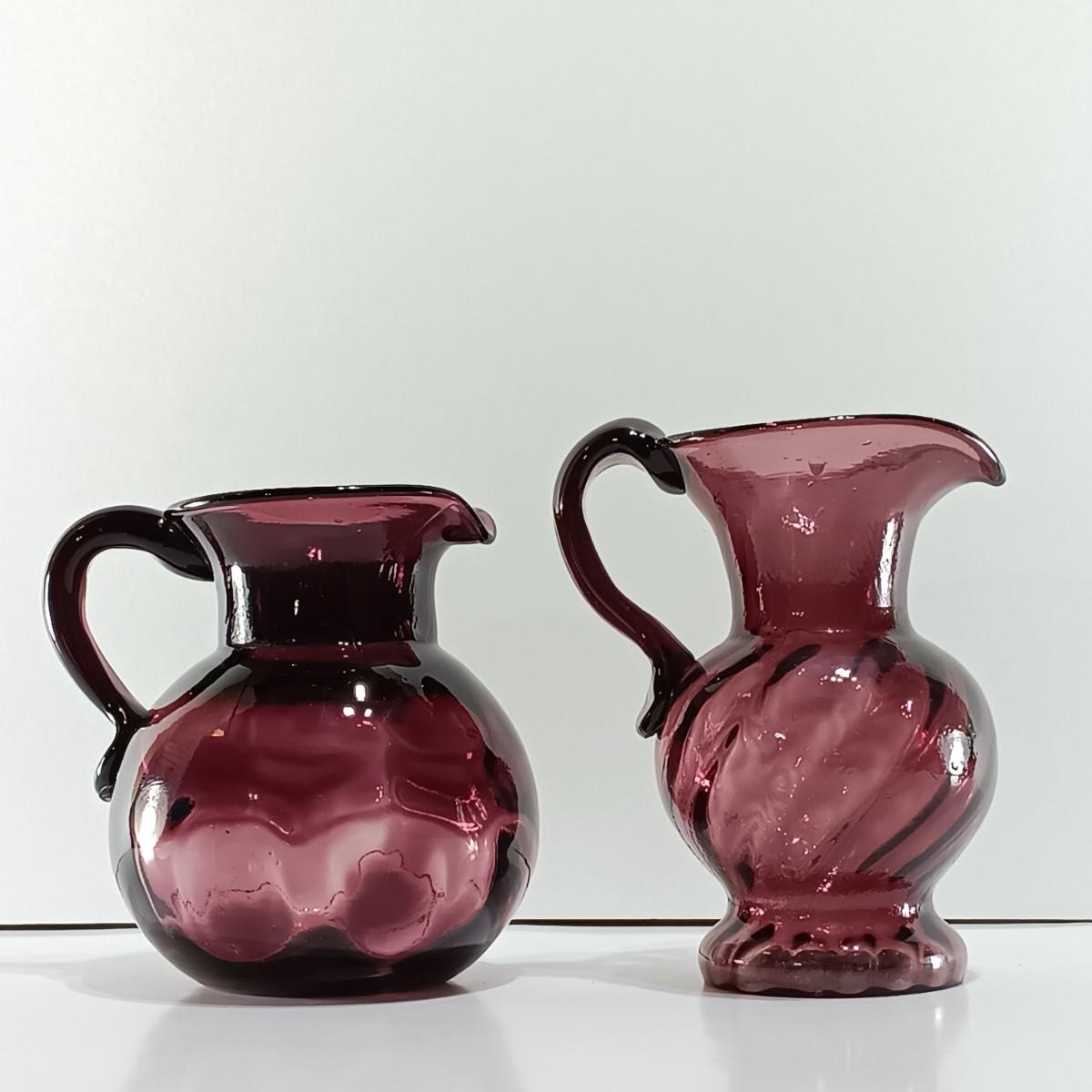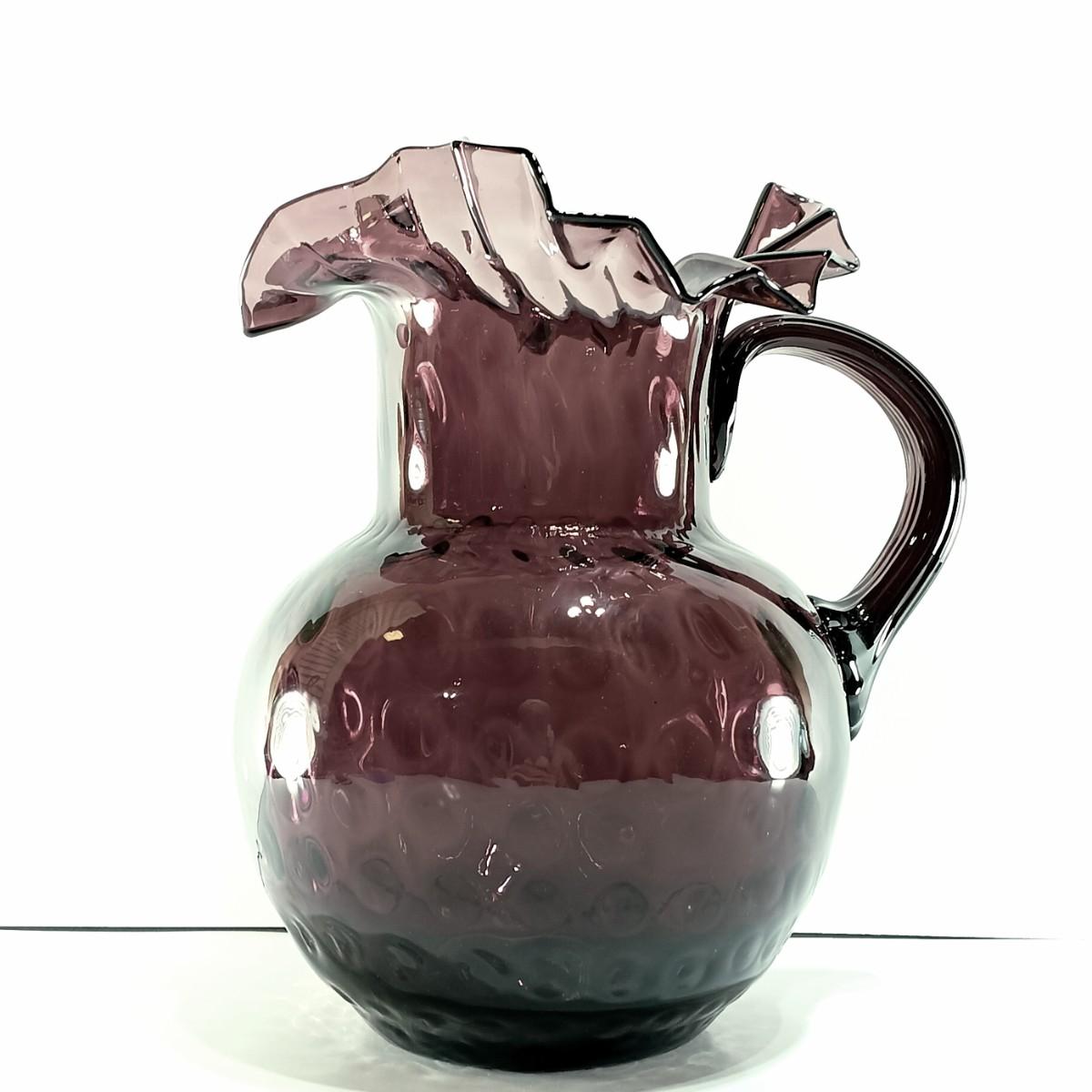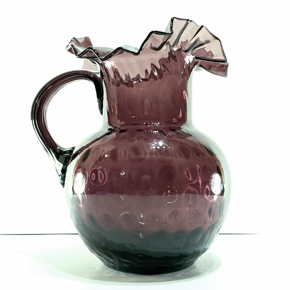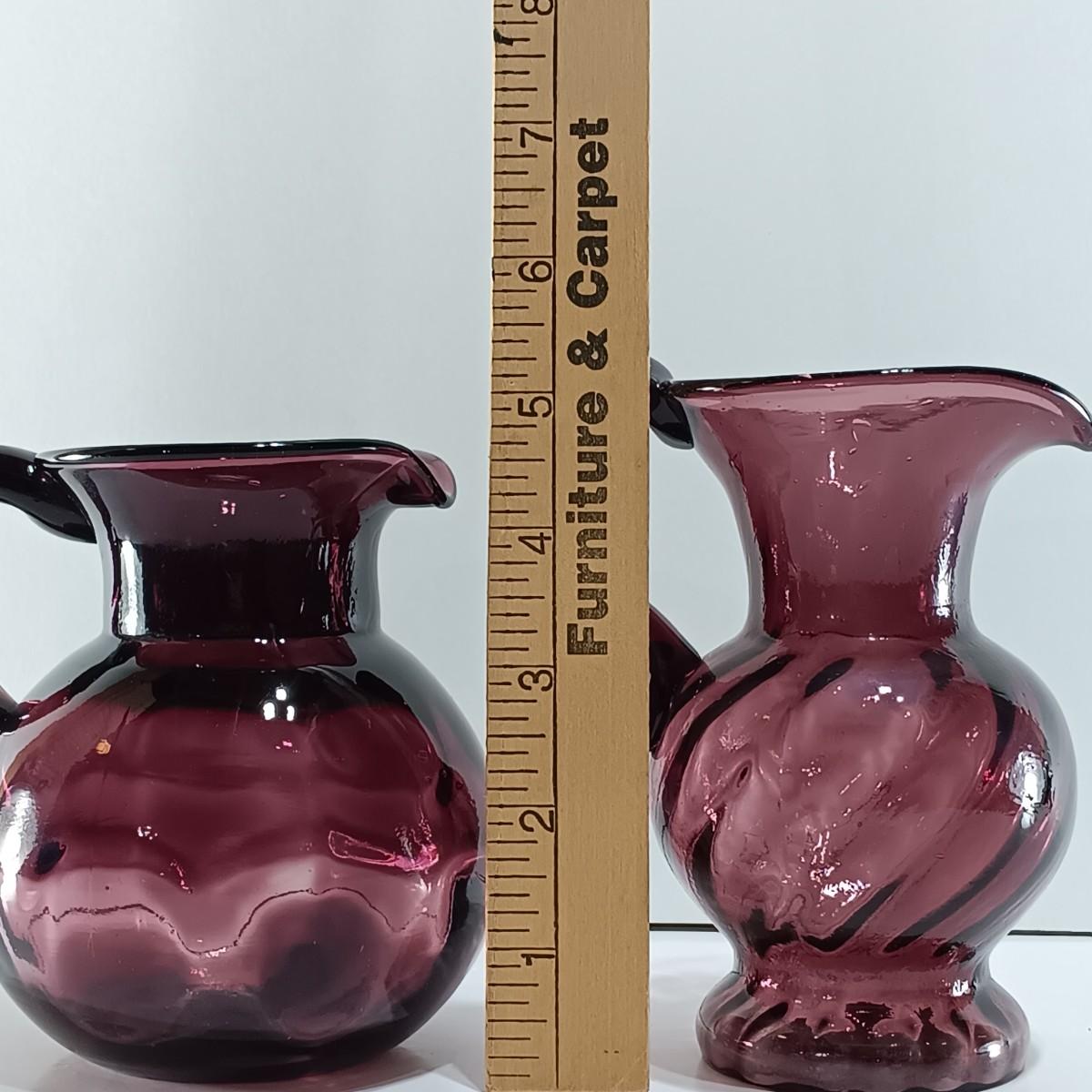 LOT 14: Amethyst Ruffle Top Coin Spot Pitcher with a Pair of Bird With Seeds and 3 Smaller Pitchers