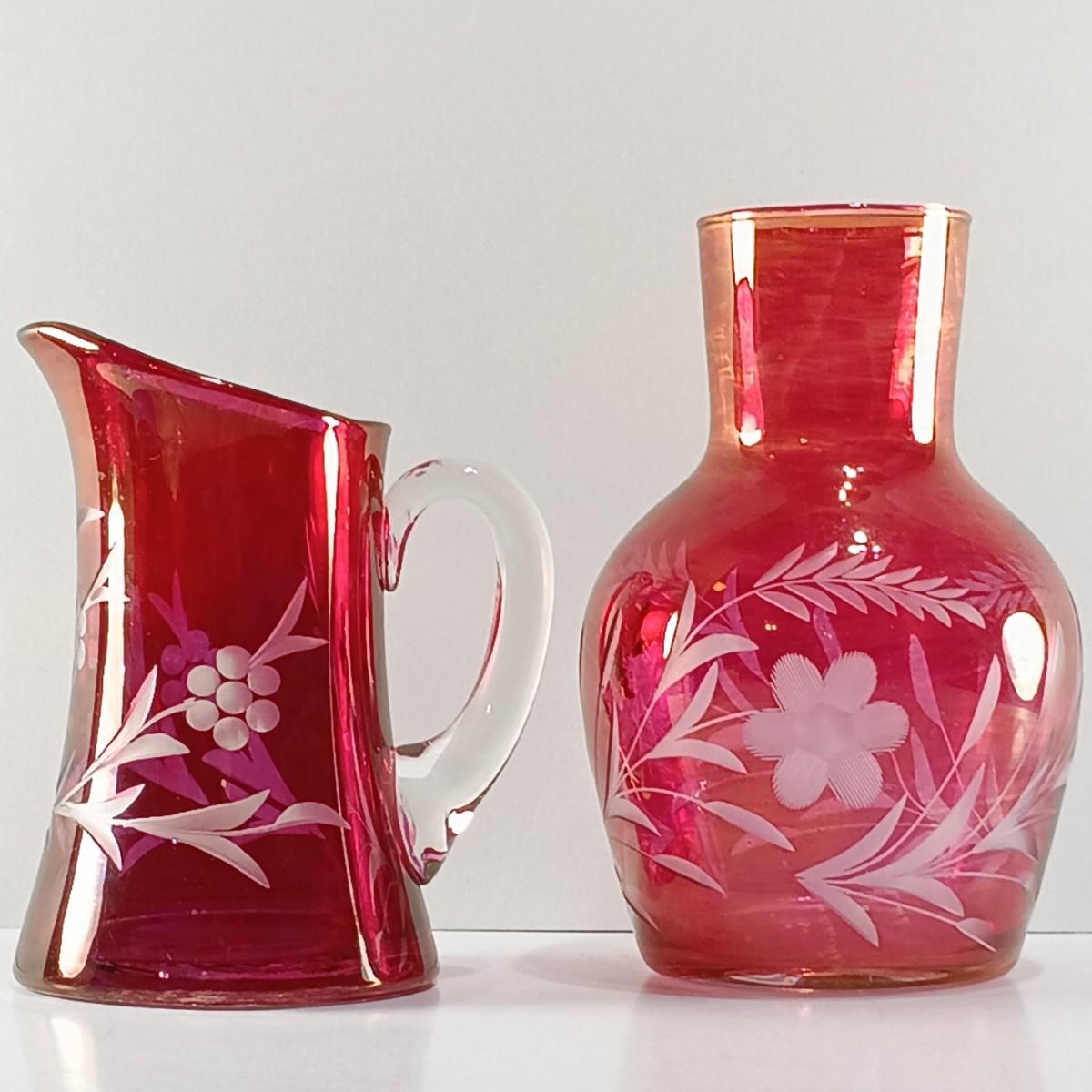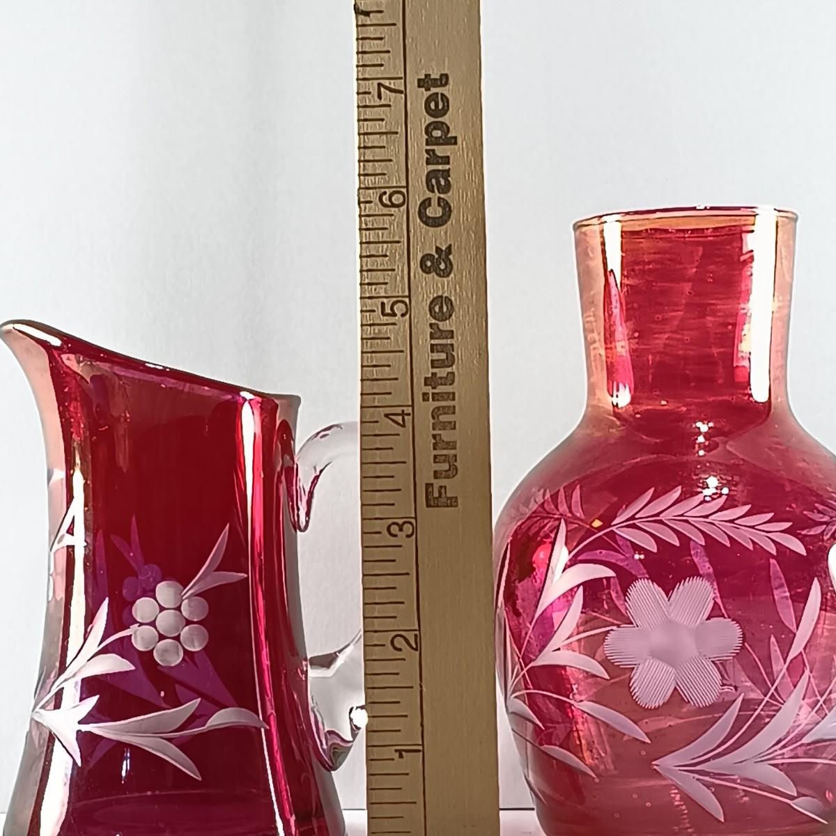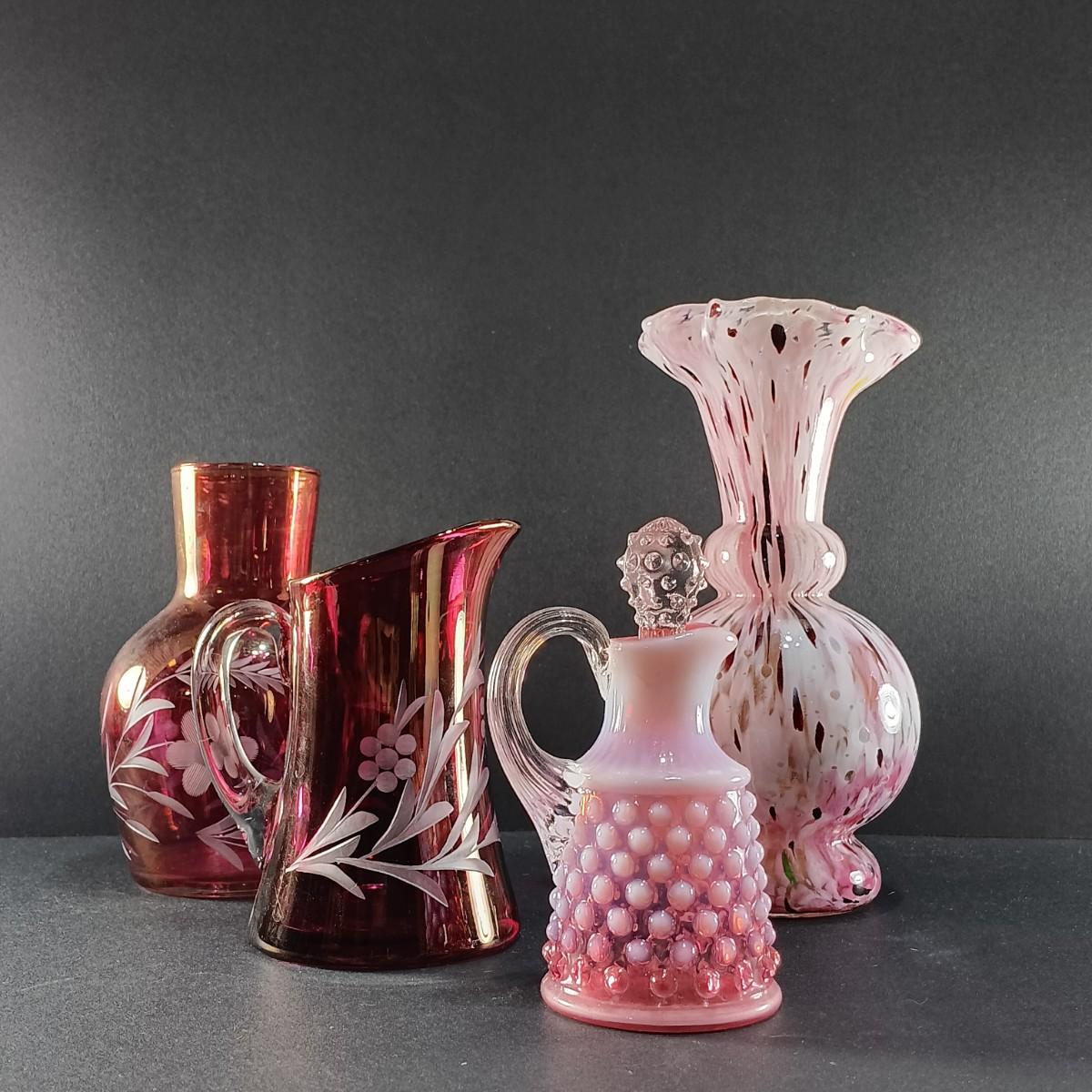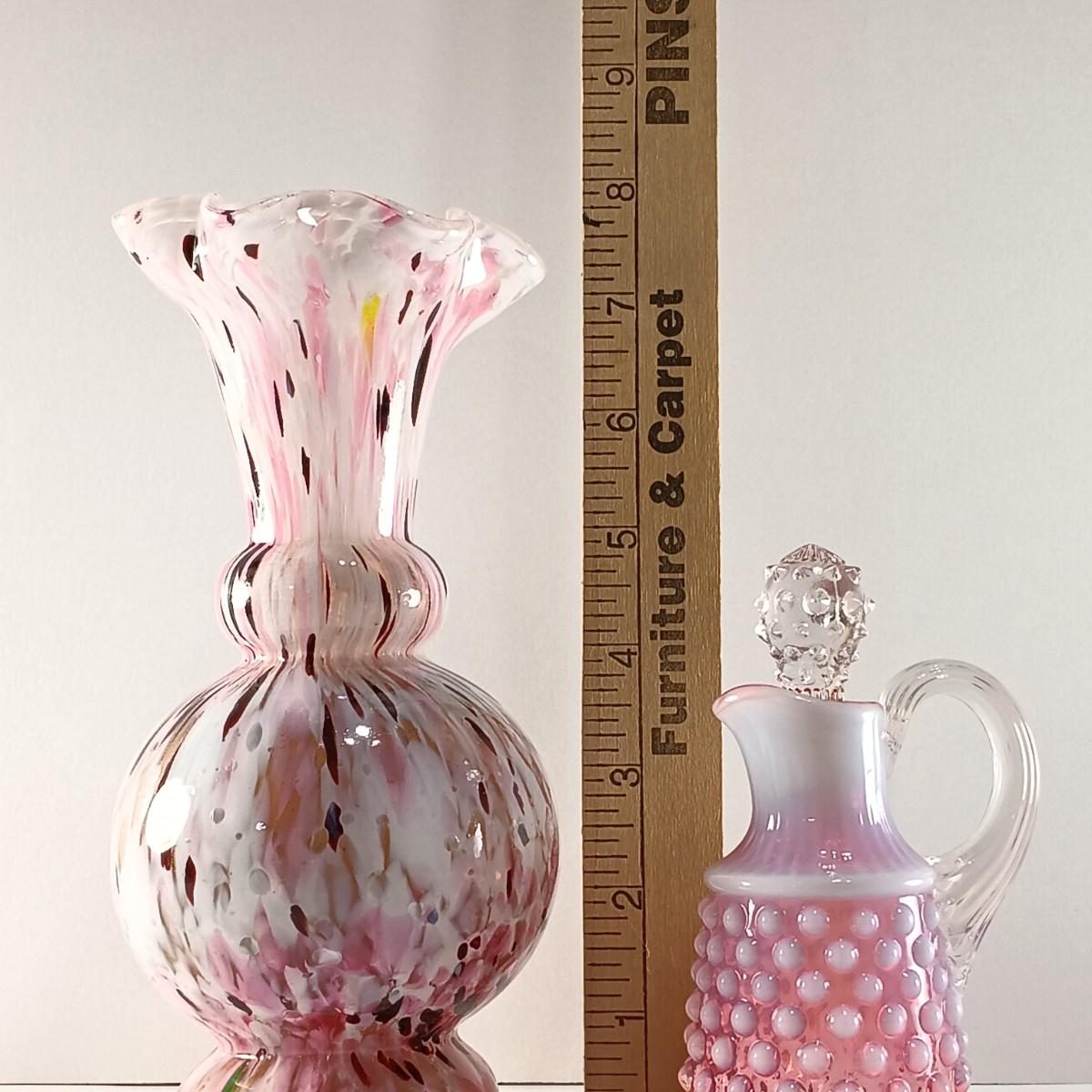 LOT 15: Ruffle Topped Splatter Vase with Opalescent Cranberry Hobnail Cruet and a Set of Etched Floral Glass