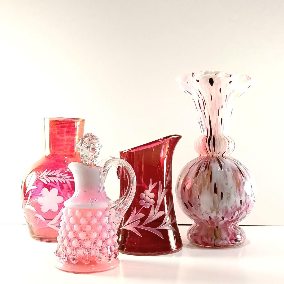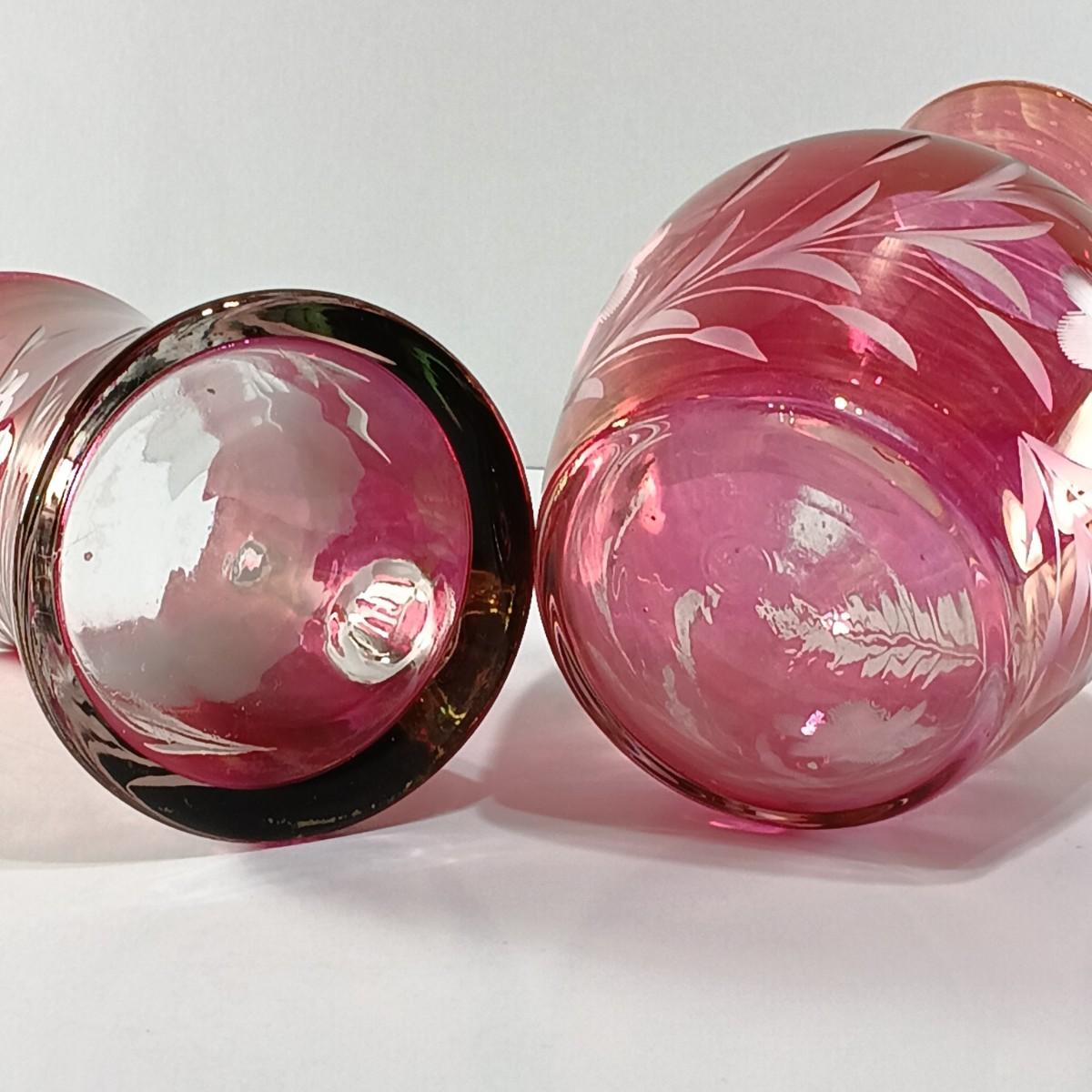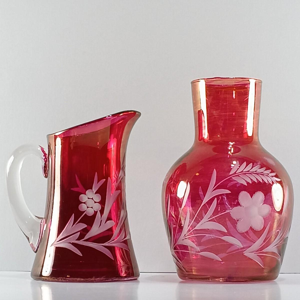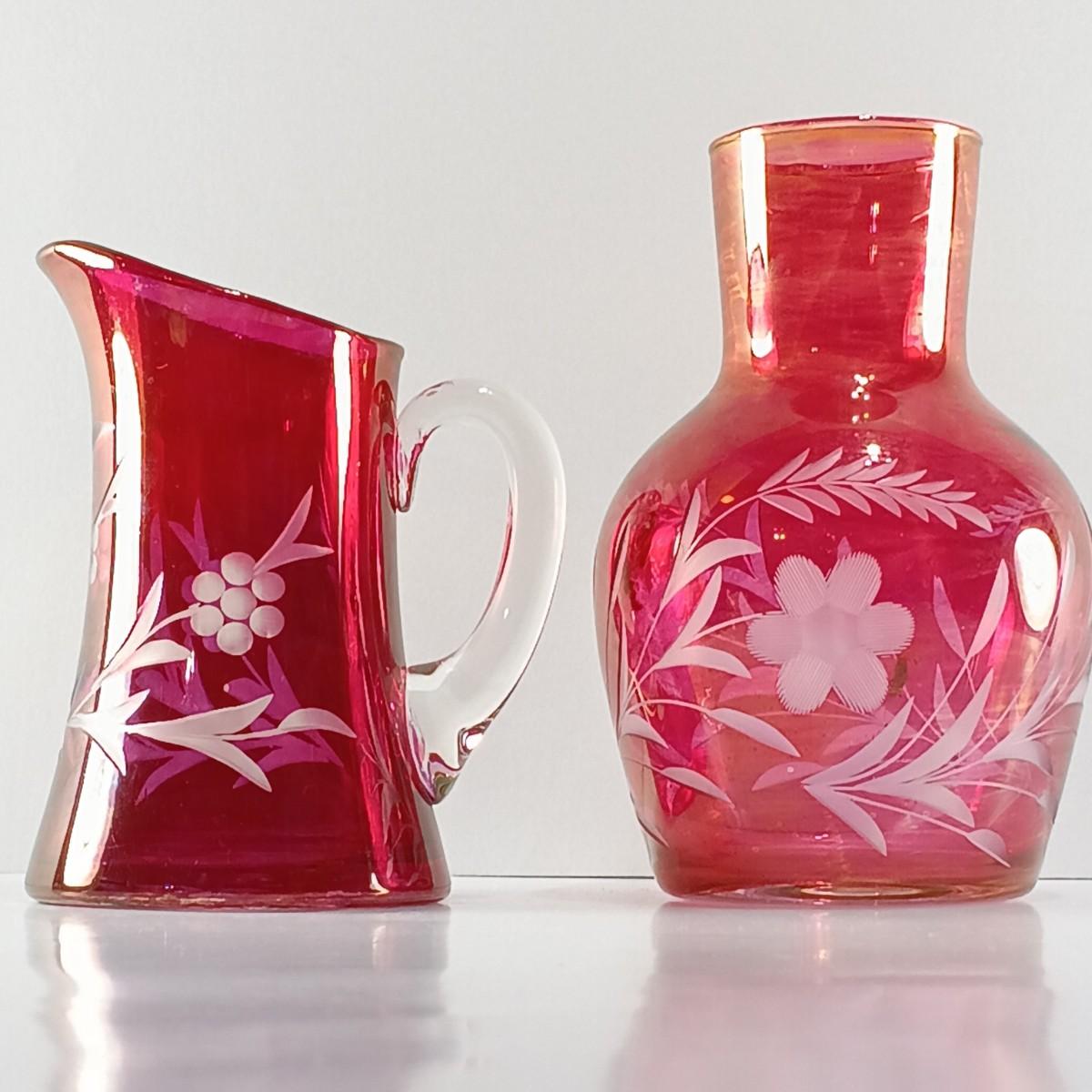 LOT 15: Ruffle Topped Splatter Vase with Opalescent Cranberry Hobnail Cruet and a Set of Etched Floral Glass