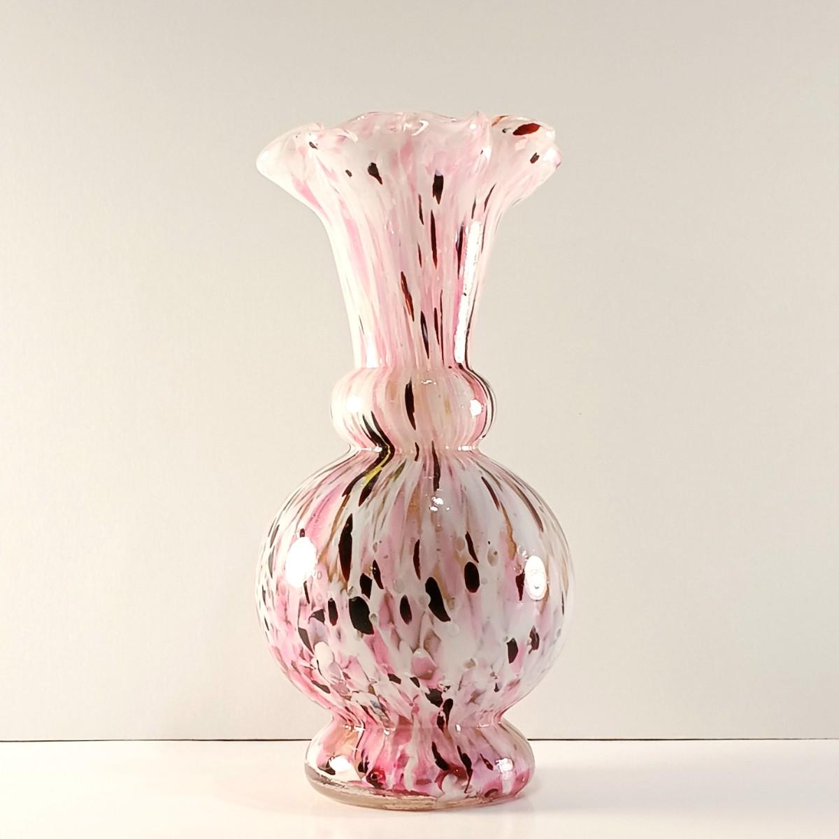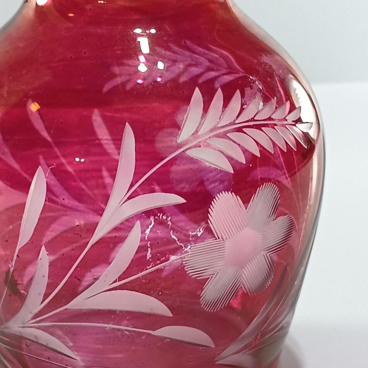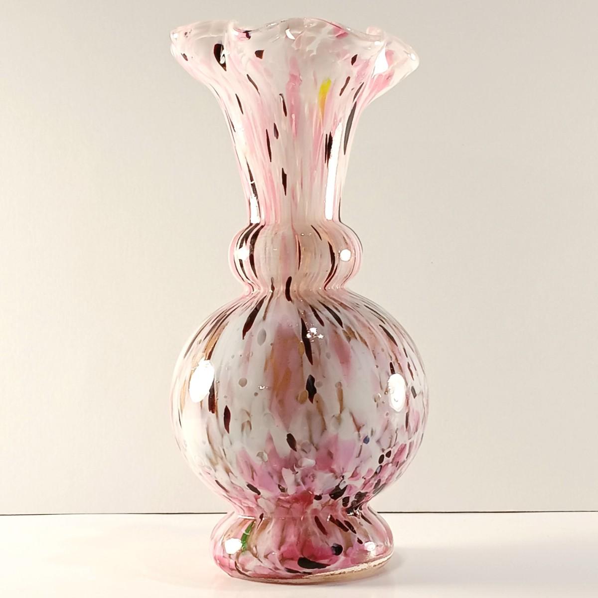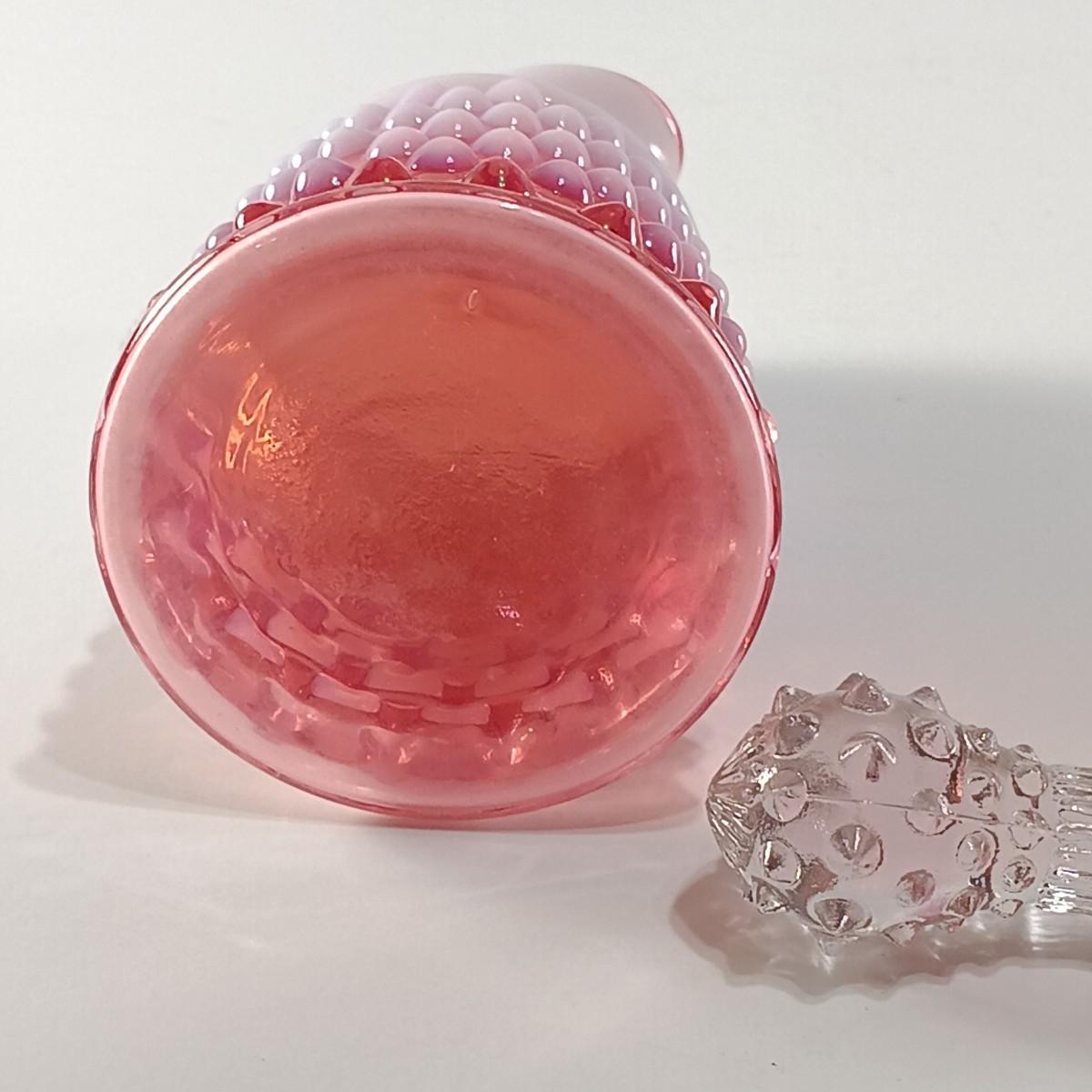 LOT 15: Ruffle Topped Splatter Vase with Opalescent Cranberry Hobnail Cruet and a Set of Etched Floral Glass