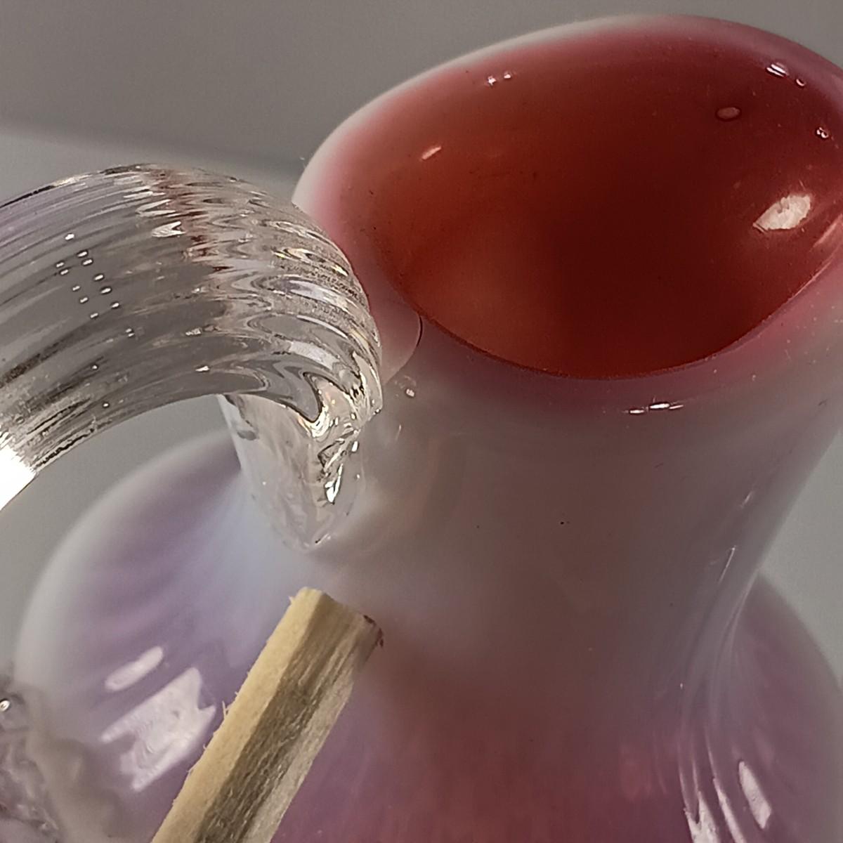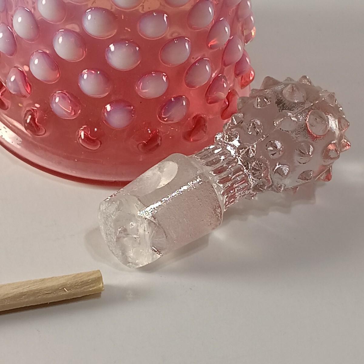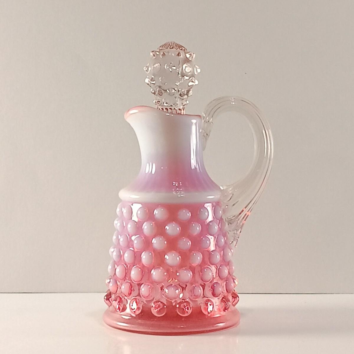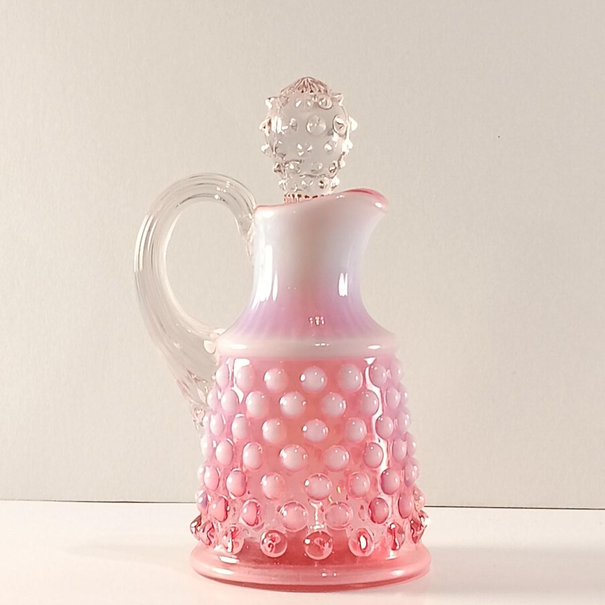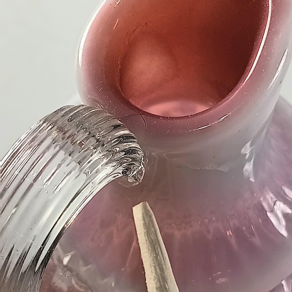 Please Note: The cruet has a crack and chip along the base of the handle and the stopper has a chip along its edge.