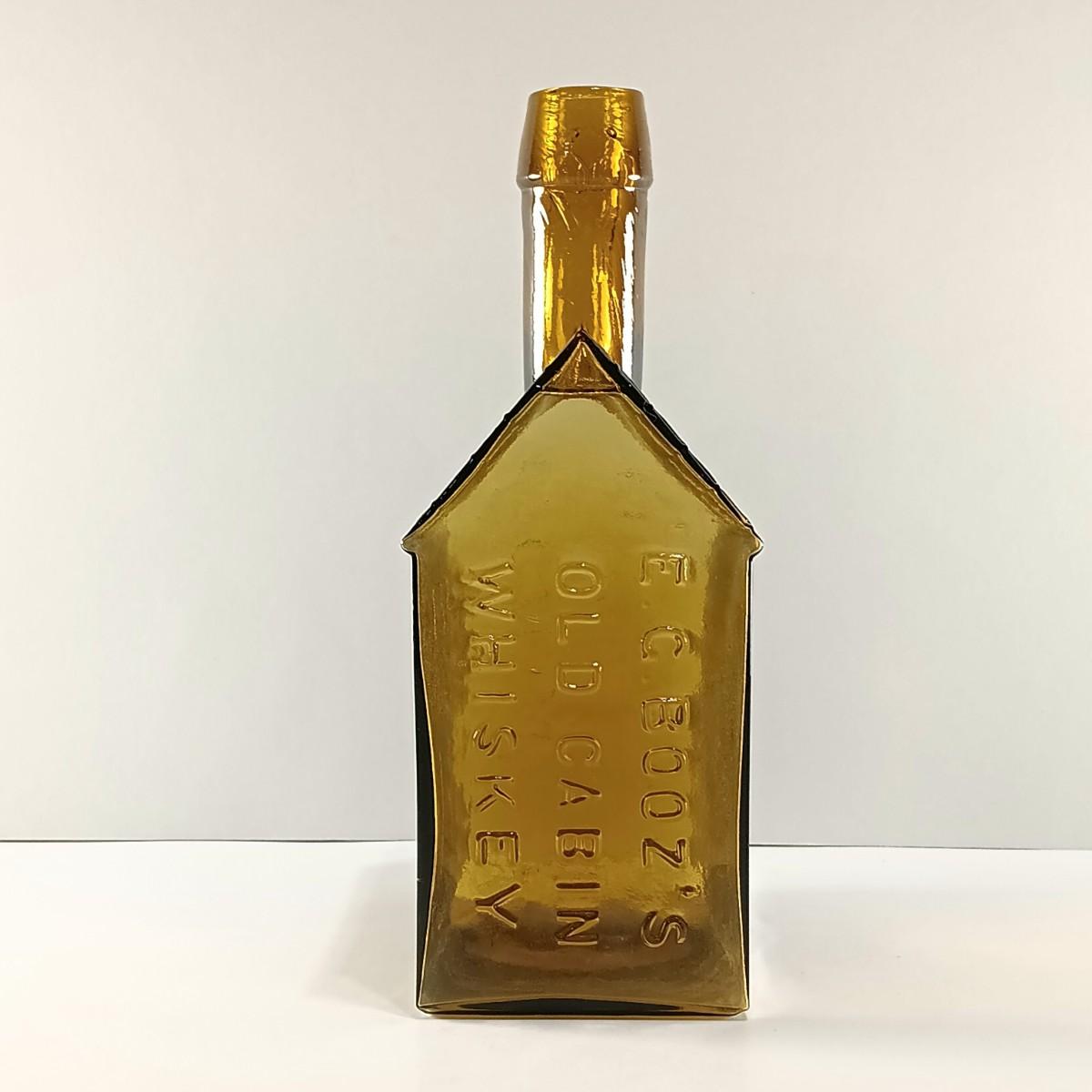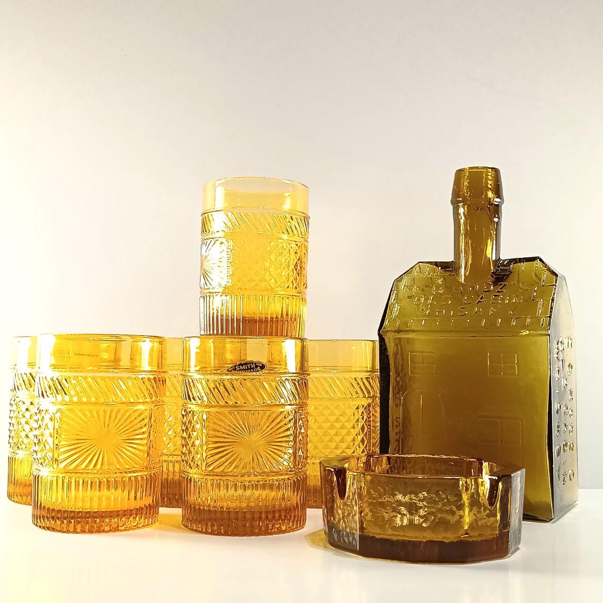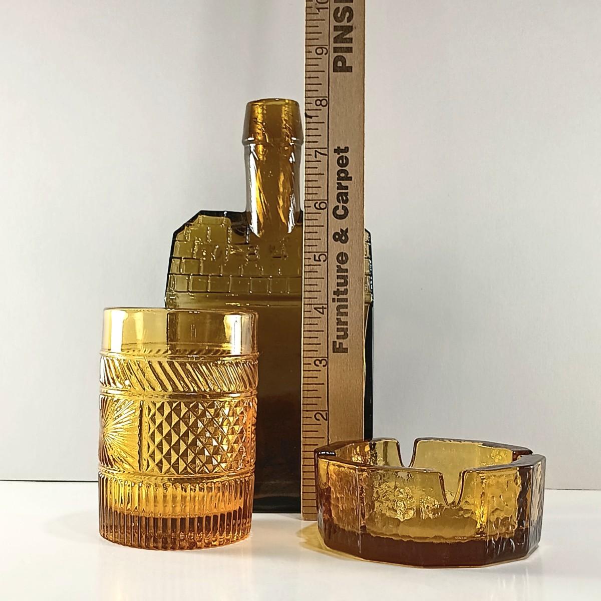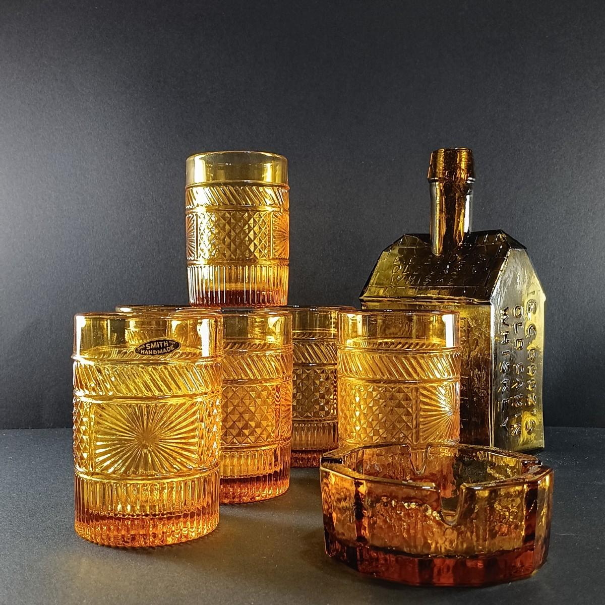 LOT 17: Set of 6 Smith Amber Glass Tumblers with an E.G. Booz's Old Cabin Whiskey Bottle and Ashtray