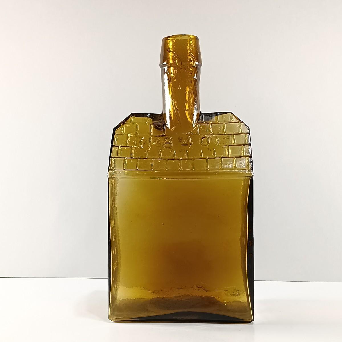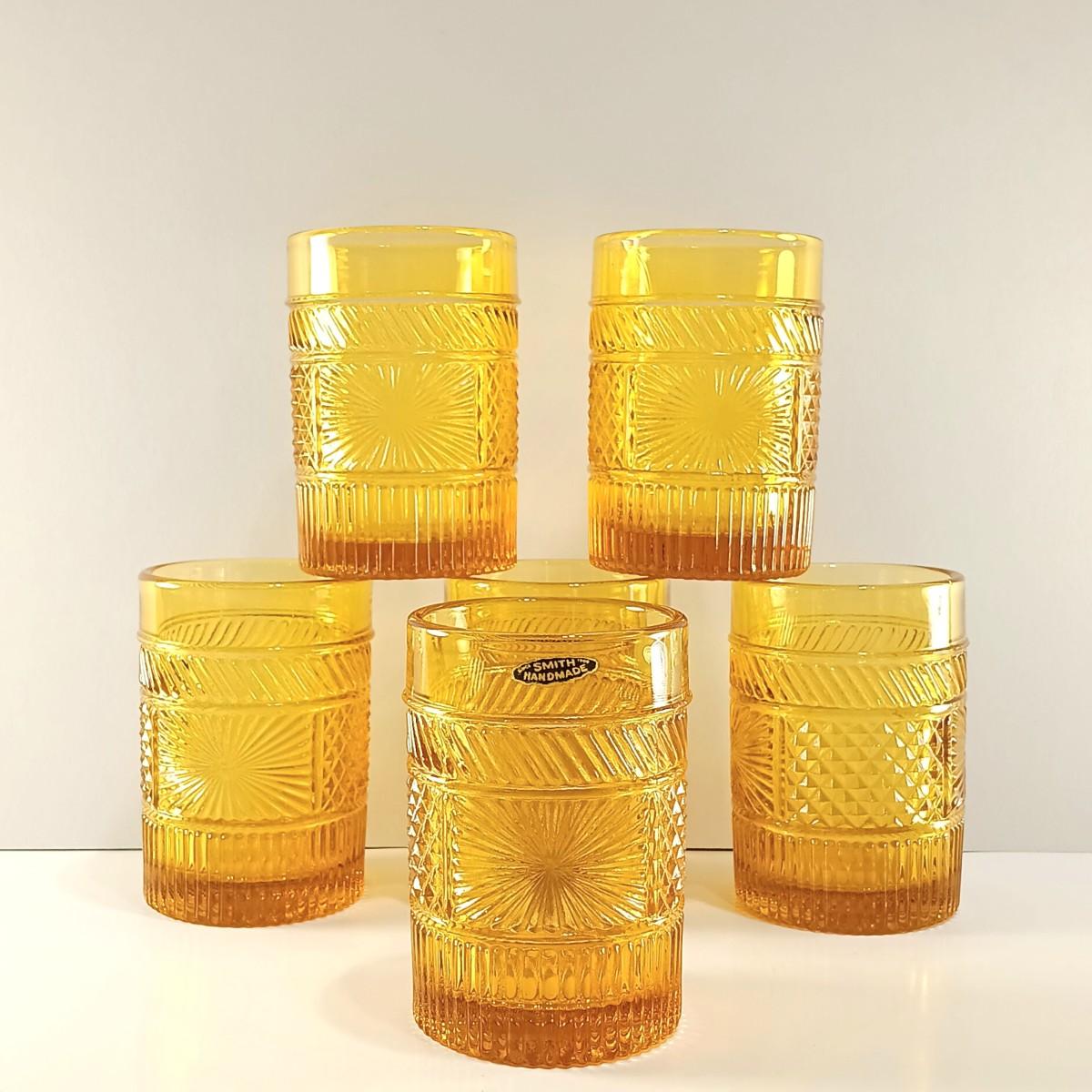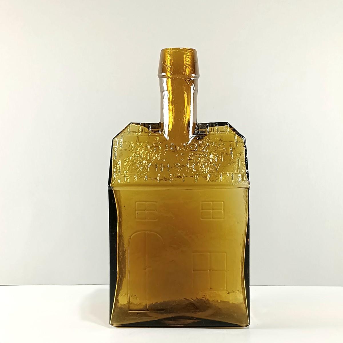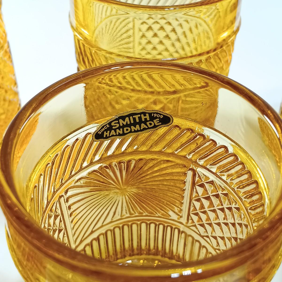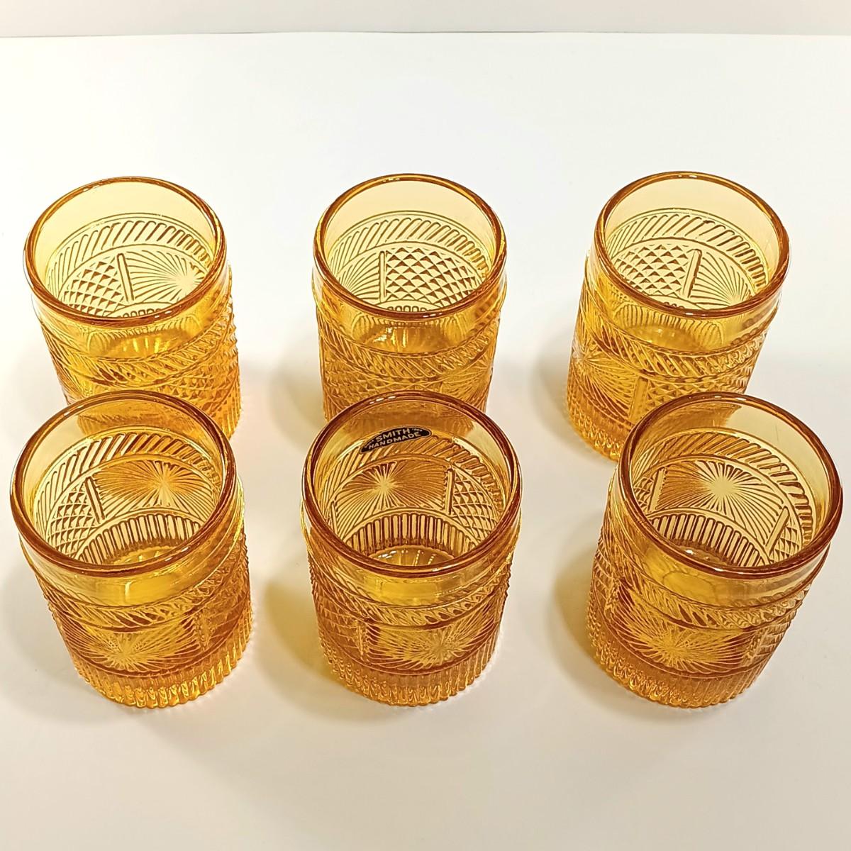LOT 17: Set of 6 Smith Amber Glass Tumblers with an E.G. Booz's Old Cabin Whiskey Bottle and Ashtray