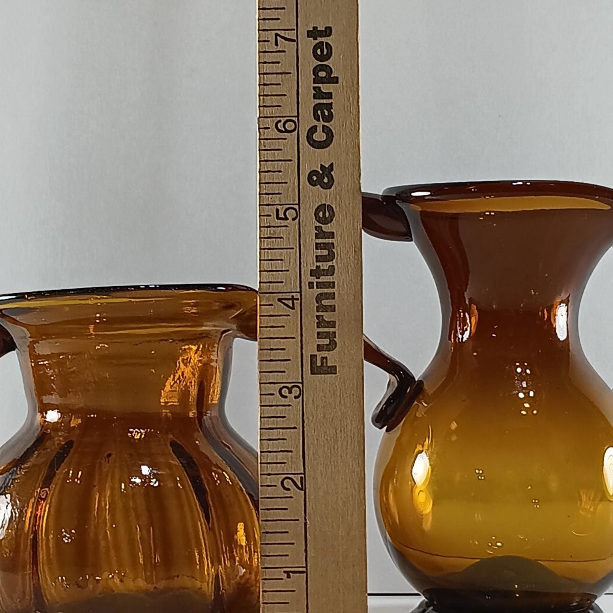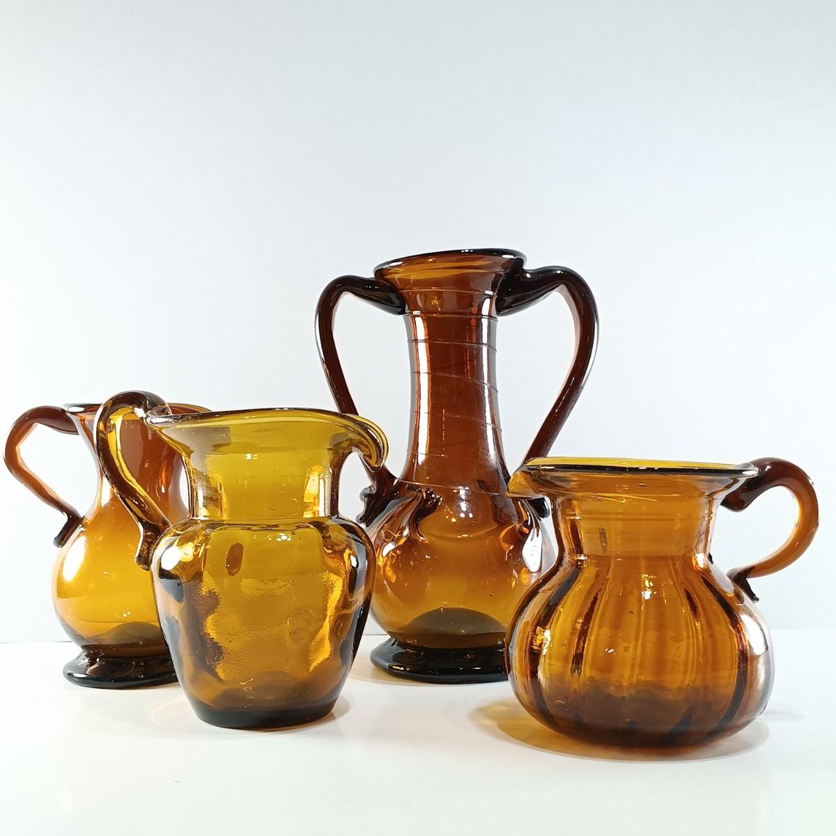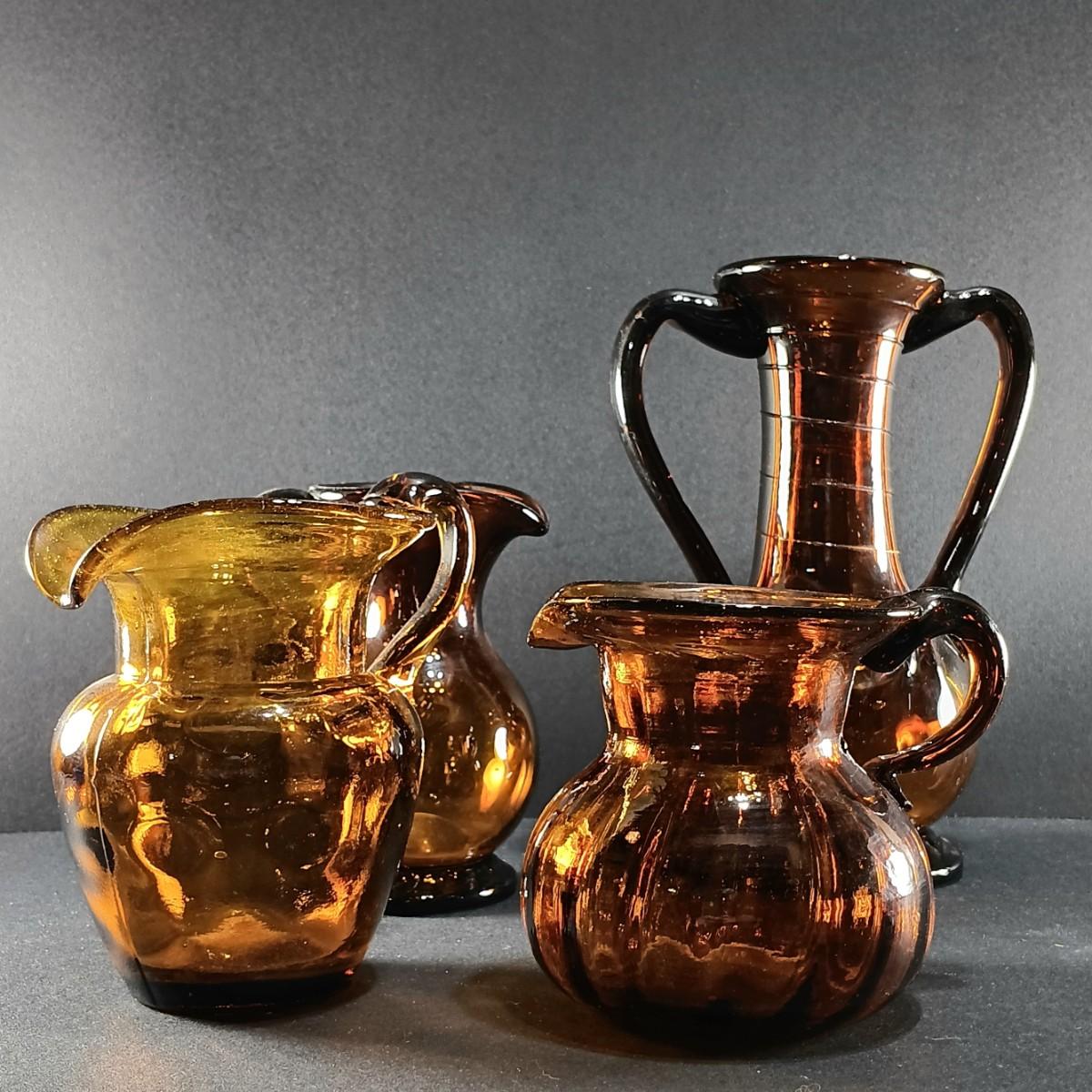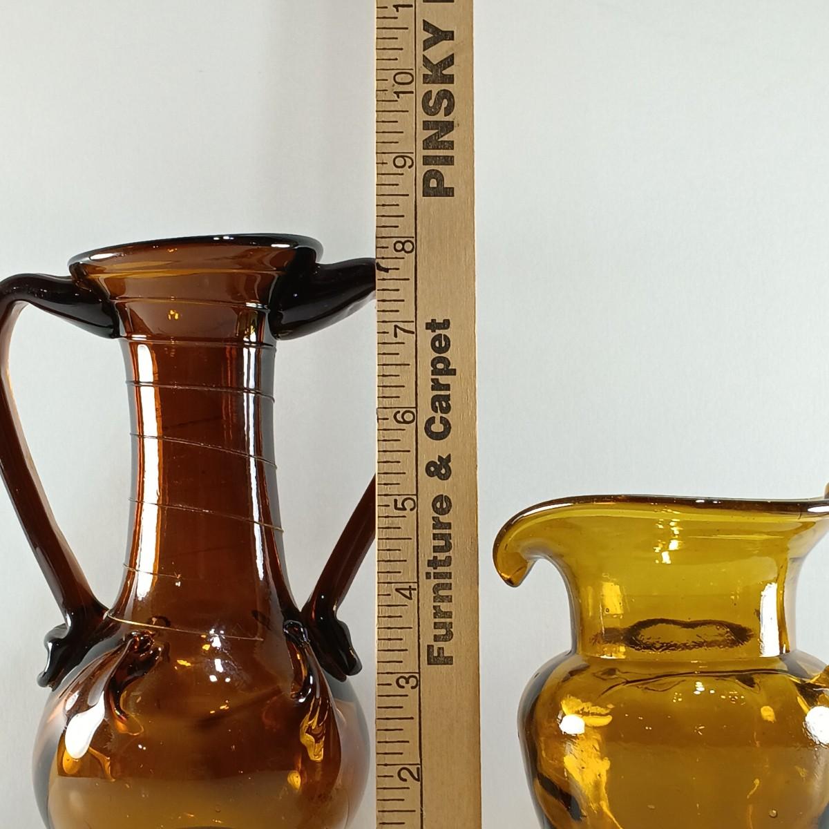 LOT 18: Amber Glass Double Handled Vase with 3 Pitchers