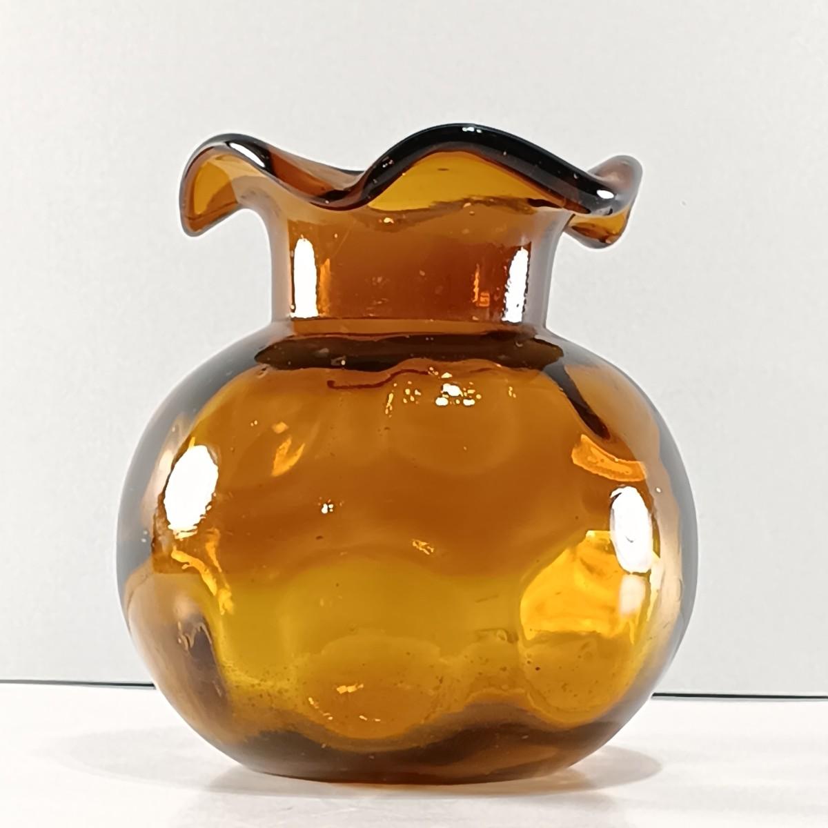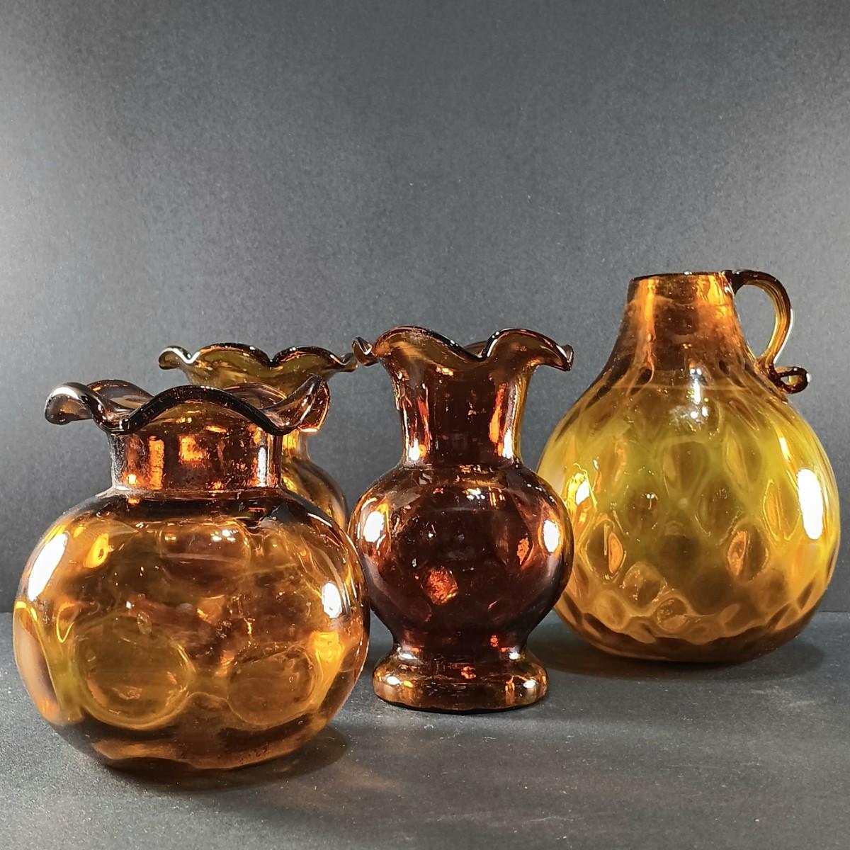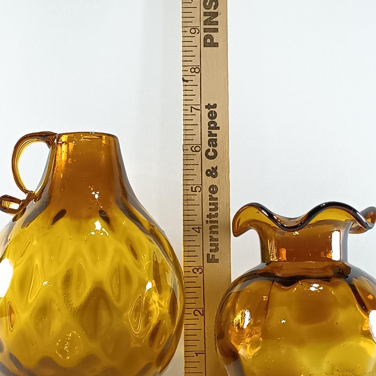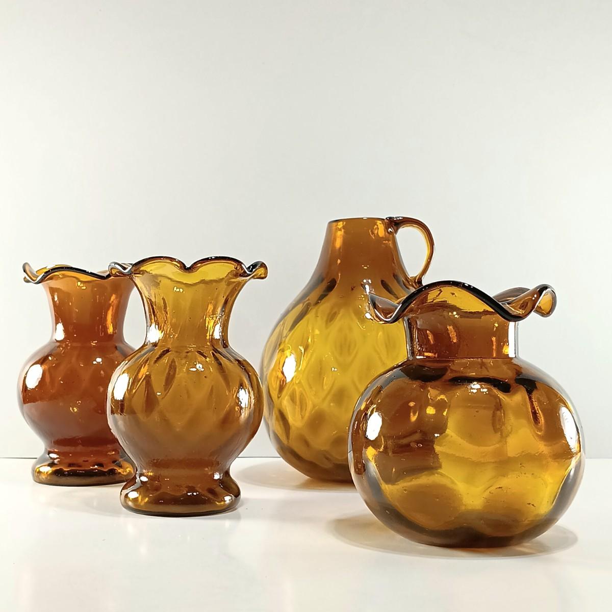 LOT 19: Amber Glass Thumbprint Jug with 3 Ruffle Edged Vases