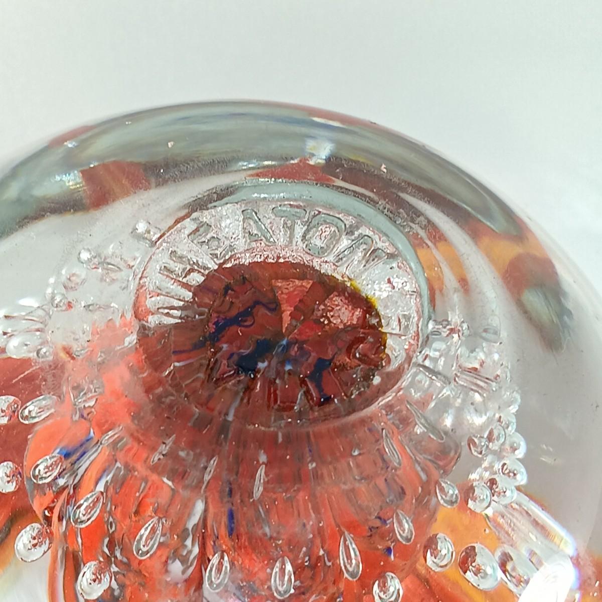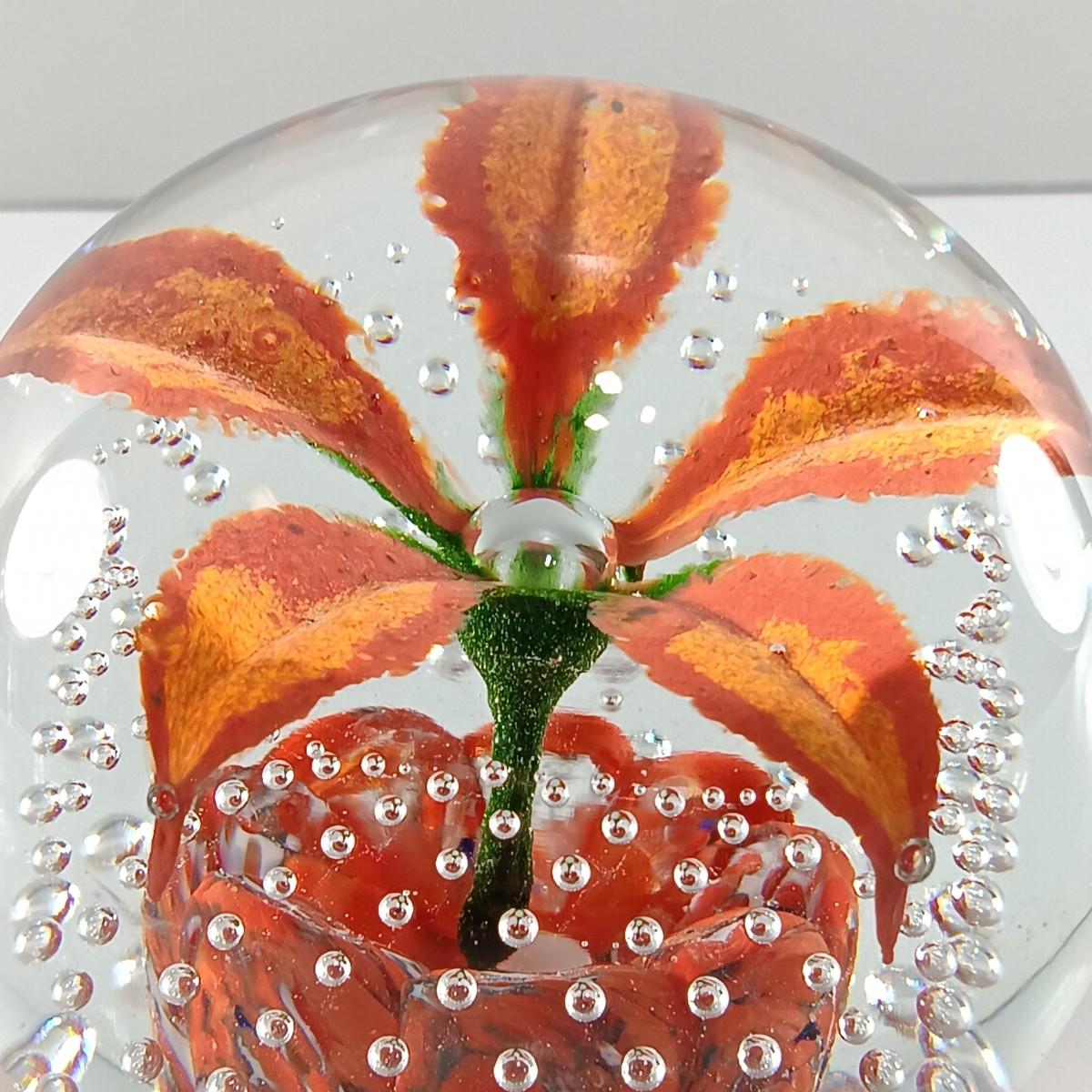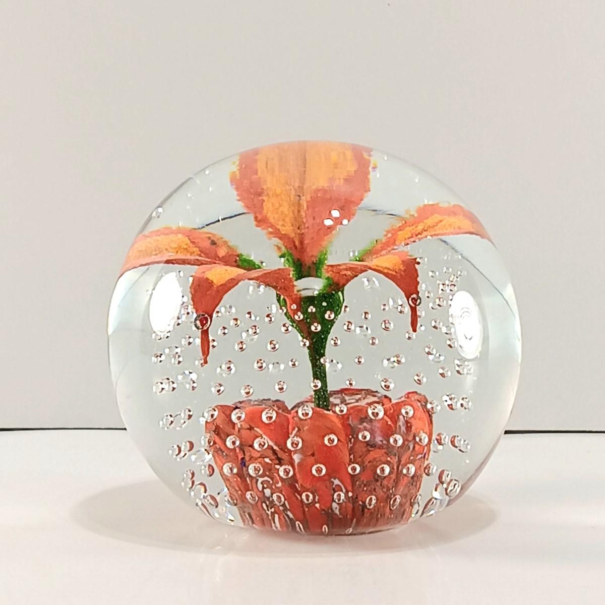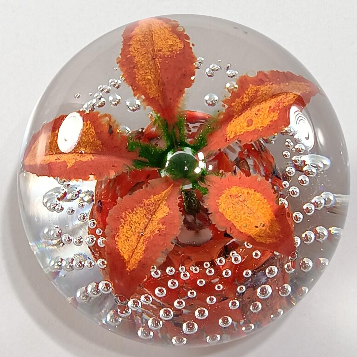 LOT 23: Wheaton Arts Signed Controlled Bubbles Orange Floral Paperweight with Blue and Green Paperweight