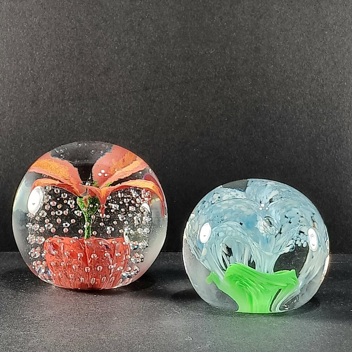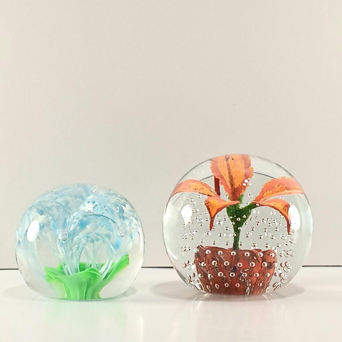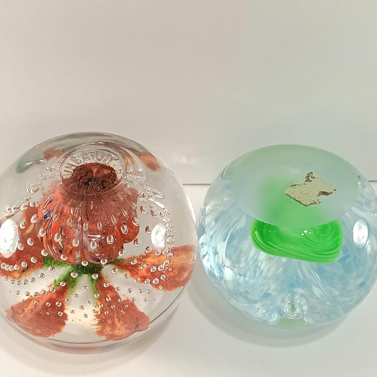 LOT 23: Wheaton Arts Signed Controlled Bubbles Orange Floral Paperweight with Blue and Green Paperweight