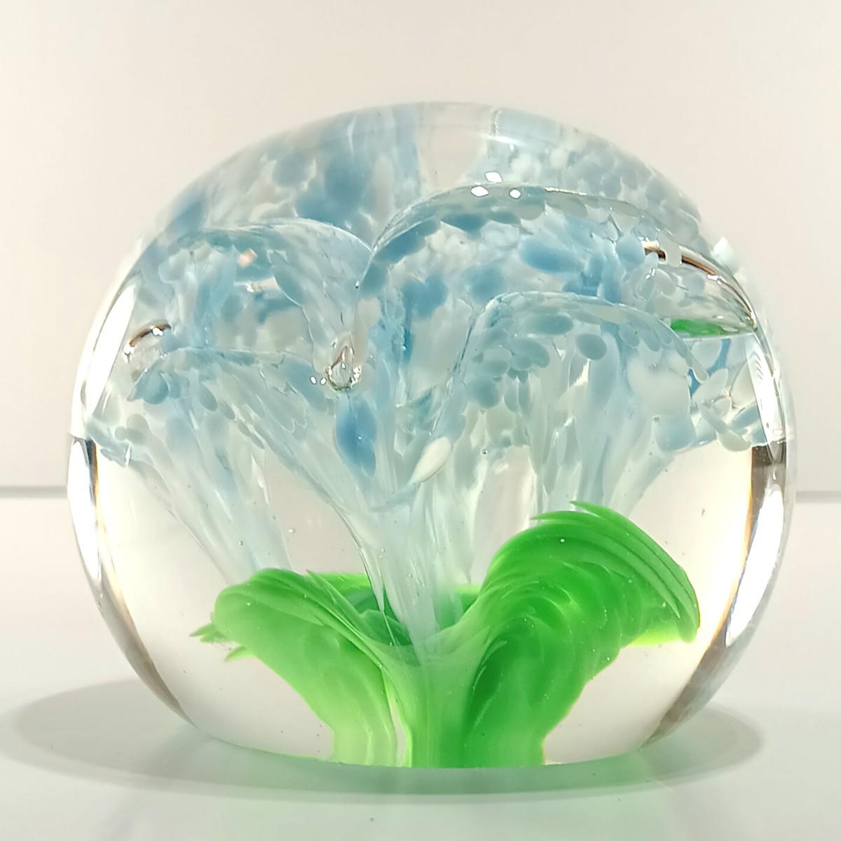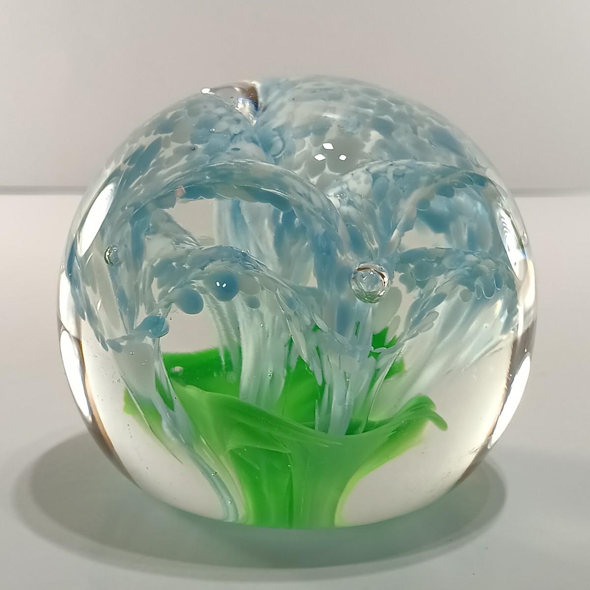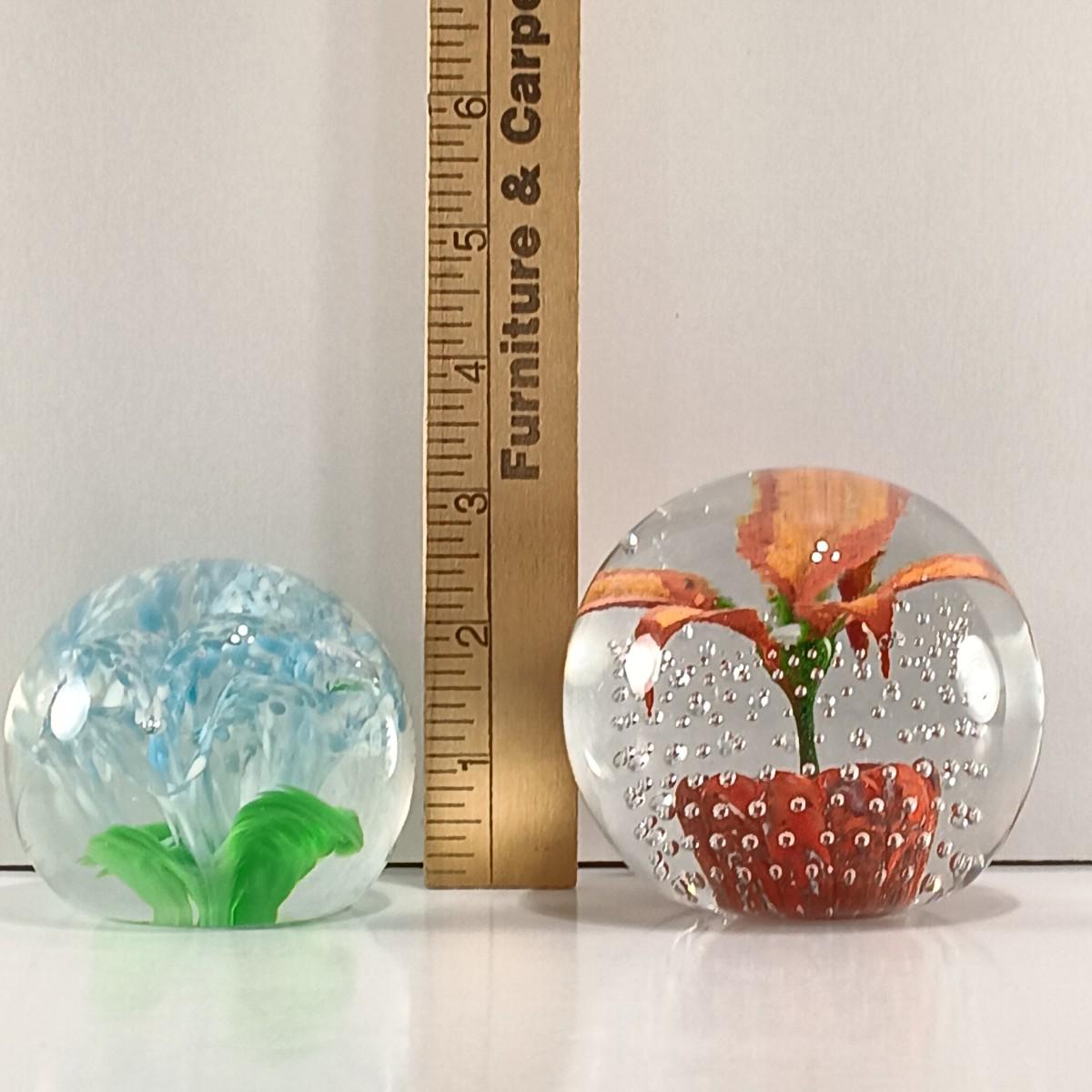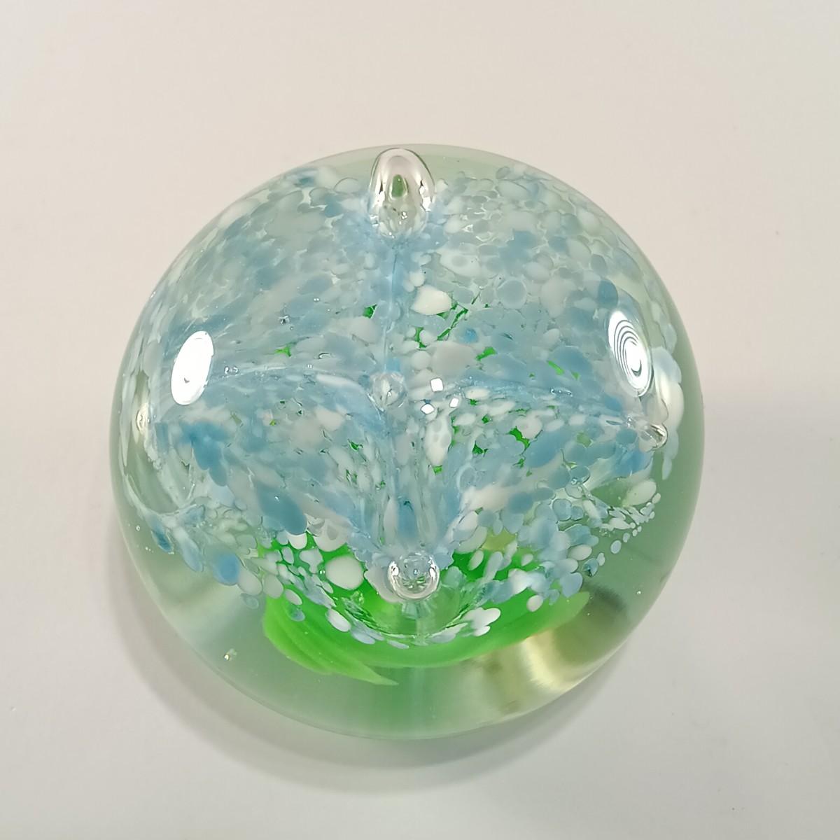 LOT 23: Wheaton Arts Signed Controlled Bubbles Orange Floral Paperweight with Blue and Green Paperweight