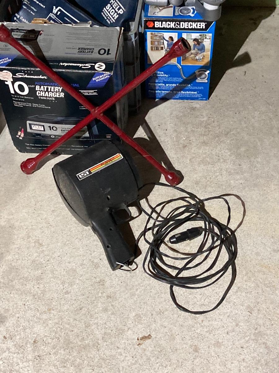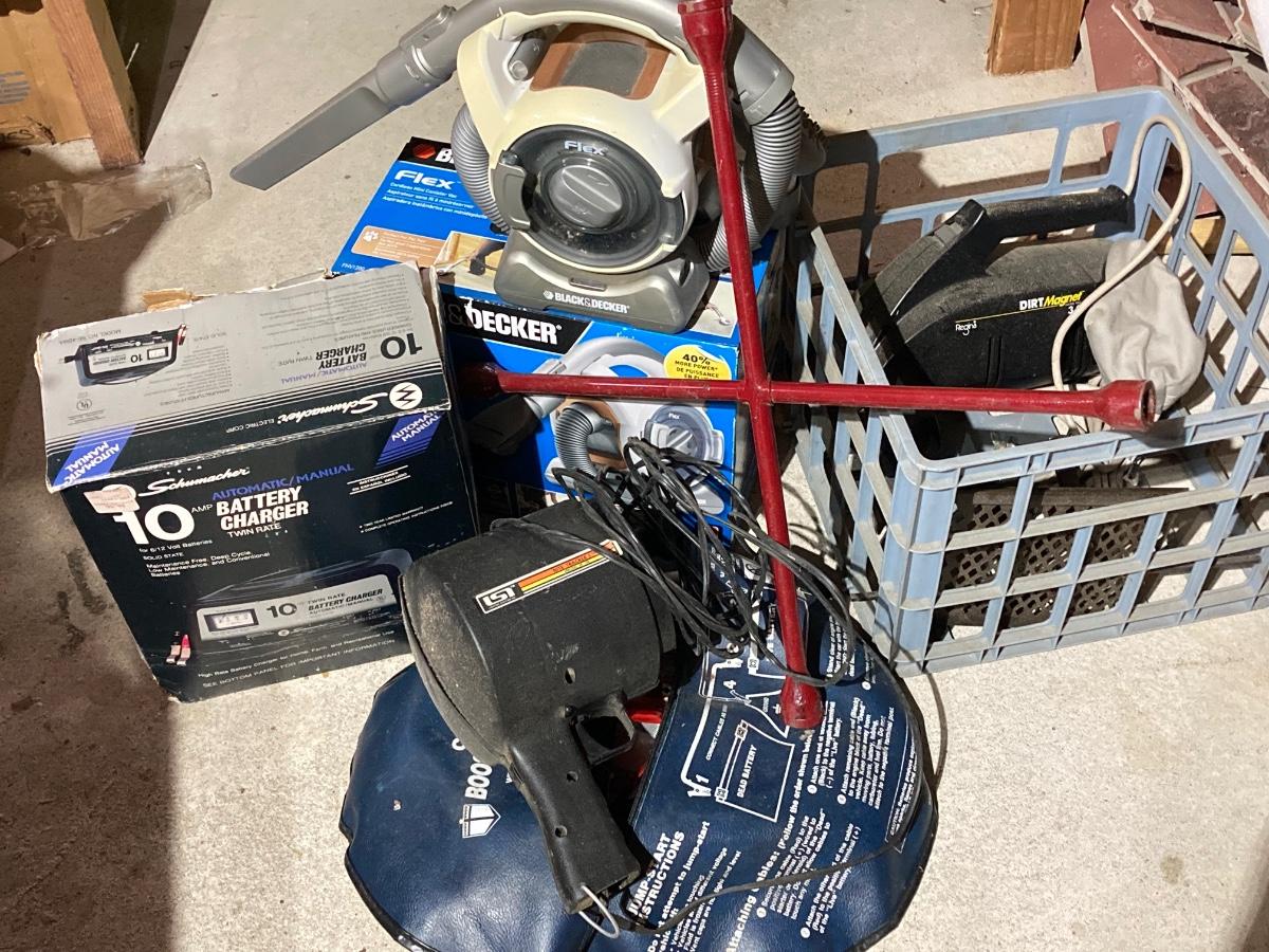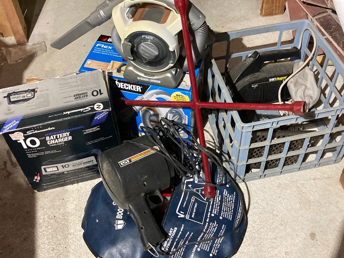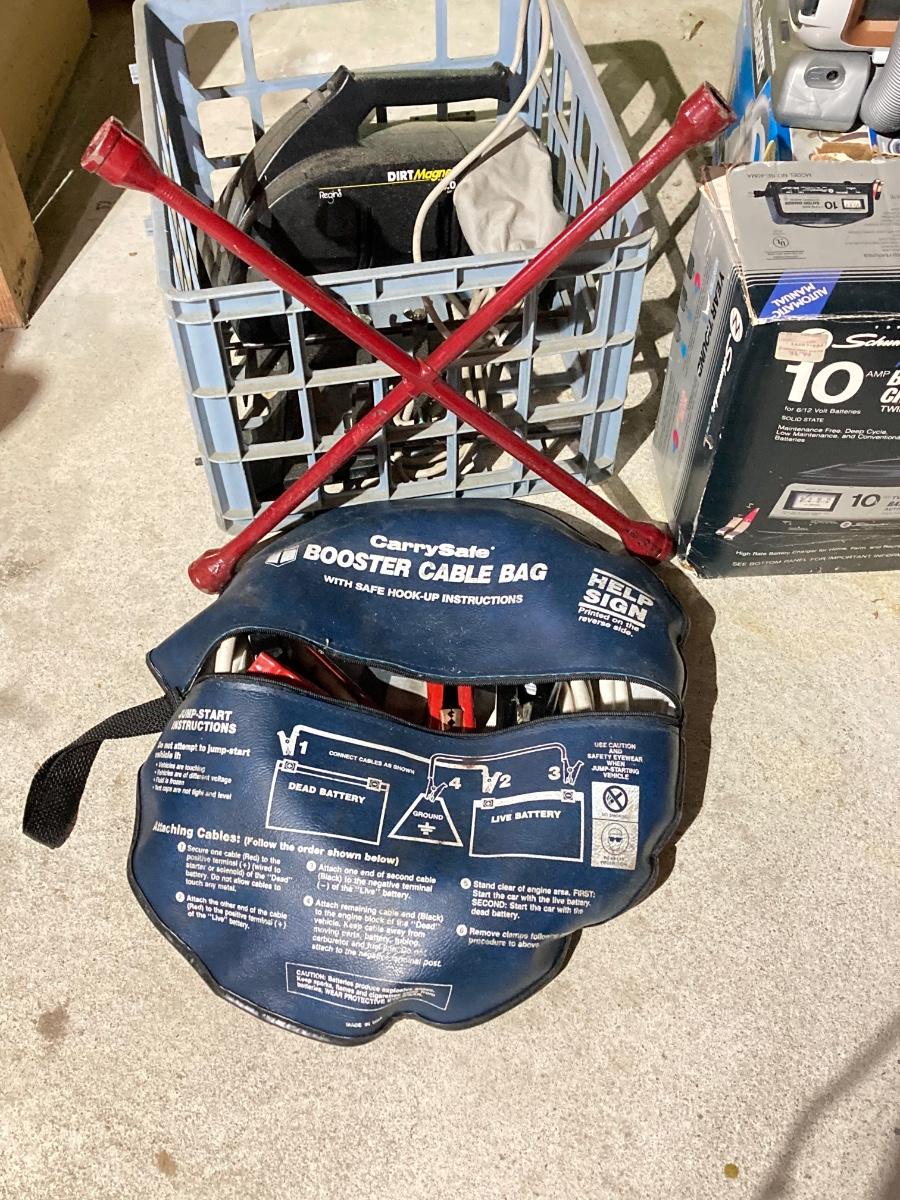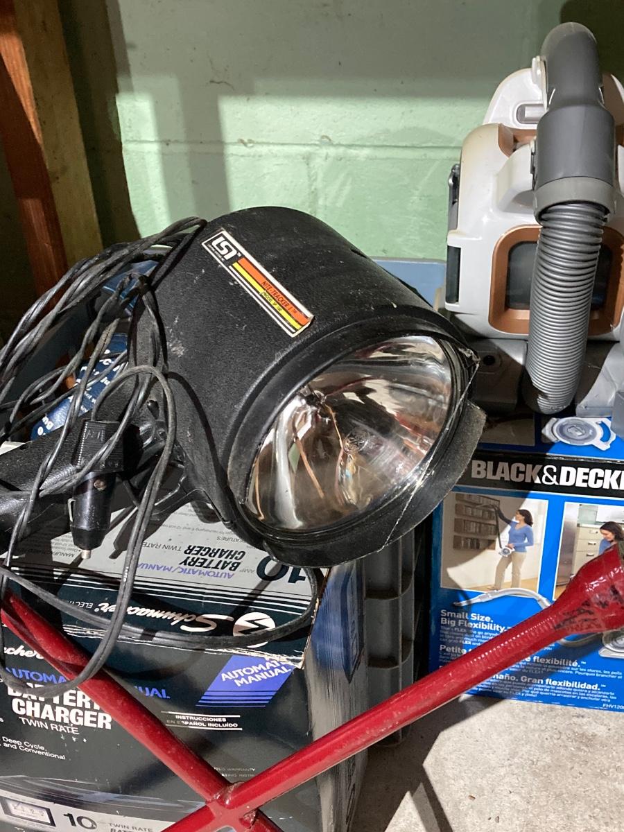 LOT 65: Automobile Lot - Battery Charger, Booster Cables, Nite-Tracker Spot Light, Portable Vacuums and More