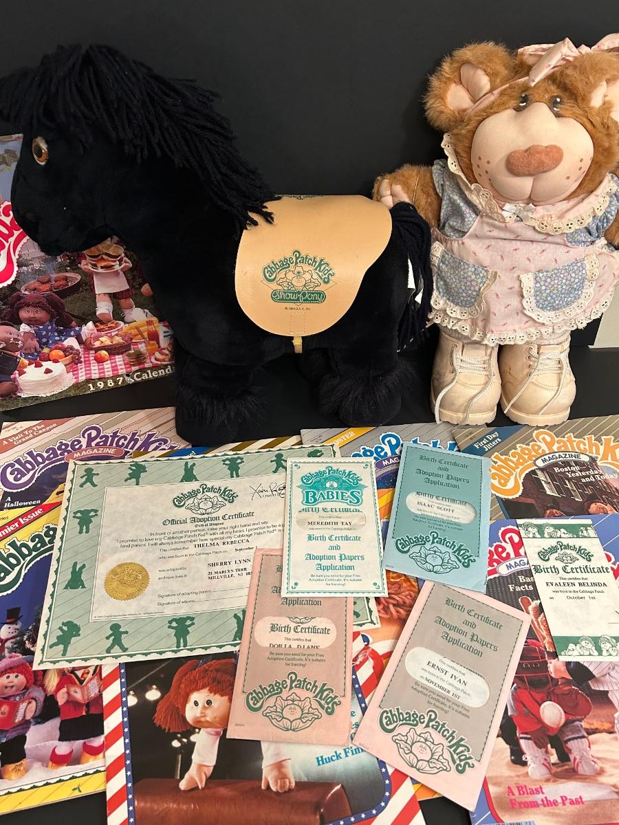 LOT 99DN: Vintage Cabbage Patch Kids Collection - Show Pony, Furskin Doll, Doll Clothes, Calendar and Magazines