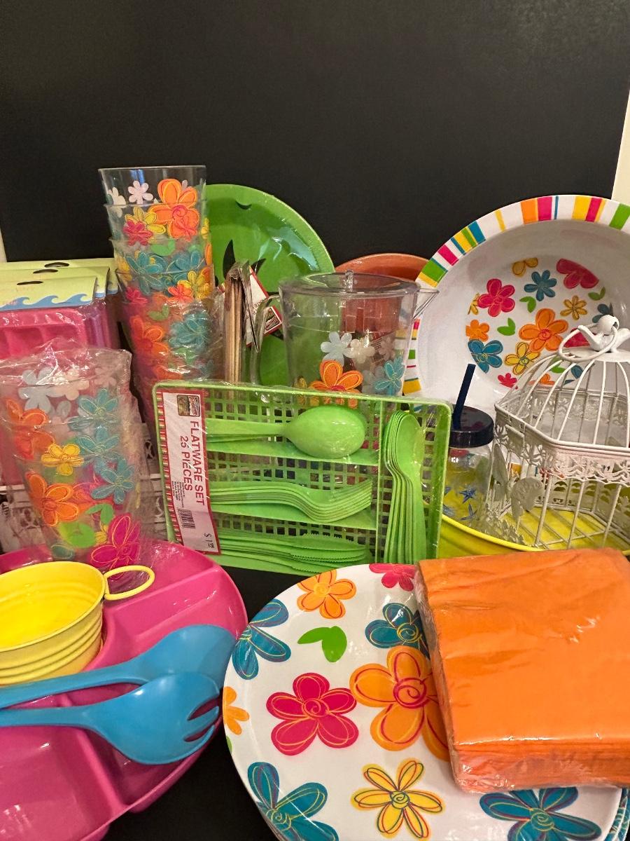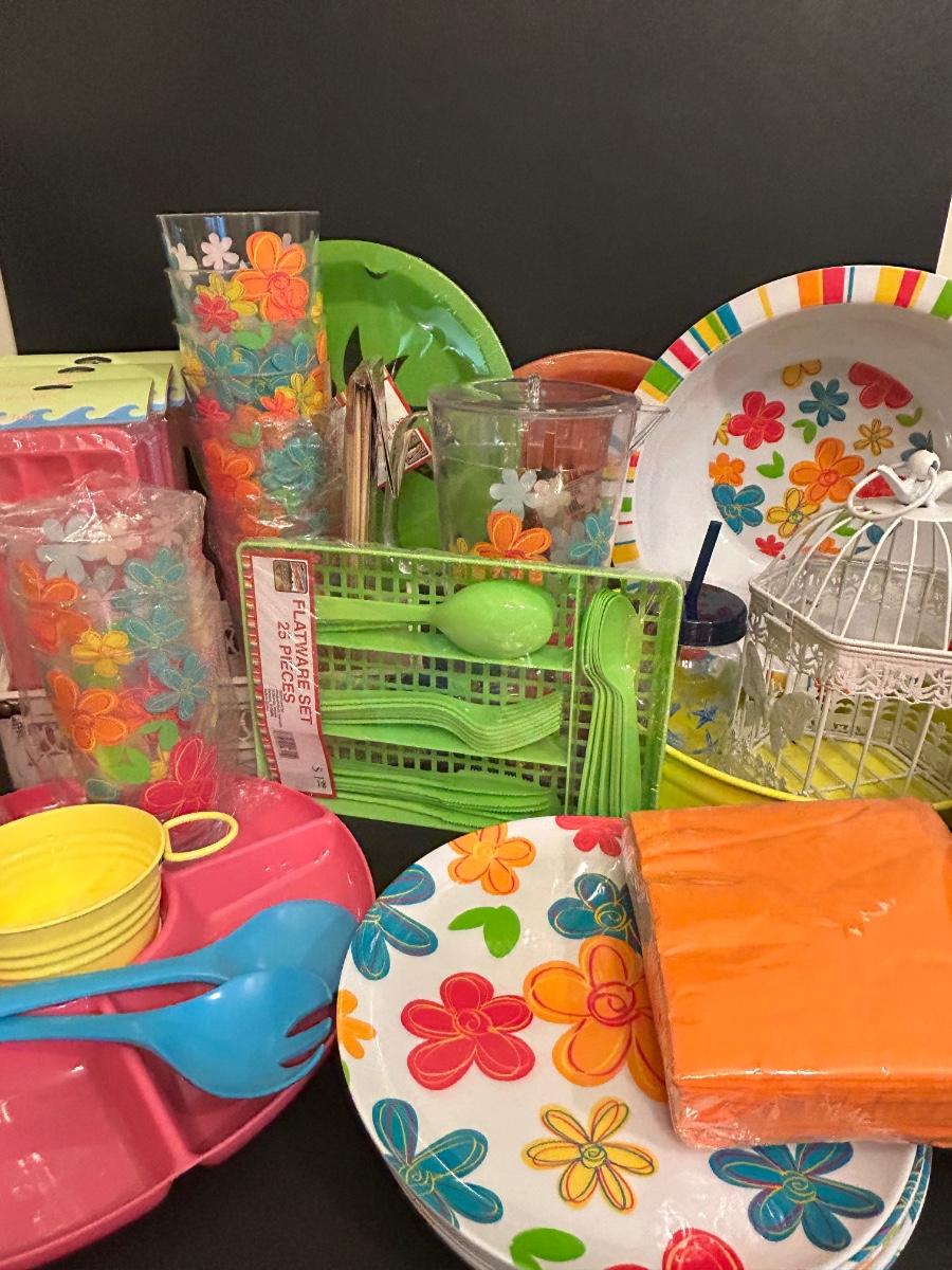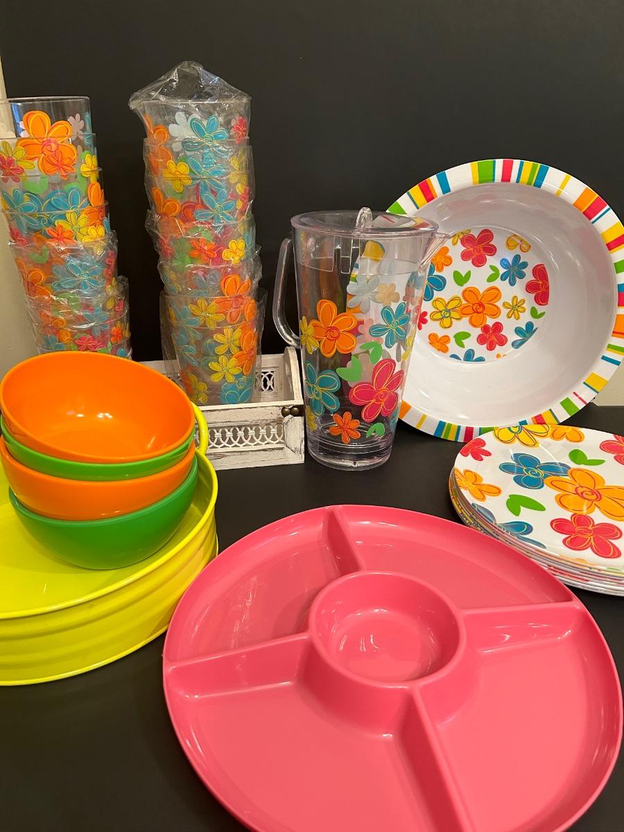LOT 101DN: Summer Outdoor Serving Set - Plastic Pitcher, Cups, Plates, Flatware And More