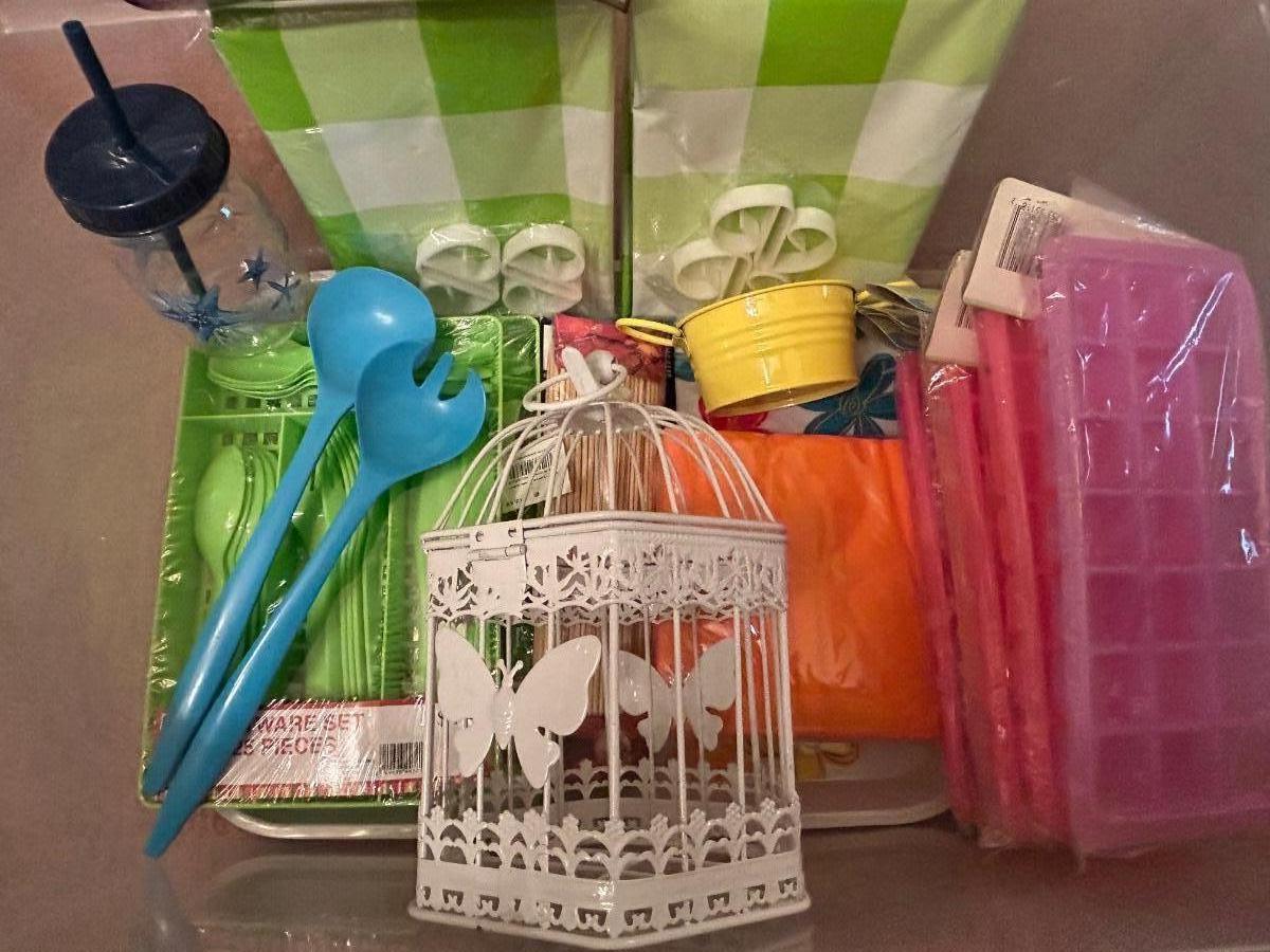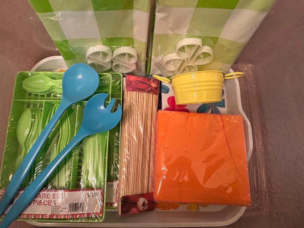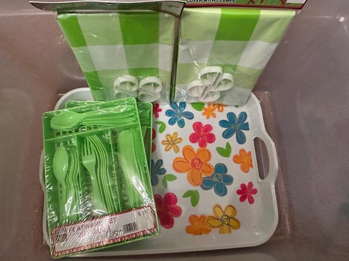 LOT 101DN: Summer Outdoor Serving Set - Plastic Pitcher, Cups, Plates, Flatware And More
