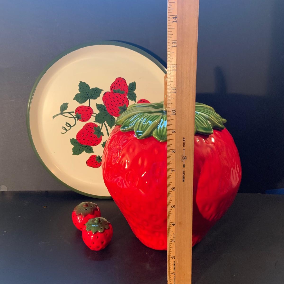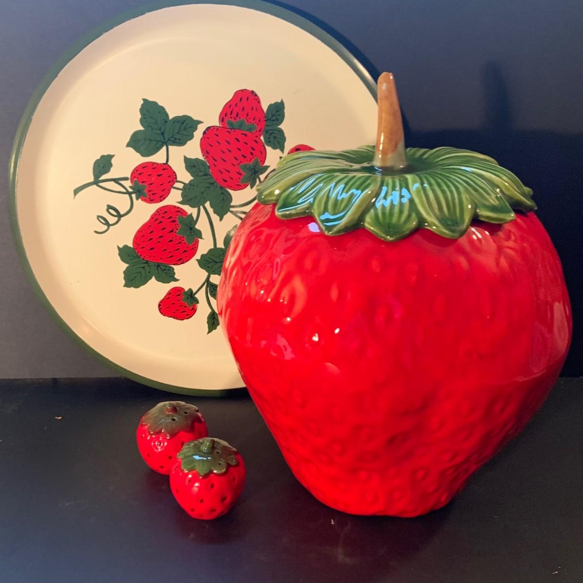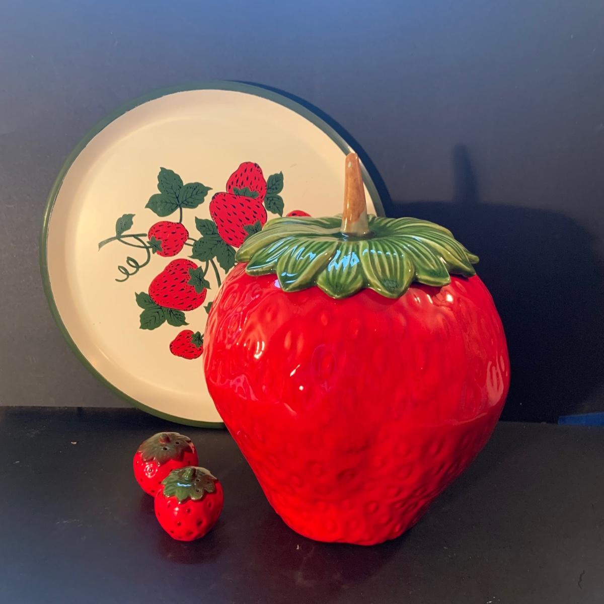 LOT:113: Beautiful Vintage Ceramic Strawberry Cookie Jar, Salt and Pepper Shaker and a Metal Serving Tray