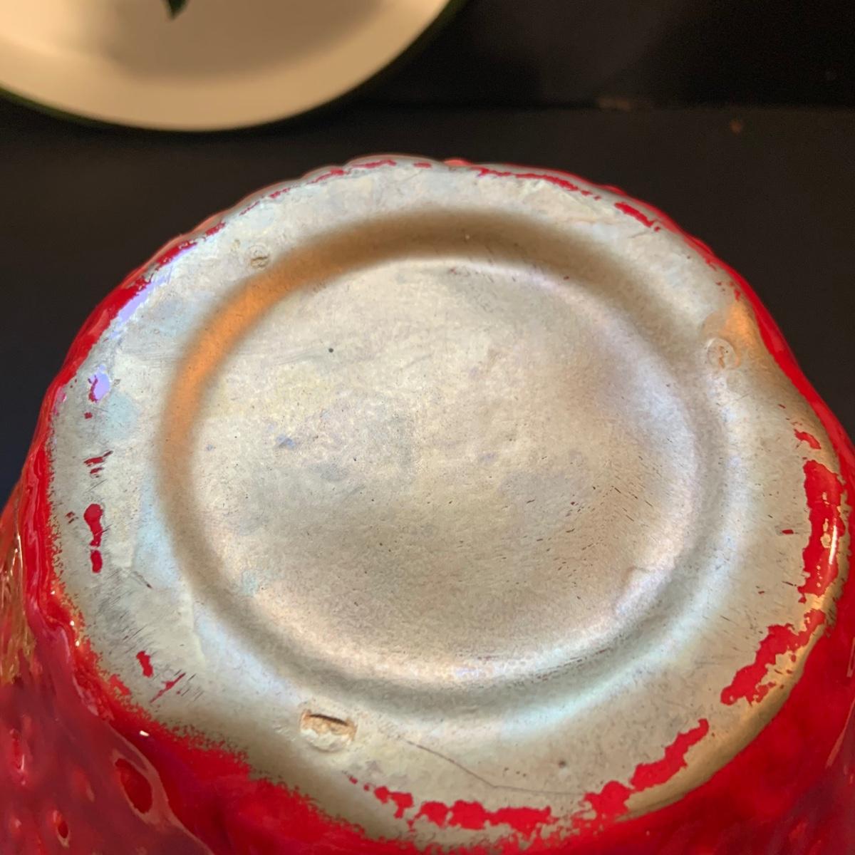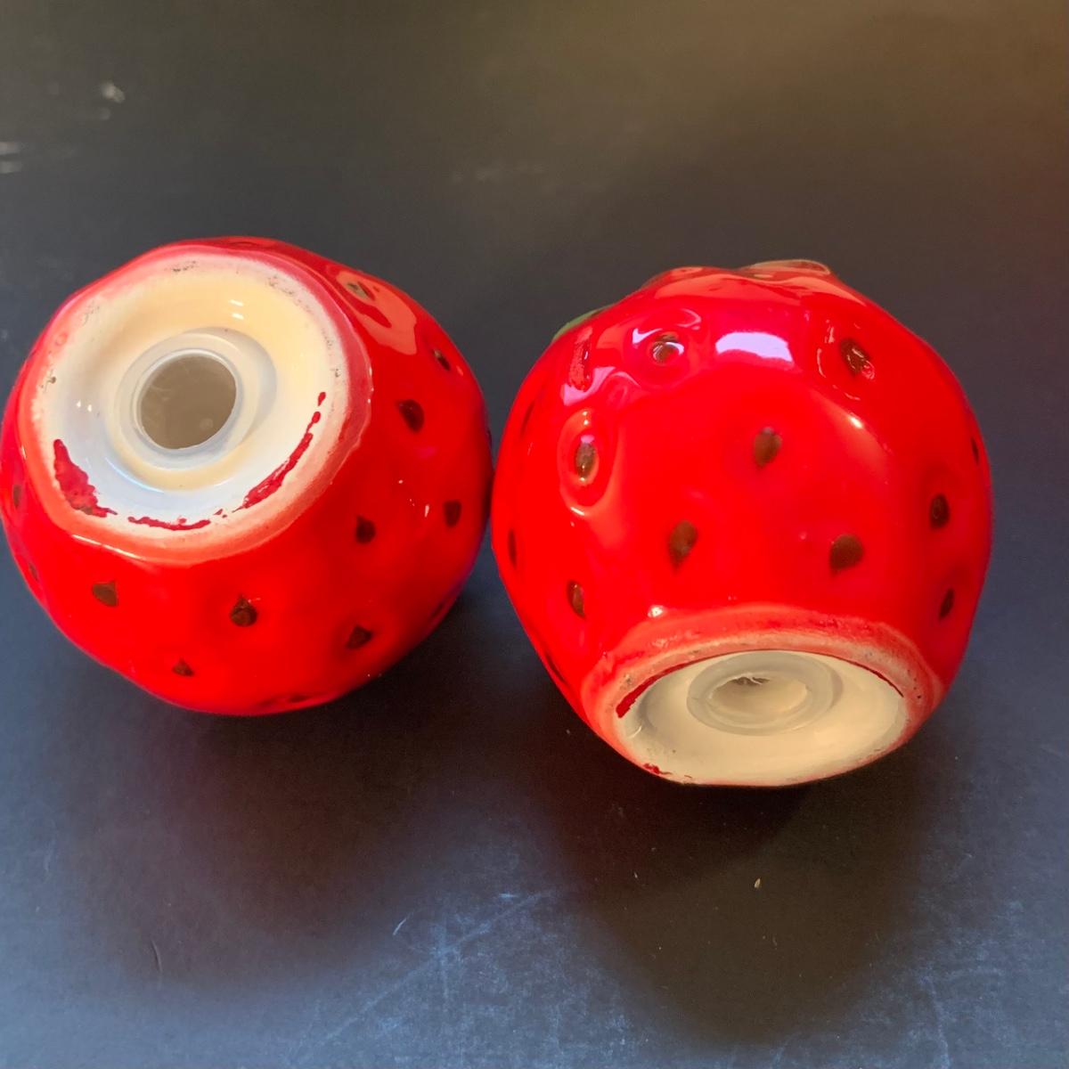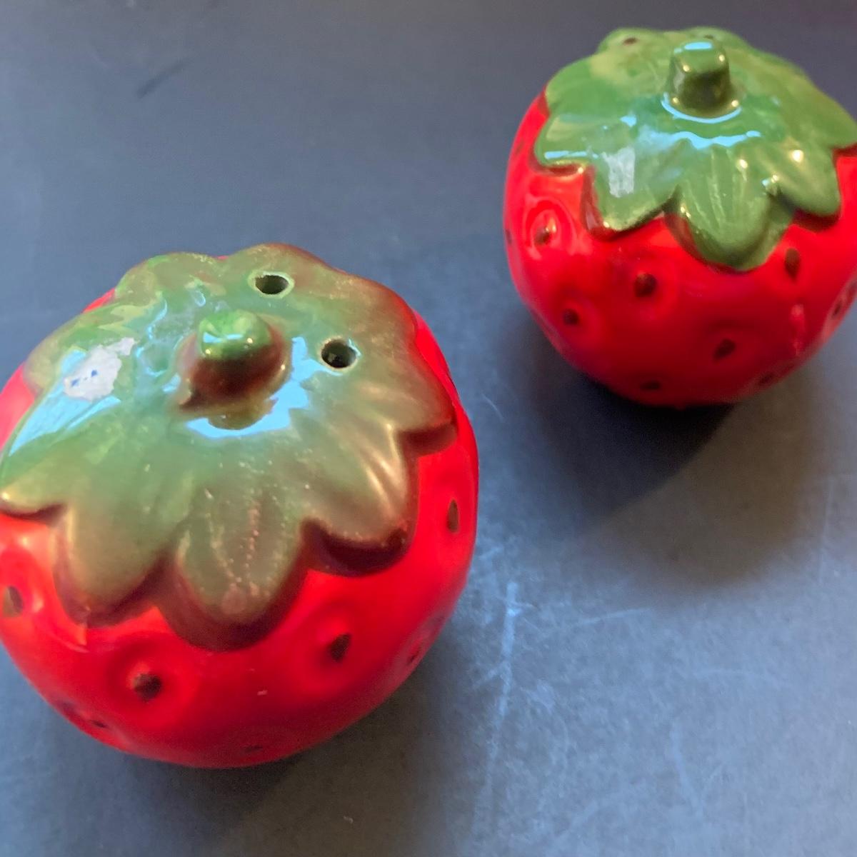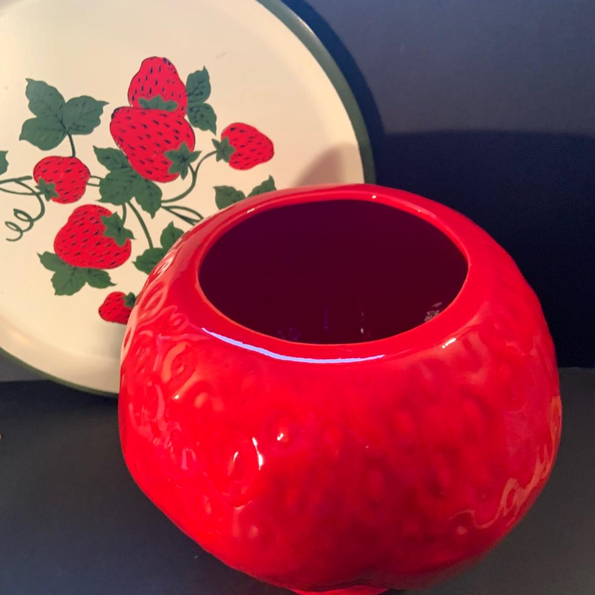 LOT:113: Beautiful Vintage Ceramic Strawberry Cookie Jar, Salt and Pepper Shaker and a Metal Serving Tray