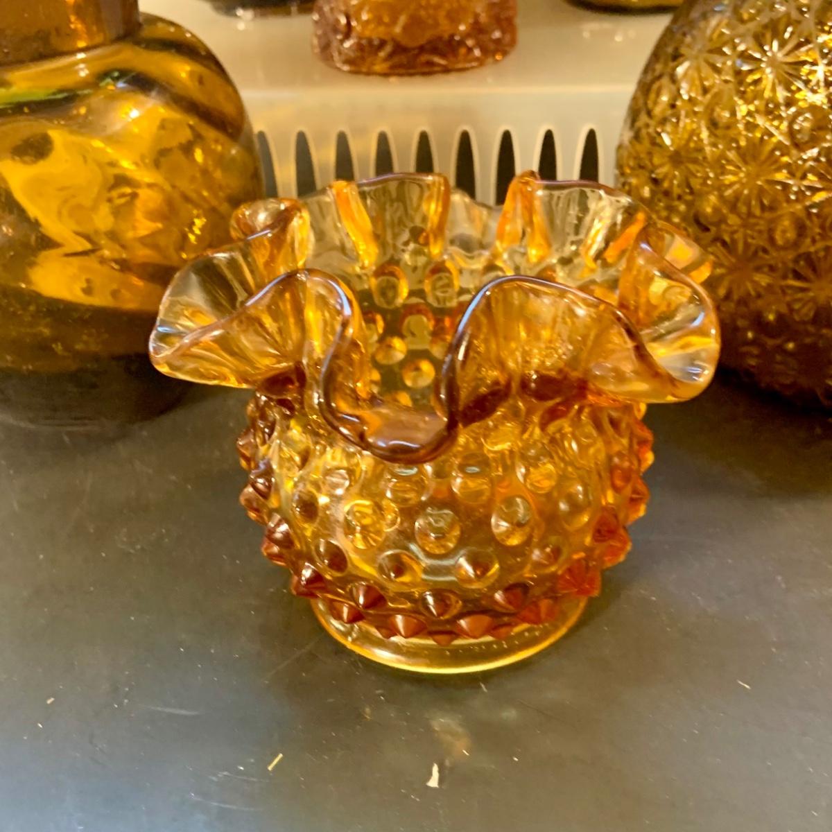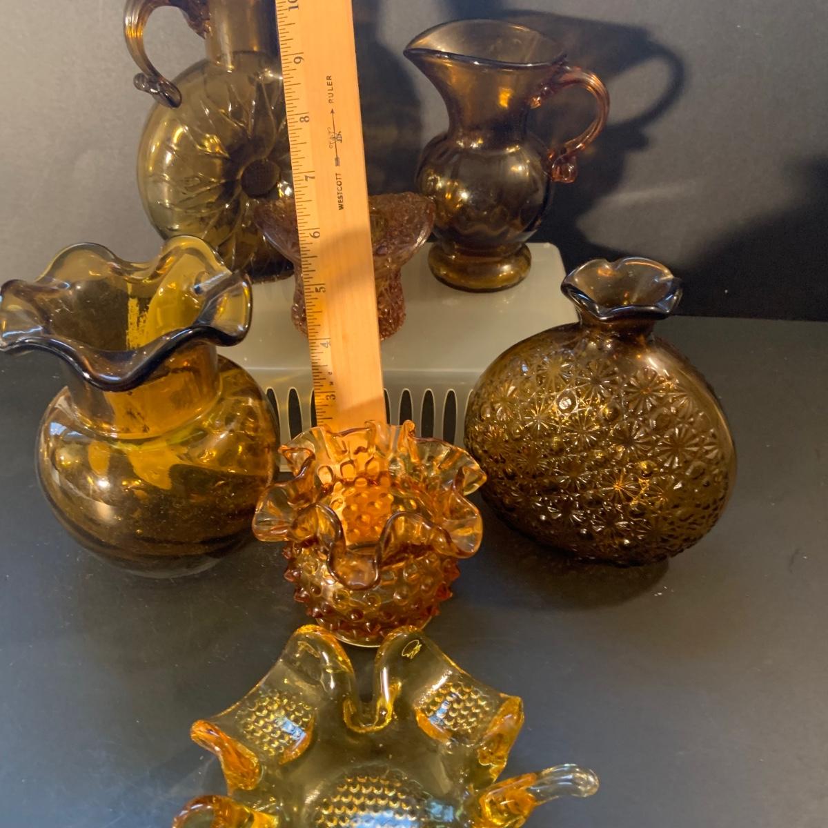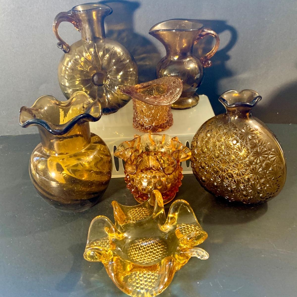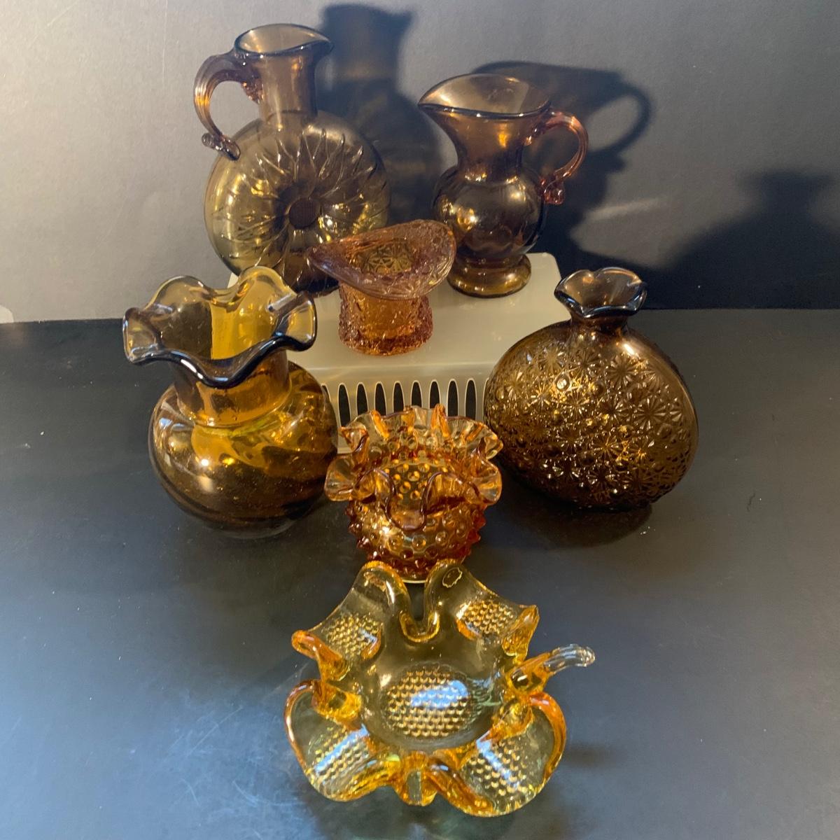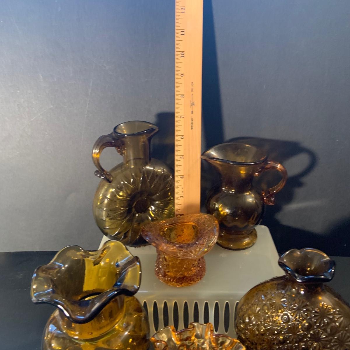 LOT::115: Vinage Amber Glass Bottles Jugs, Vases and More