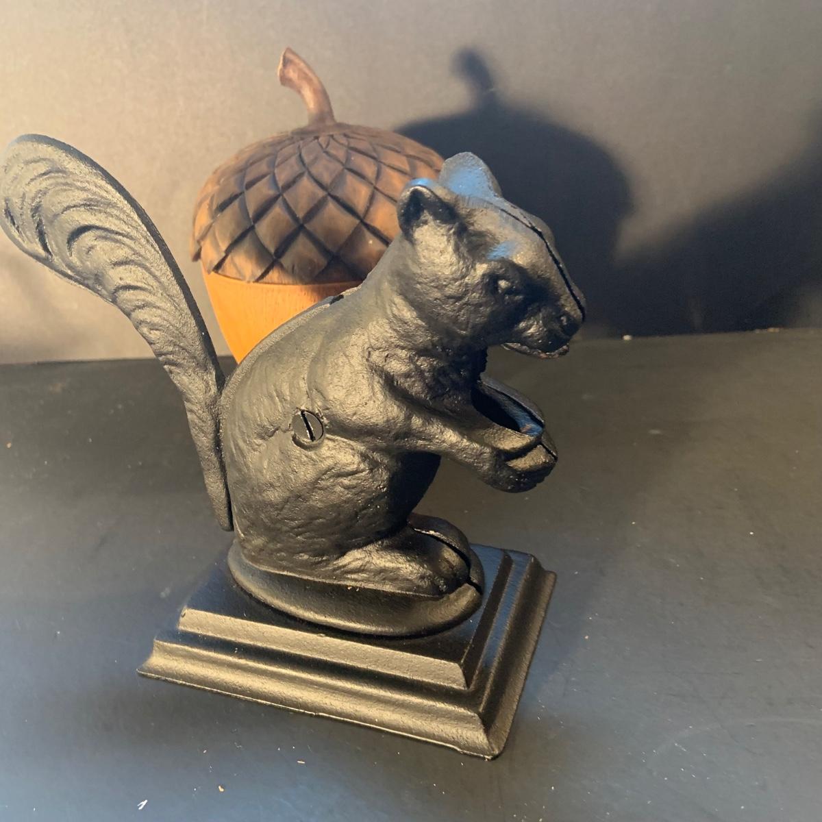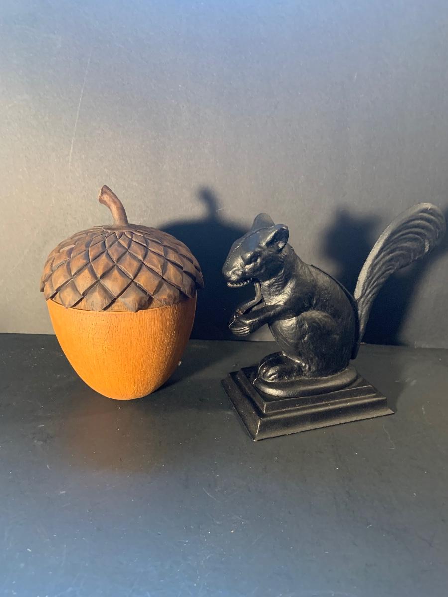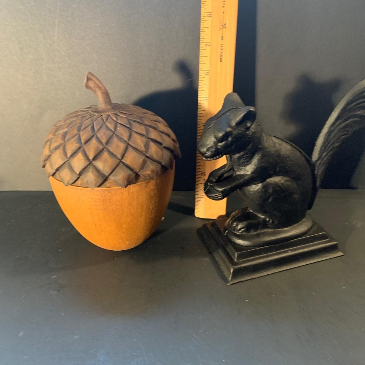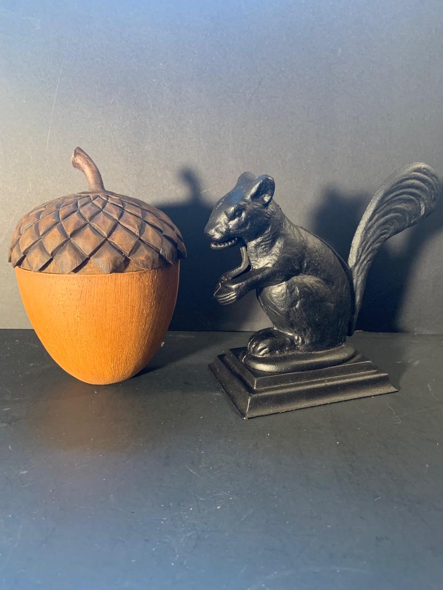 LOT:119: Cast Iron Squirrel Nut Cracker and Lillion Vernon Acorn Shaped Box