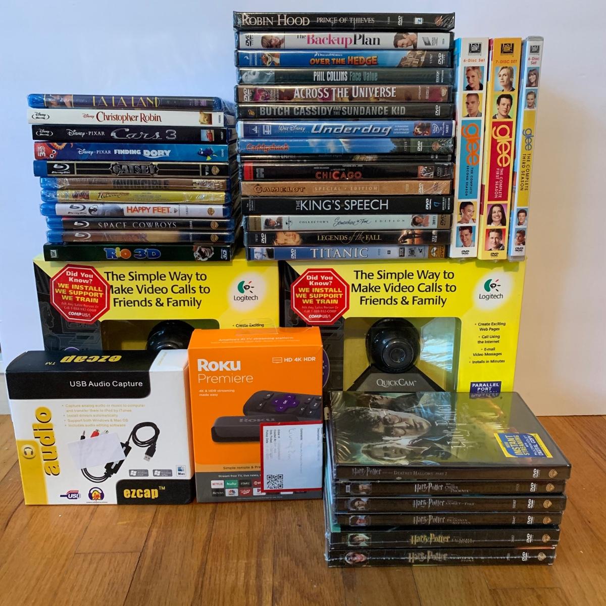 LOT 149: Unopened/New DVDs & Blue Rays, Roku TV, Logitech Quick Cam VC & Audio USB Capture