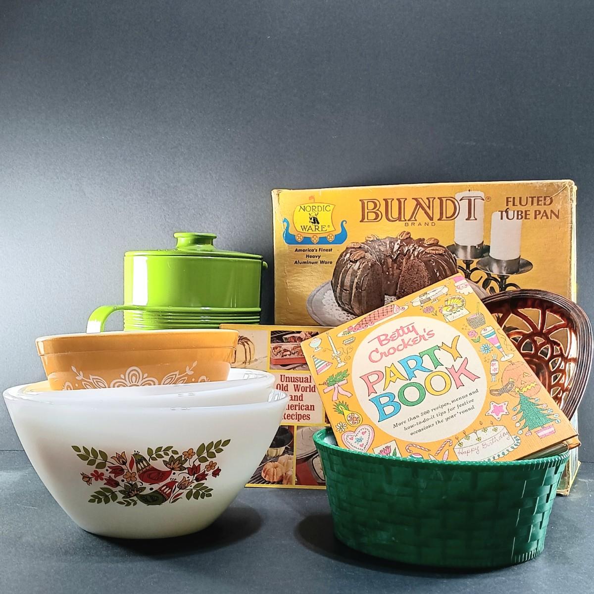 LOT 203: Vintage Pyrex Butterfly Bowls, Arcopal French Milk Glass Partridge Bowls, Nordic Ware Bundt Pan & More