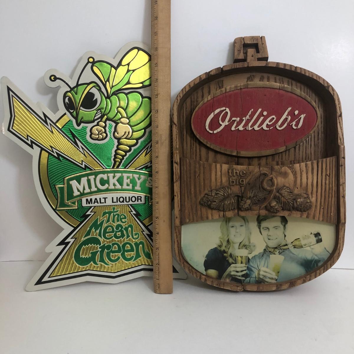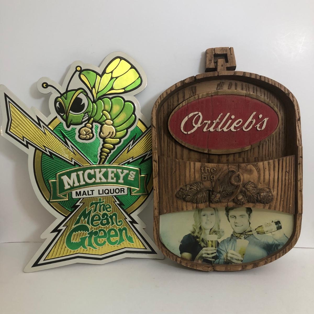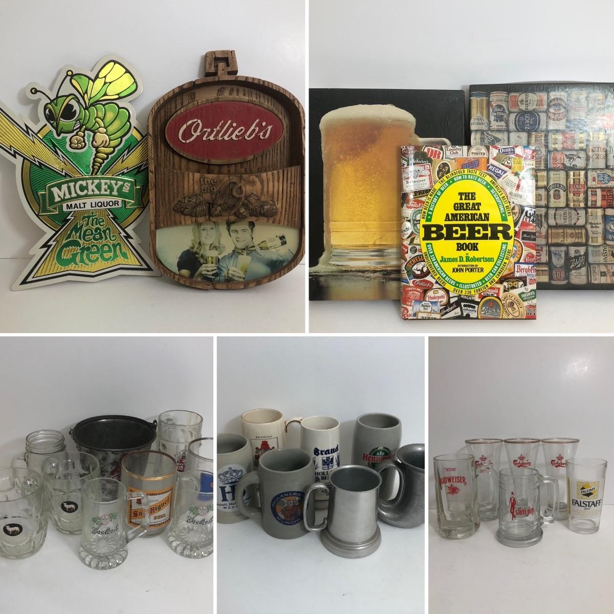 LOT 8A: Beer Lovers' Collection - Embosograph Display Mfg Co Mickey's Malt Liquor Sign, Ortliebs Sign, The Great American Beer Book, Branded Glass Mugs, Ceramic Steins & More