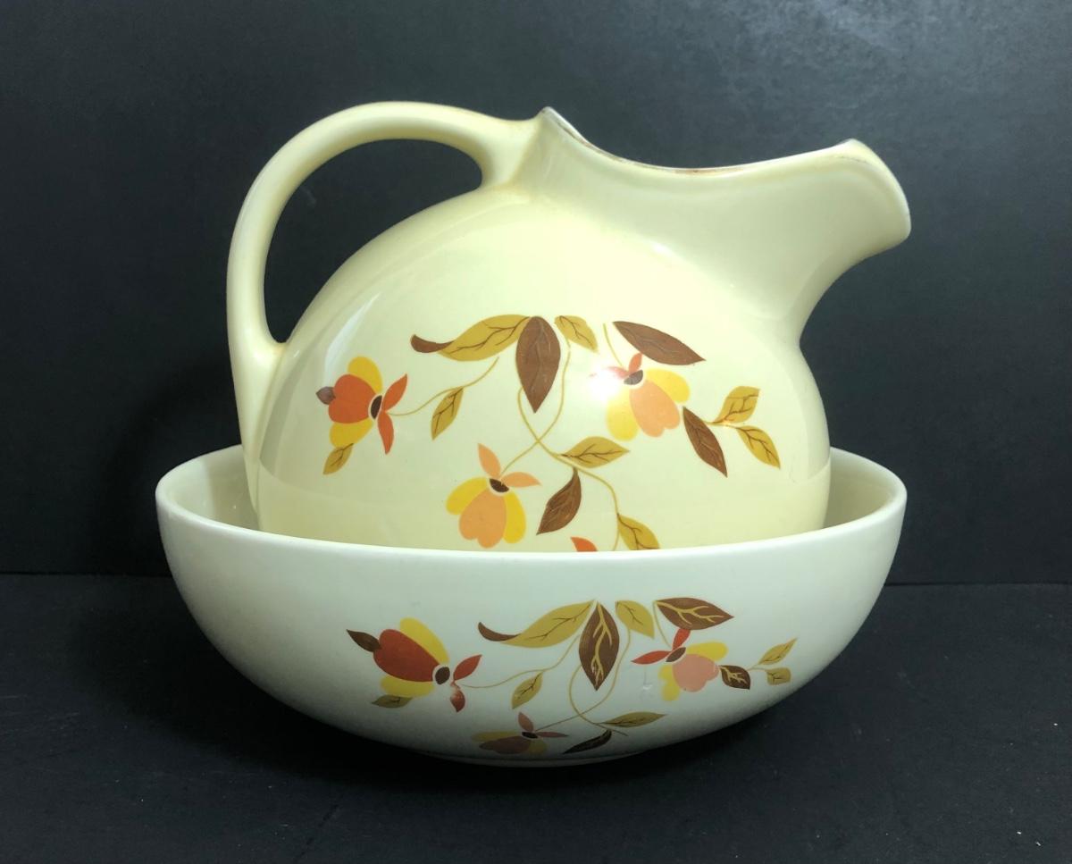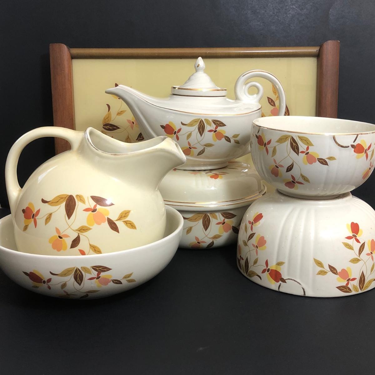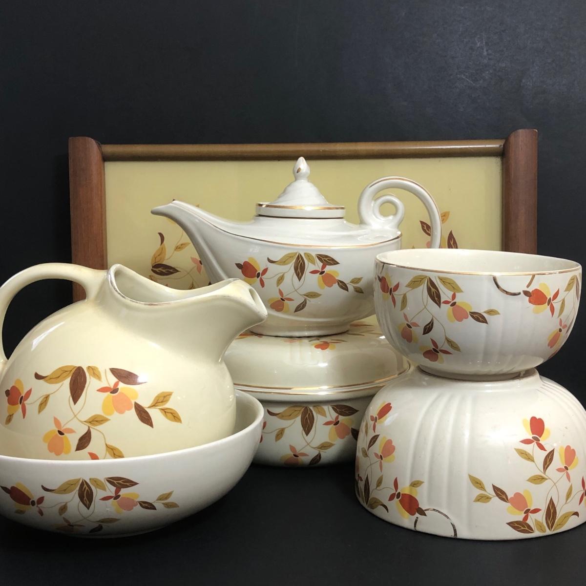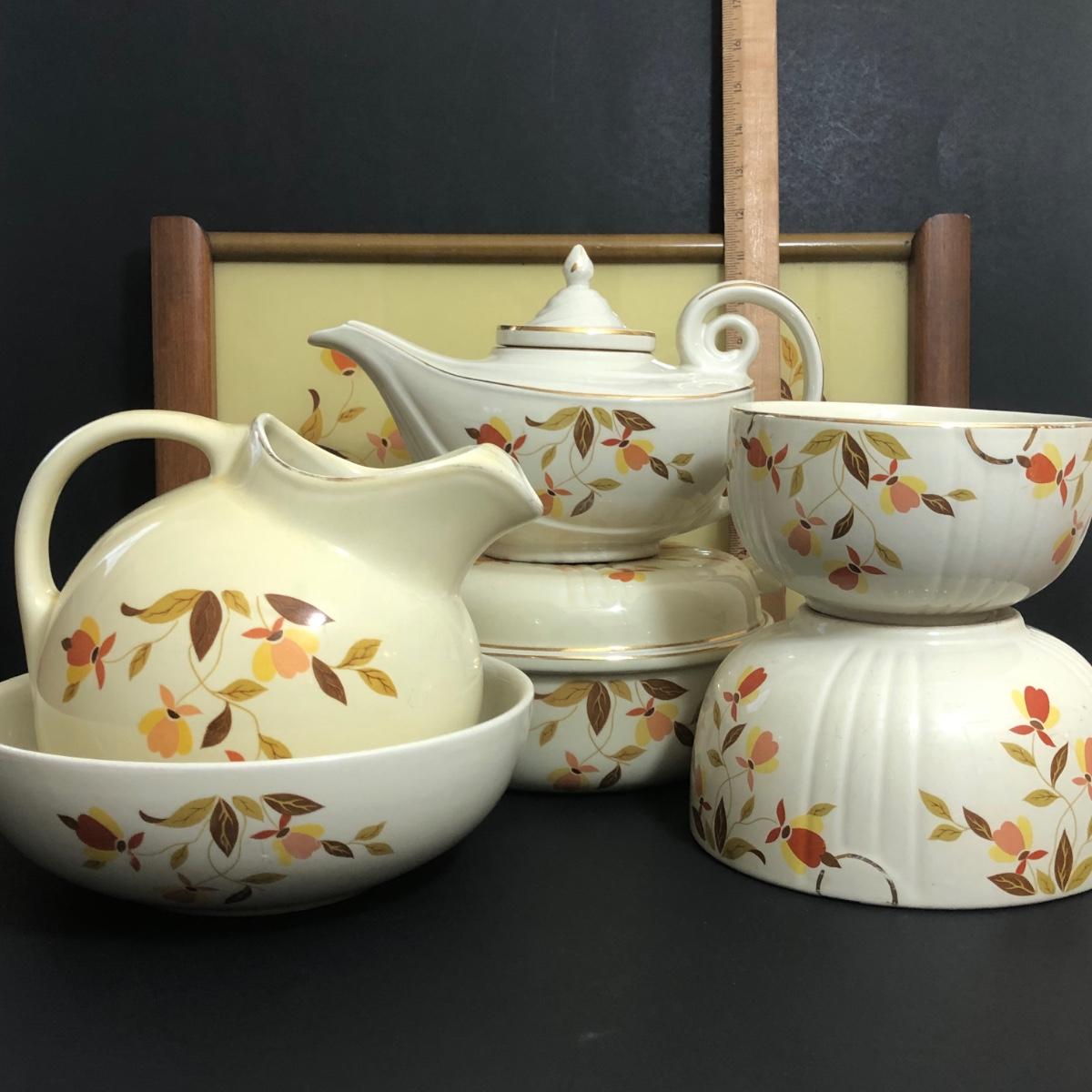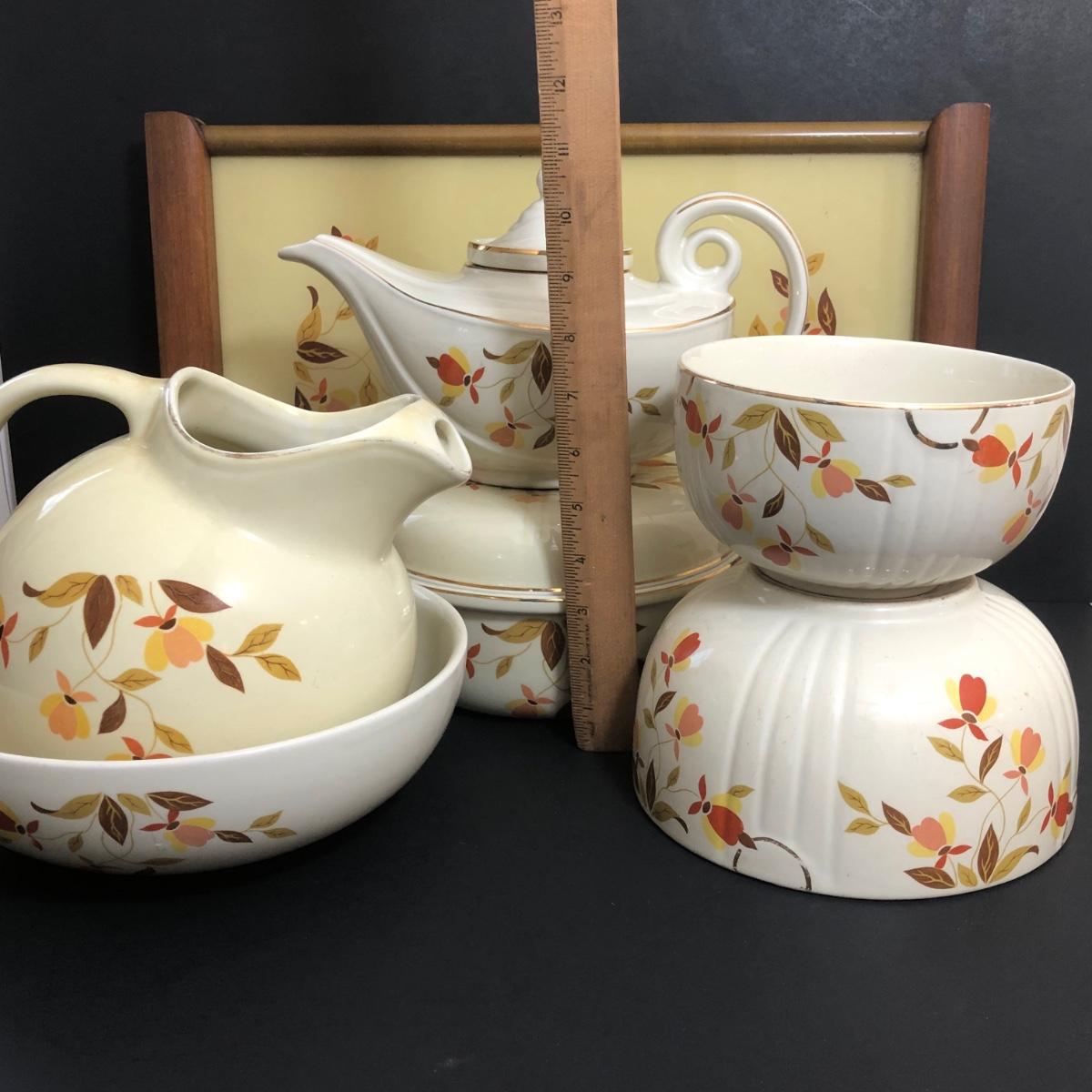 LOT 9A: Vintage Hall Jewel Tea Autumn Leaf Collection - Teapot w/ Strainer, Ball Pitcher, Bowls & Wooden Tray