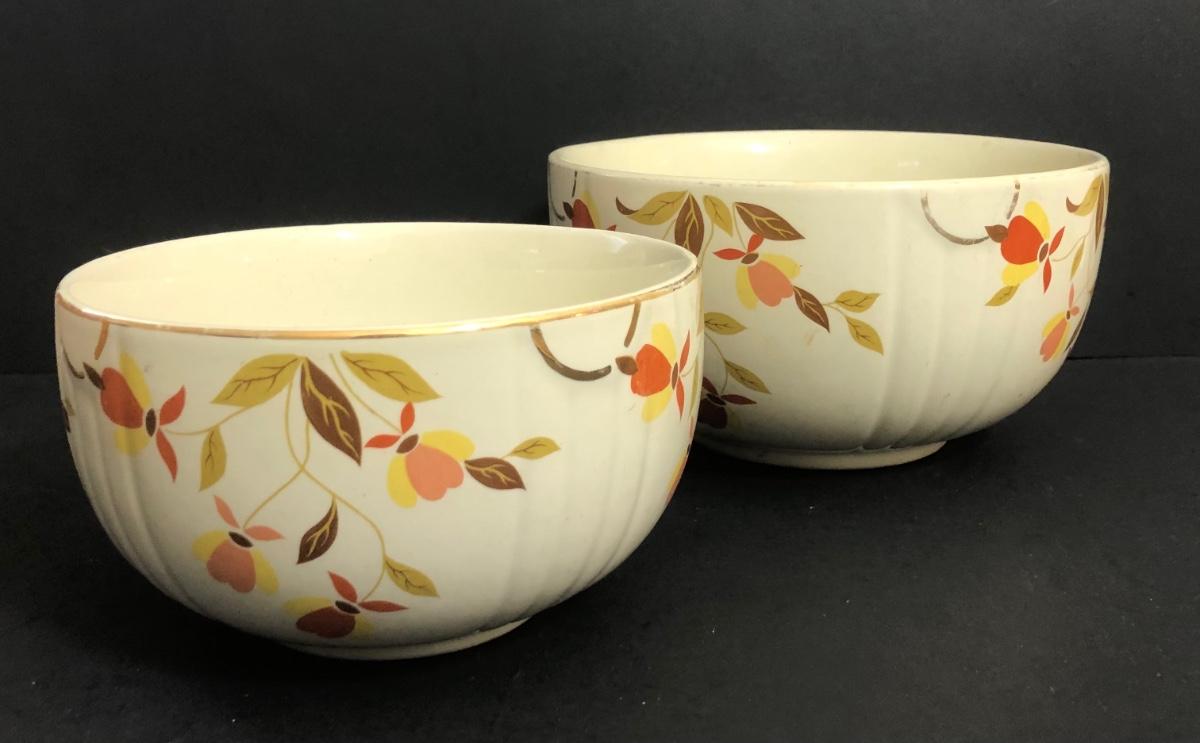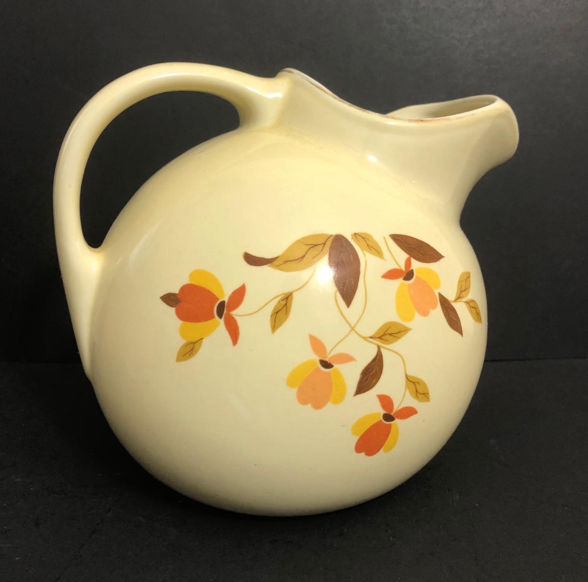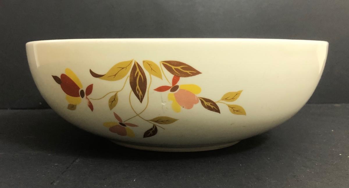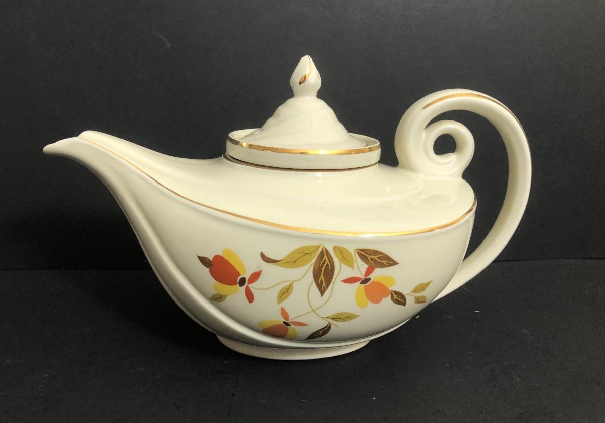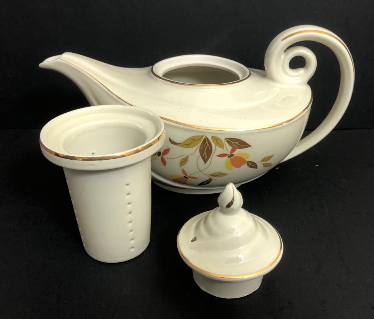 LOT 9A: Vintage Hall Jewel Tea Autumn Leaf Collection - Teapot w/ Strainer, Ball Pitcher, Bowls & Wooden Tray