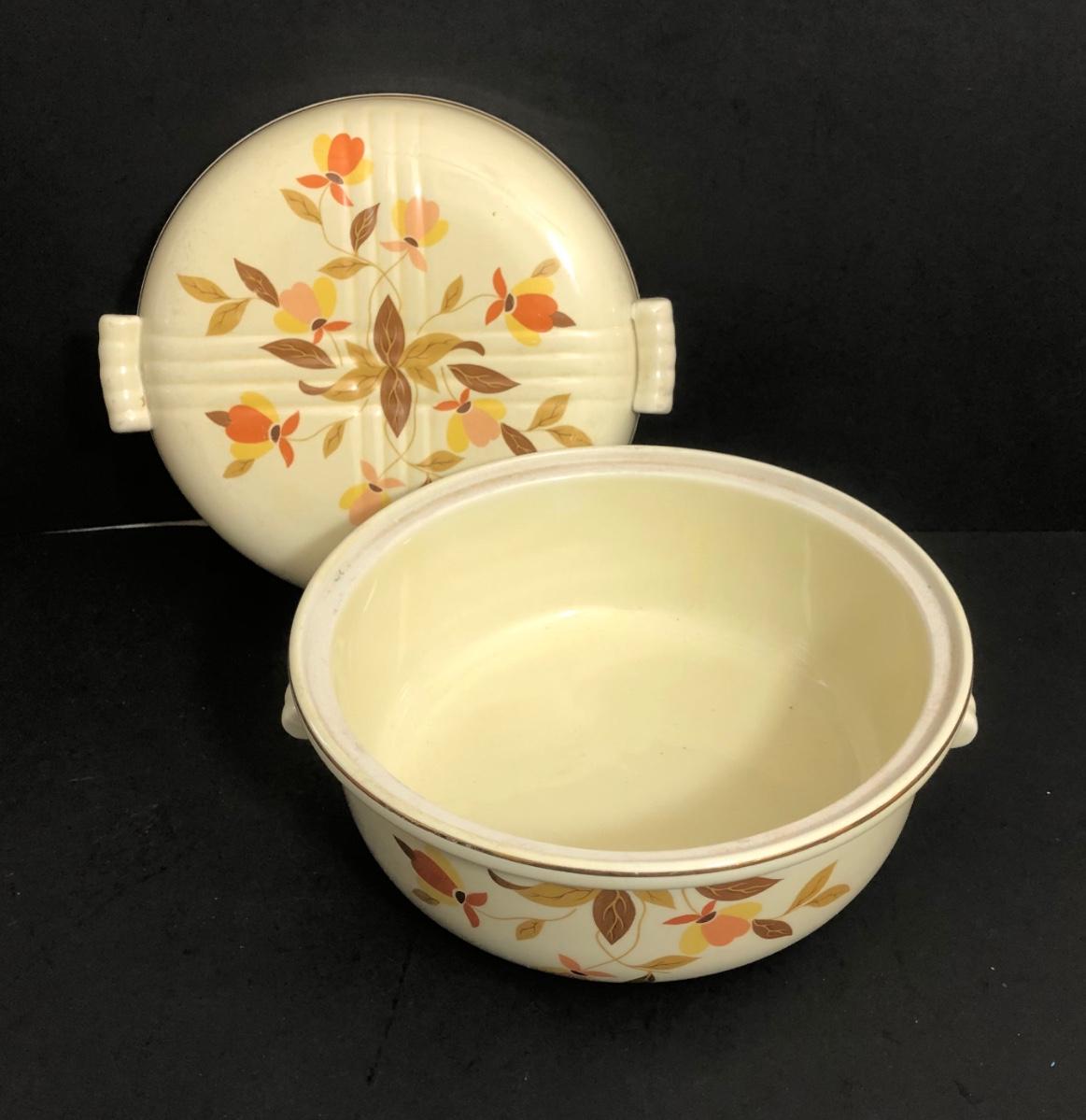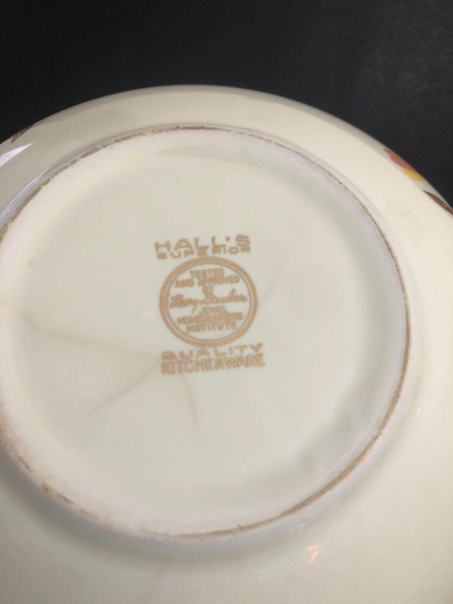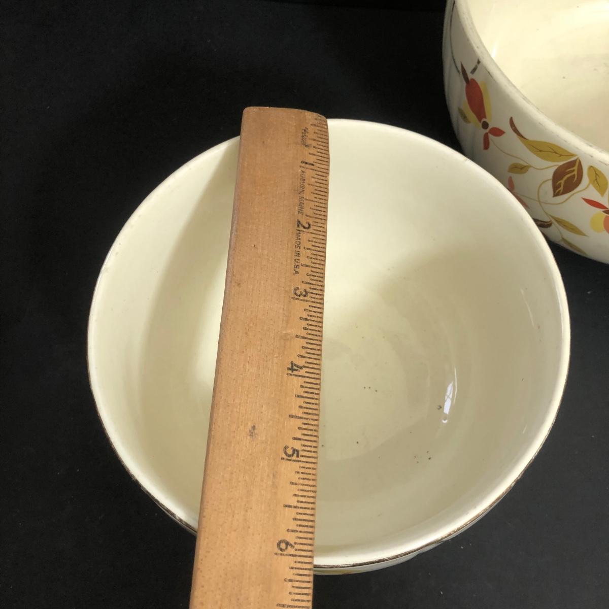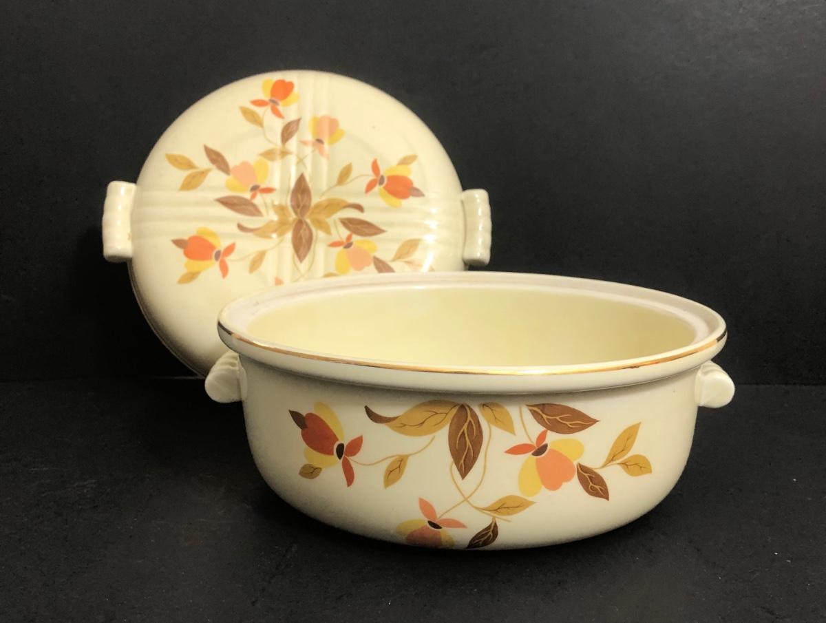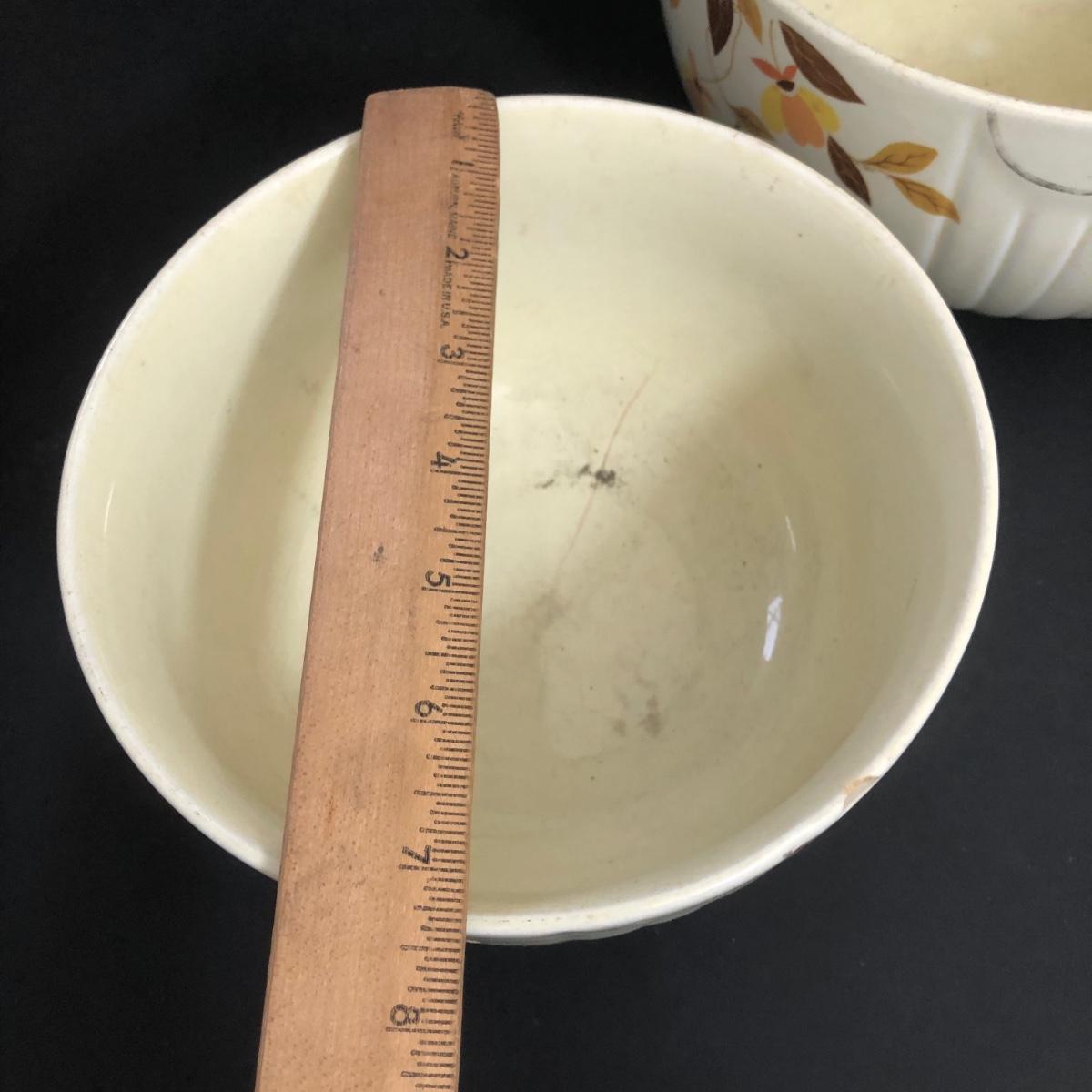 LOT 9A: Vintage Hall Jewel Tea Autumn Leaf Collection - Teapot w/ Strainer, Ball Pitcher, Bowls & Wooden Tray
