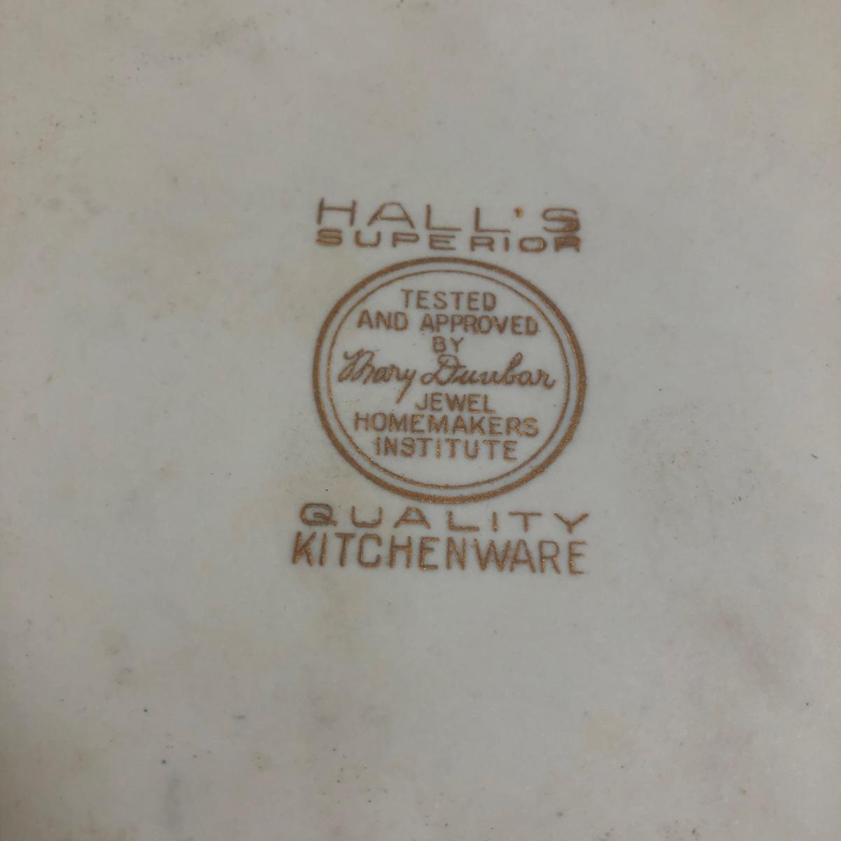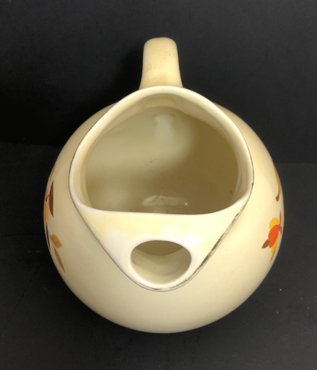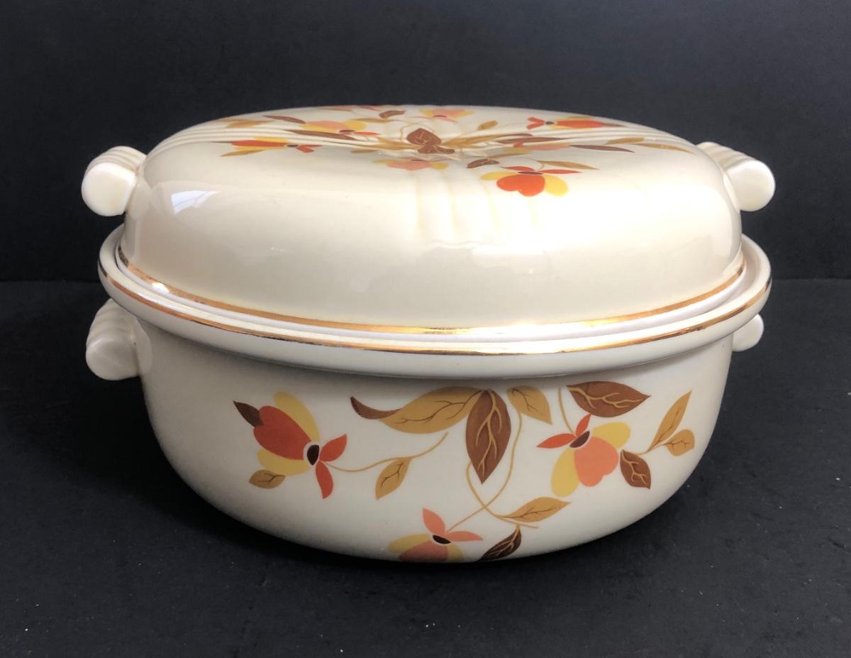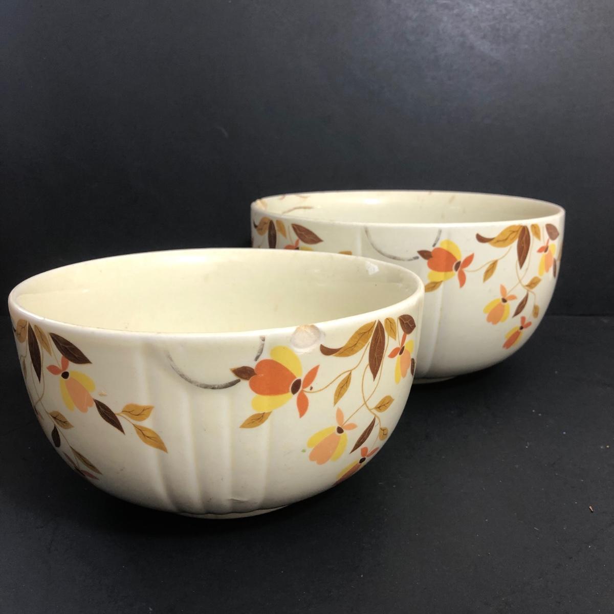 LOT 9A: Vintage Hall Jewel Tea Autumn Leaf Collection - Teapot w/ Strainer, Ball Pitcher, Bowls & Wooden Tray