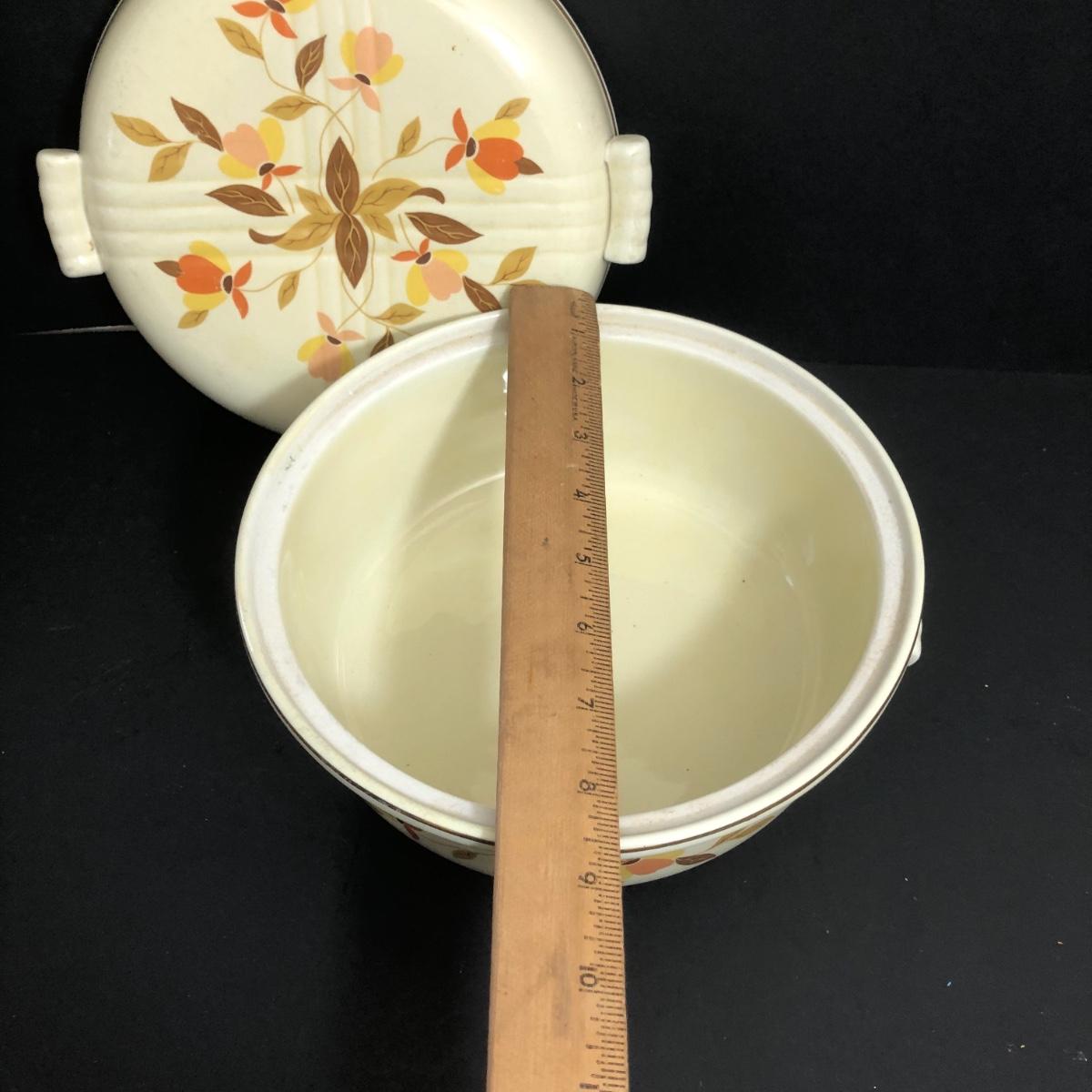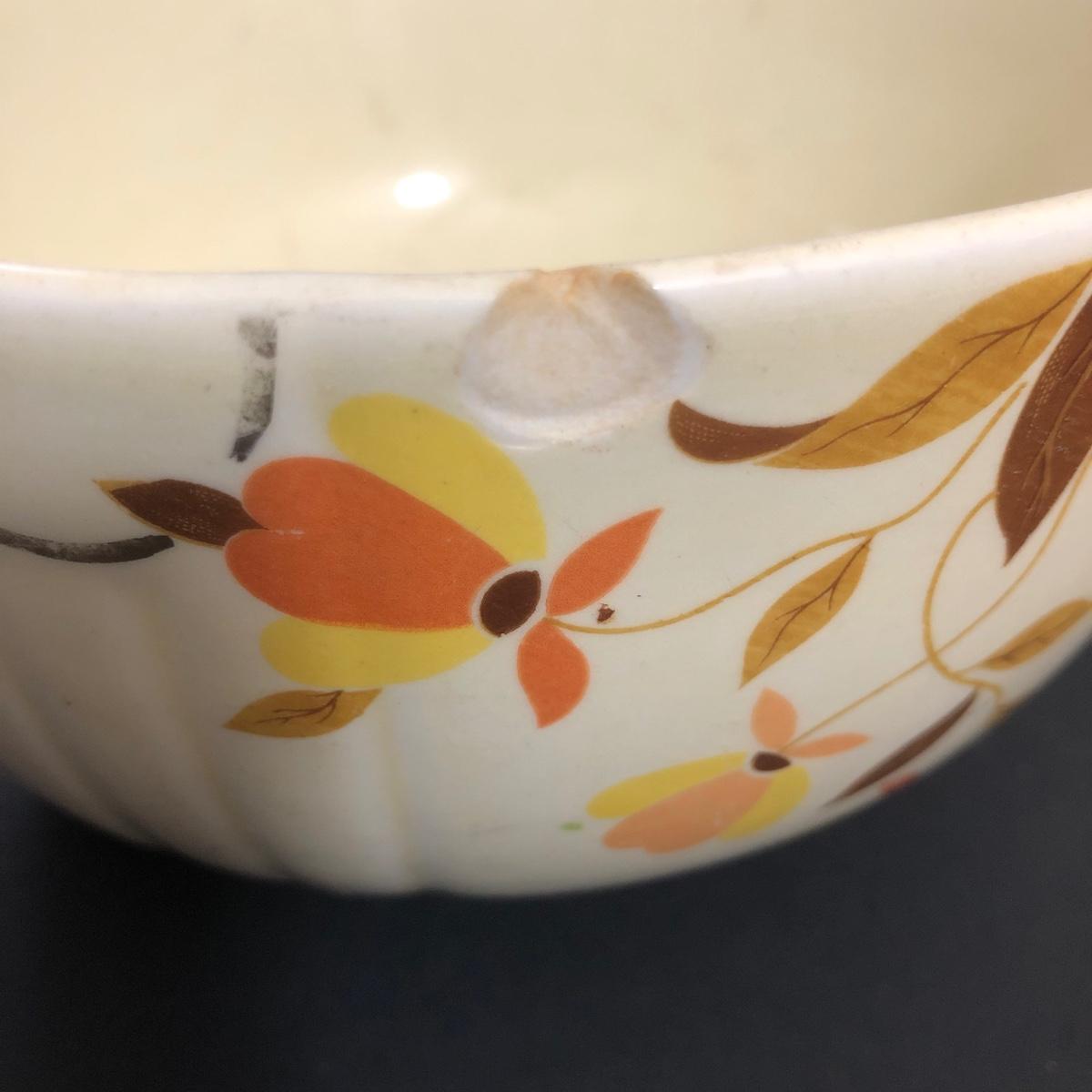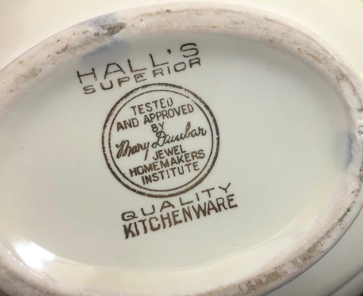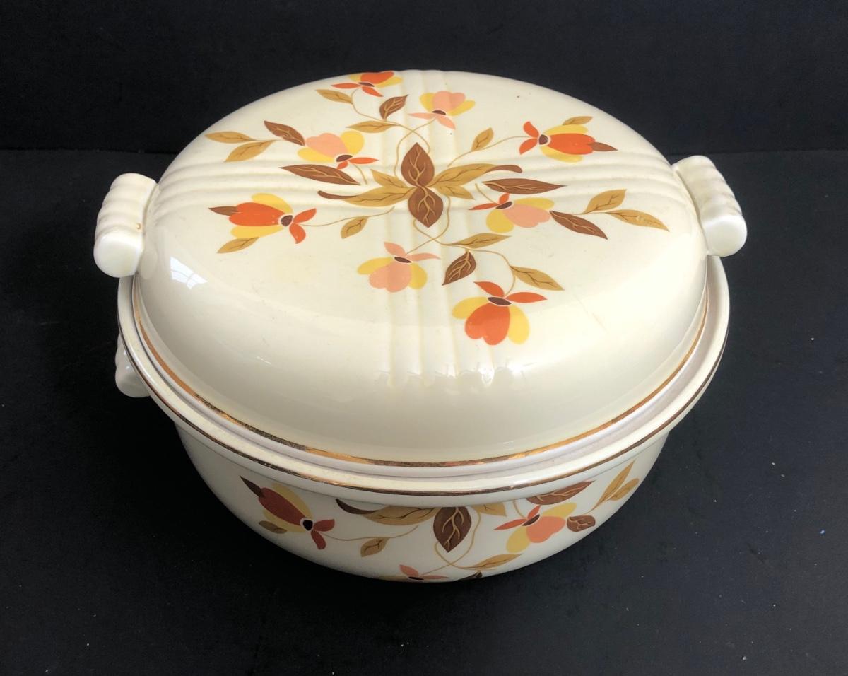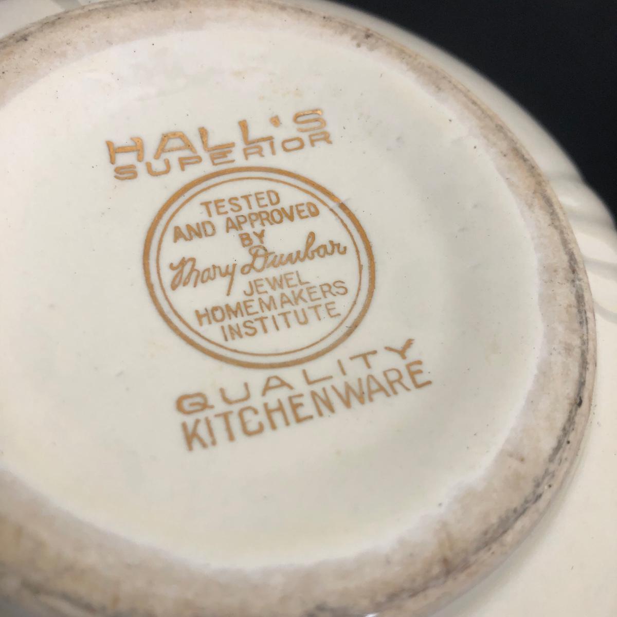 LOT 9A: Vintage Hall Jewel Tea Autumn Leaf Collection - Teapot w/ Strainer, Ball Pitcher, Bowls & Wooden Tray