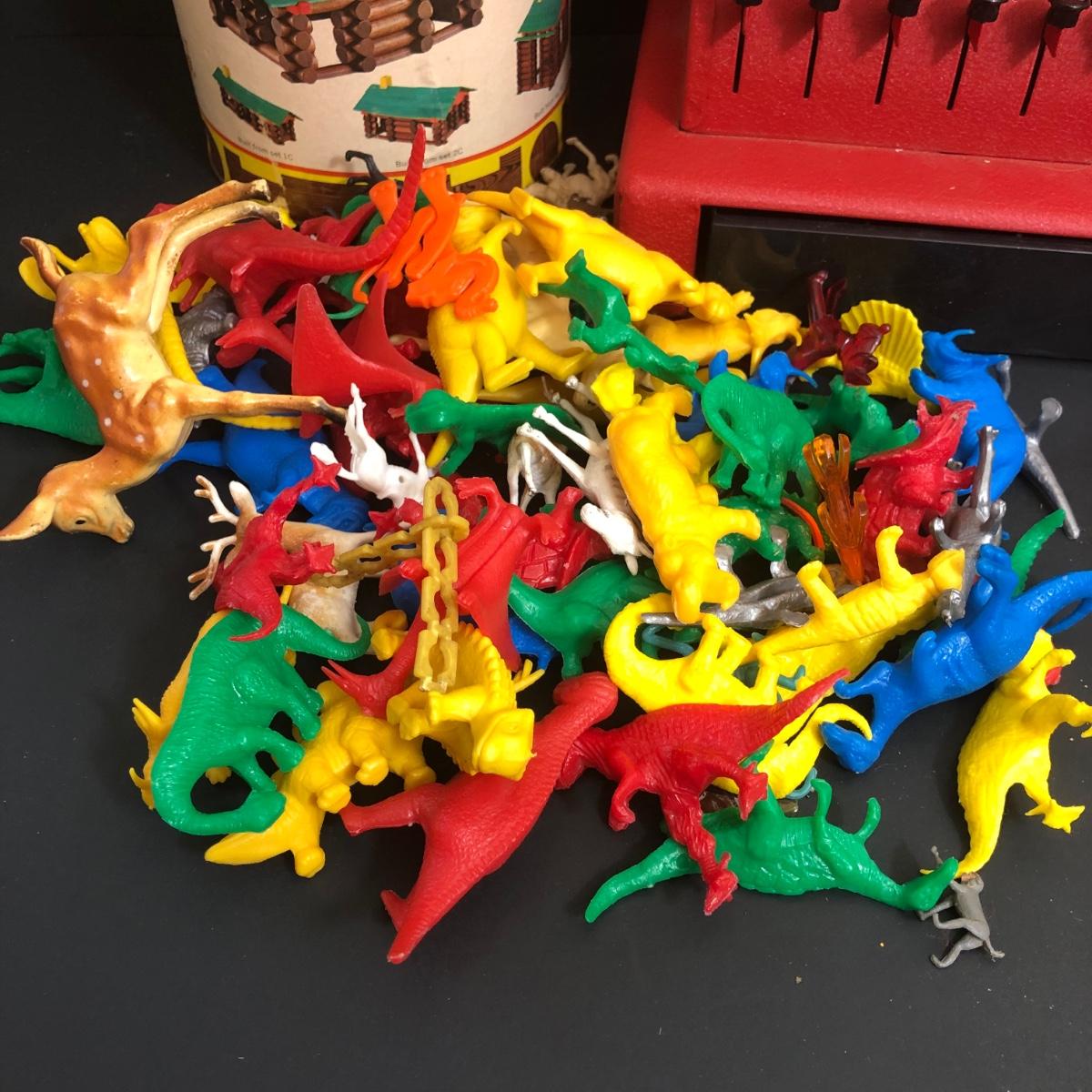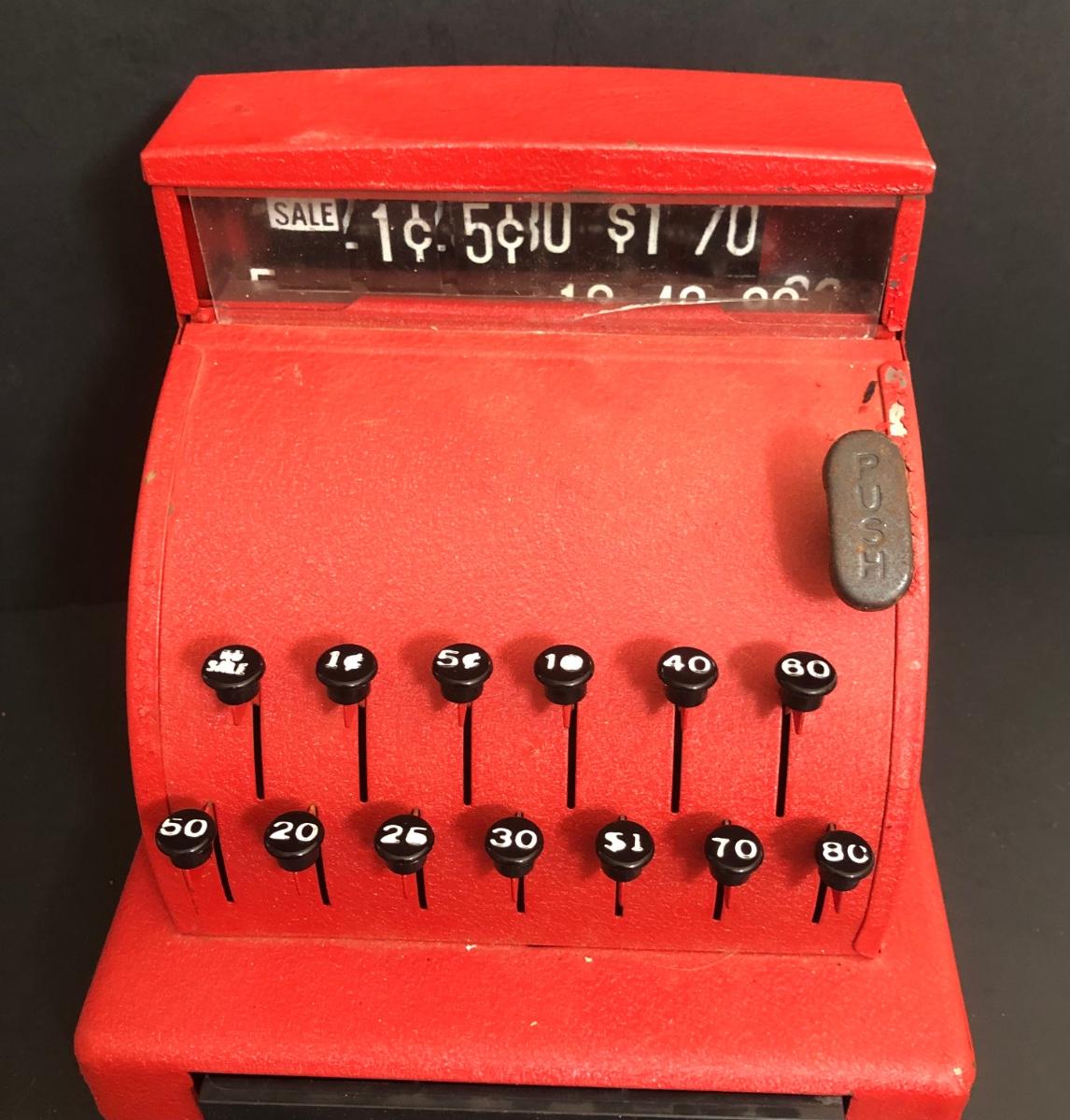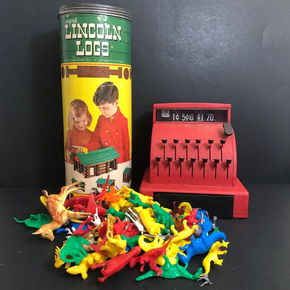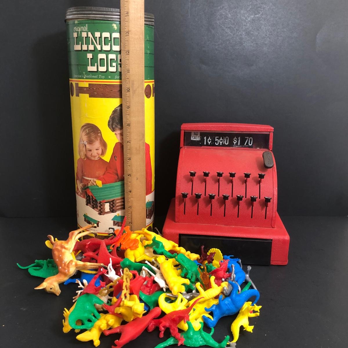 LOT 12A: Vintage Red Metal Cash Register, Vintage Lincoln Logs Tube w/ Wooden Pieces & Variety of Small Plastic Toys